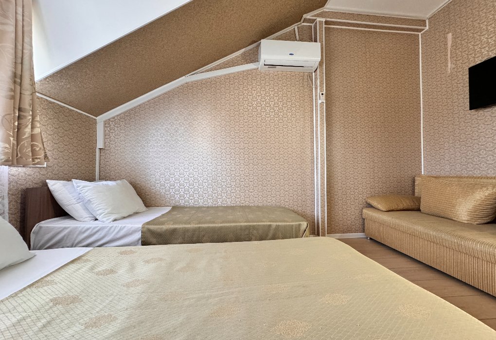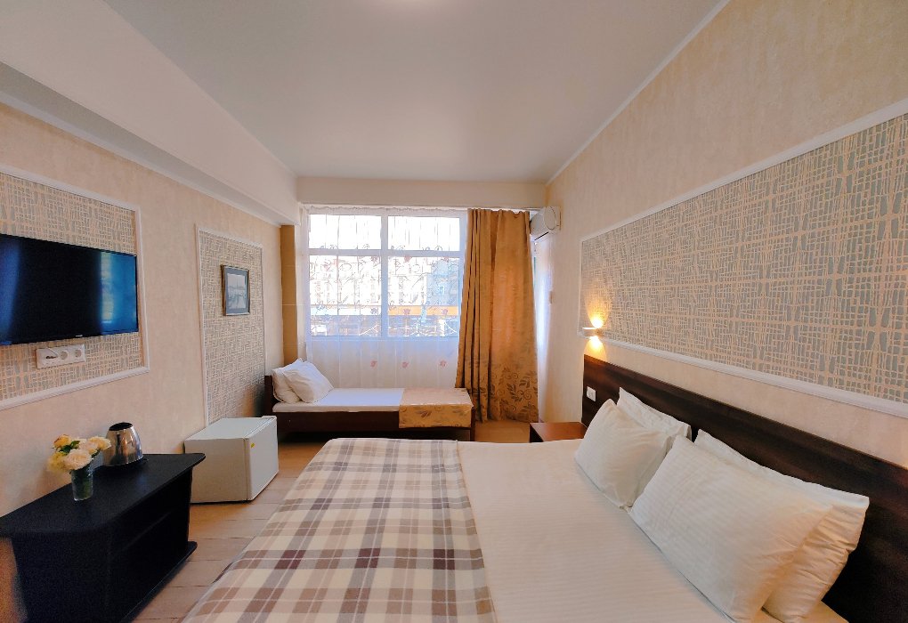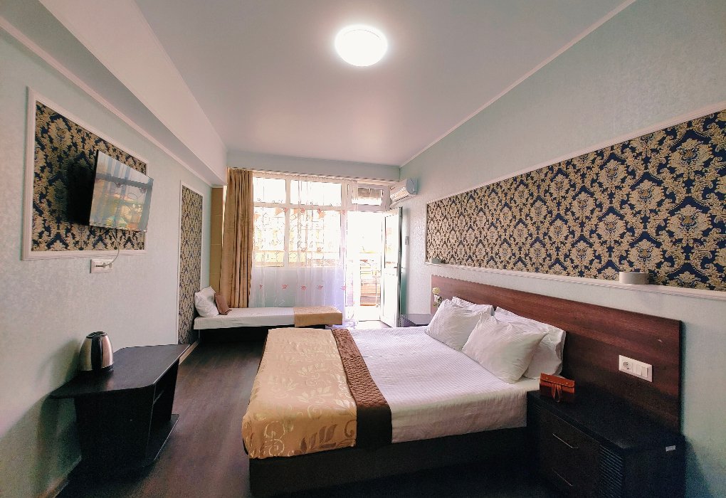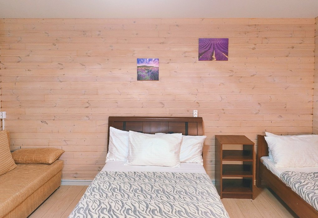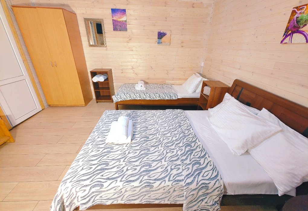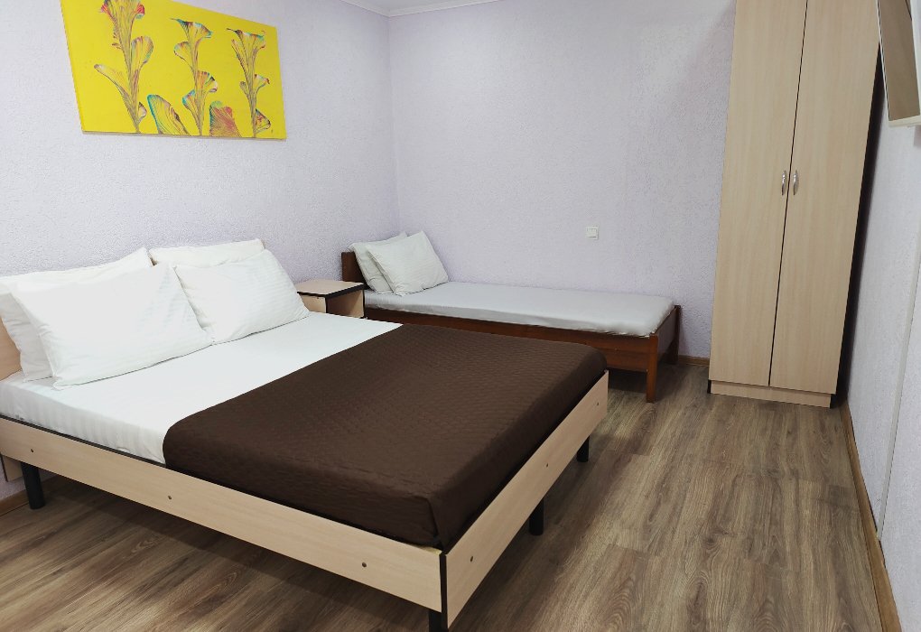 2-спальная кровать и 1-спальная кровать или 2-спальная кровать и 1-спальный диван, встроенный шкаф для одежды, тумбочки или журнальный столик, сплит система, мини холодильник, тв, чайник, кружки, набор одноразовой косметики (гель, шампунь, мыло).