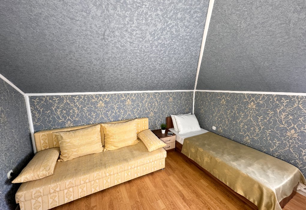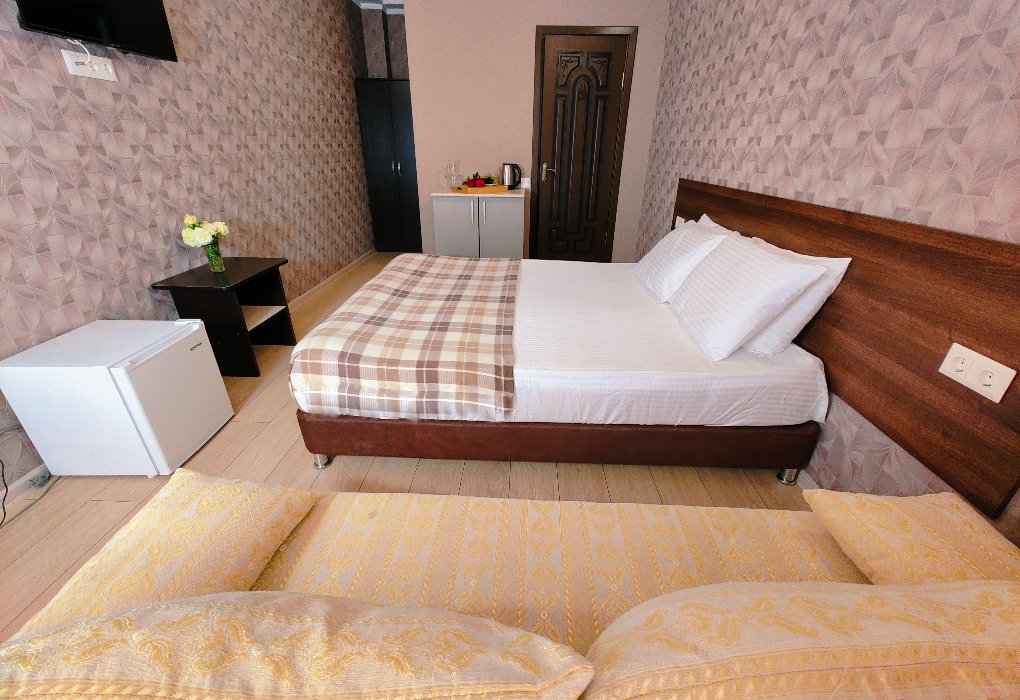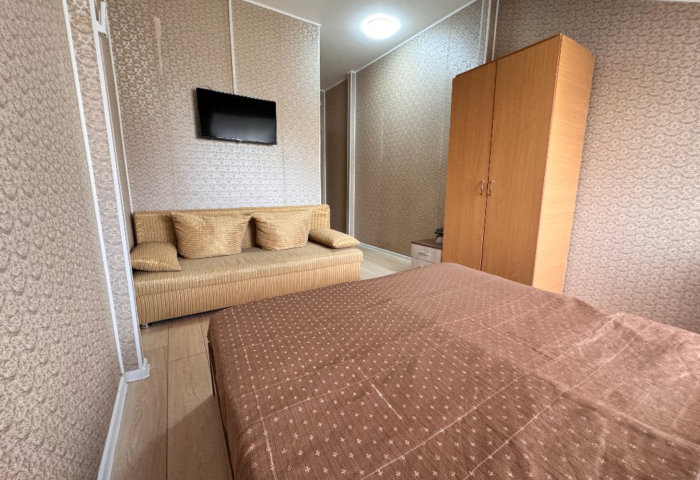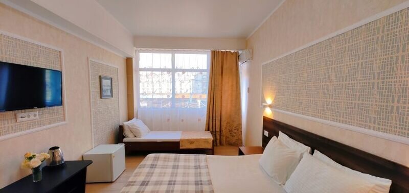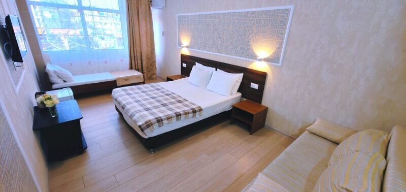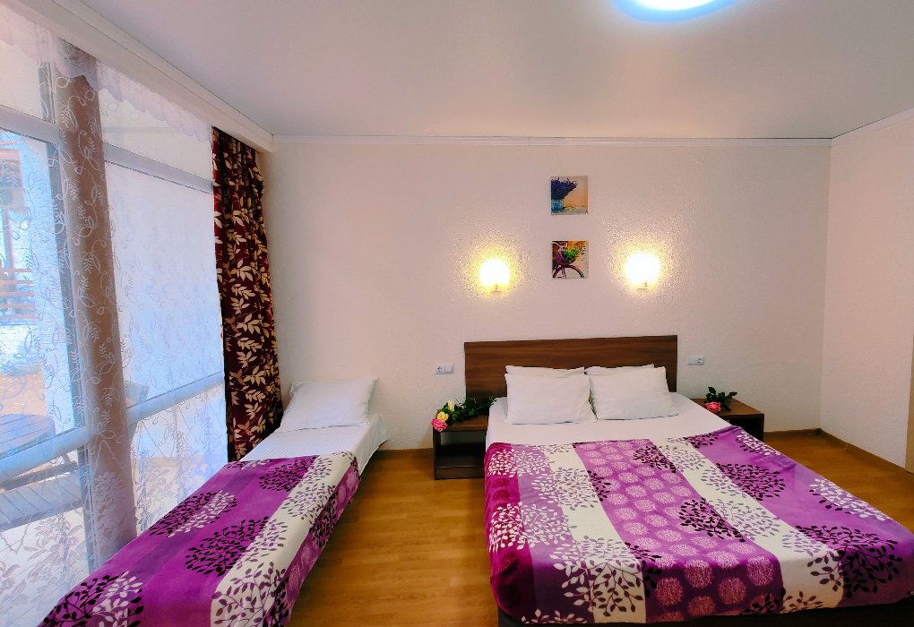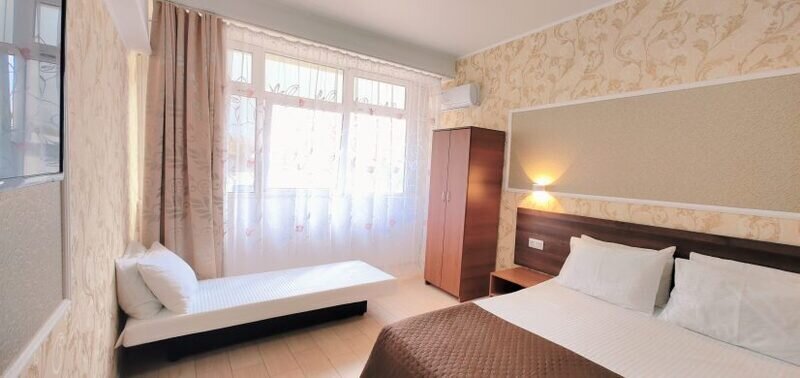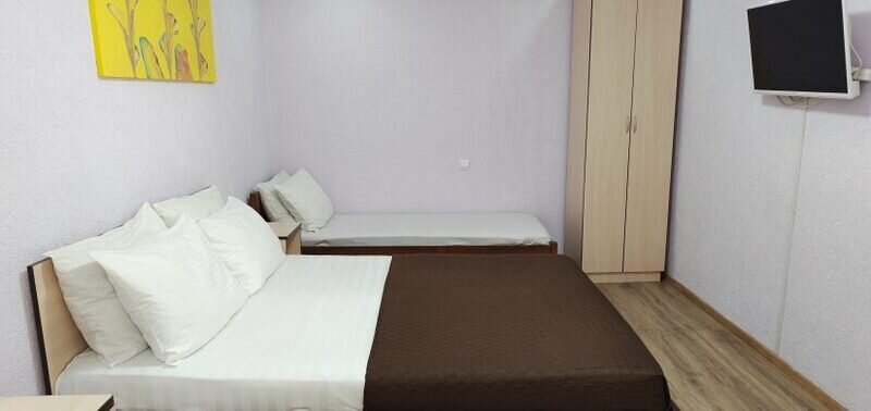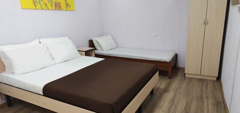 2-спальная кровать и 1-спальная кровать или 2-спальная кровать и 1-спальный диван, встроенный шкаф для одежды, тумбочки или журнальный столик, сплит система, мини холодильник, тв, чайник, кружки, набор одноразовой косметики (гель, шампунь, мыло).