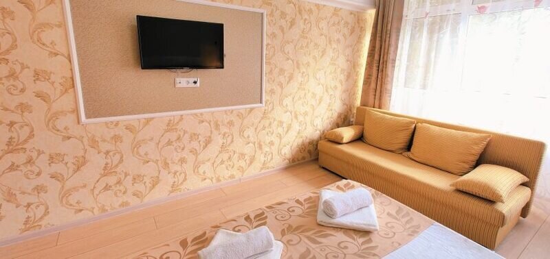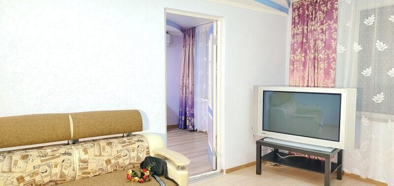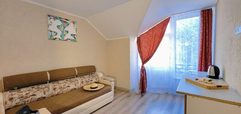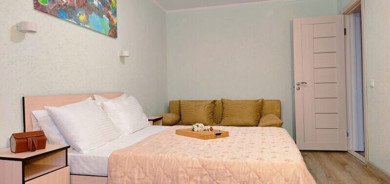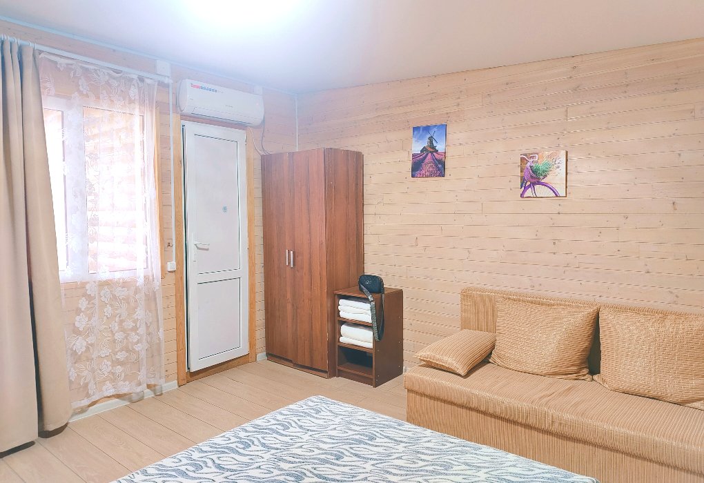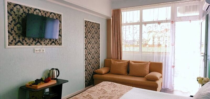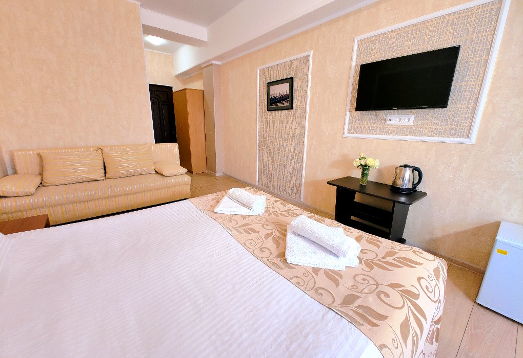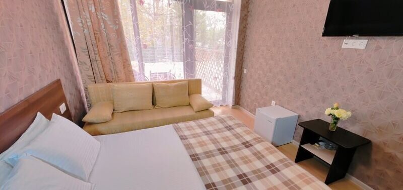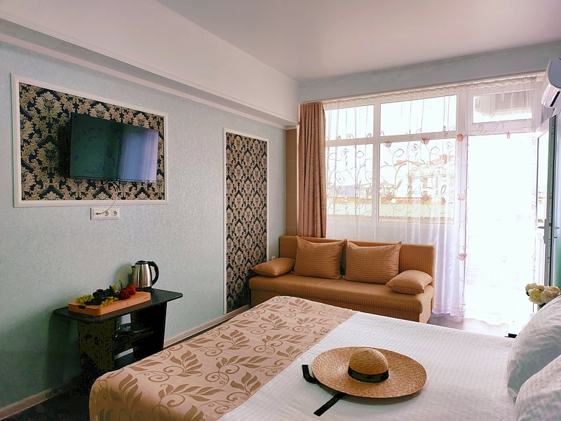 Двуспальная кровать, односпальный диван, тв, сплит-система, мини холодильник, шкаф для одежды, тумбочки, журнальный столик, стол, зеркало, чайник, кружки, летняя мебель, набор одноразовой косметики (гель, шампунь, мыло).