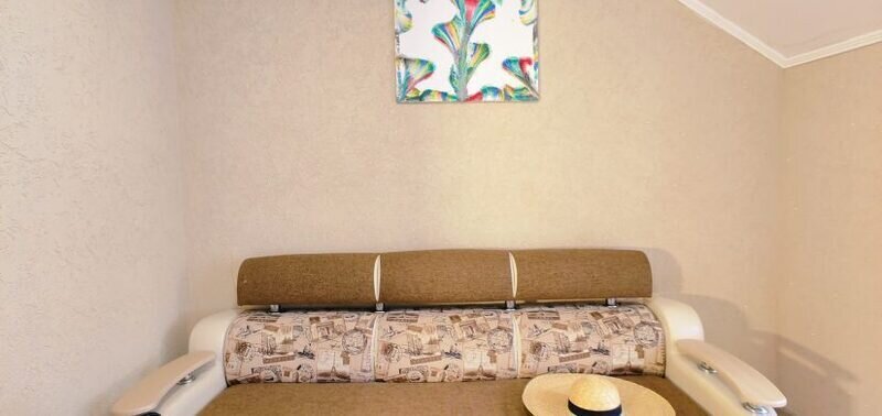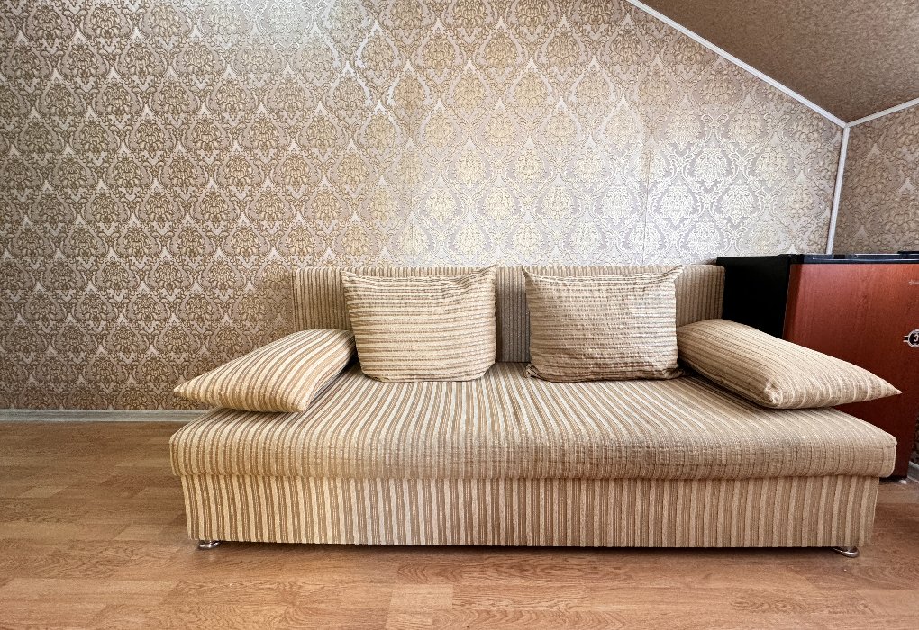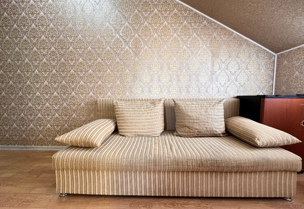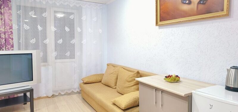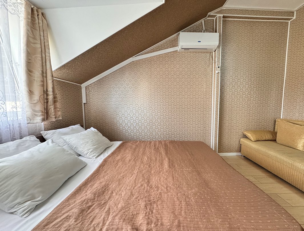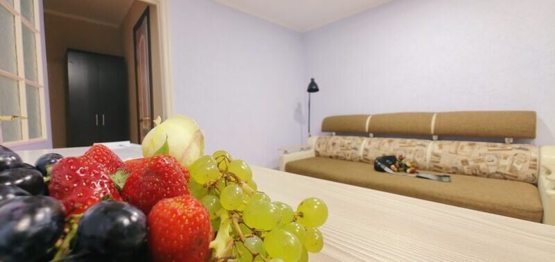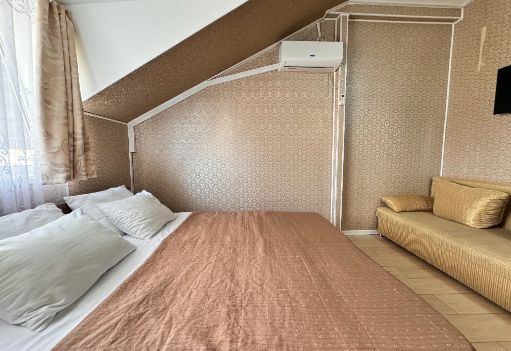 Двуспальная кровать, односпальный диван, тв, сплит-система, мини холодильник, шкаф для одежды, тумбочки, журнальный столик, стол, зеркало, чайник, кружки, летняя мебель, набор одноразовой косметики (гель, шампунь, мыло).