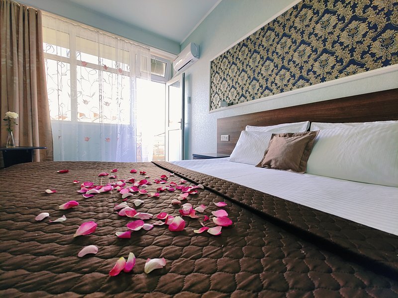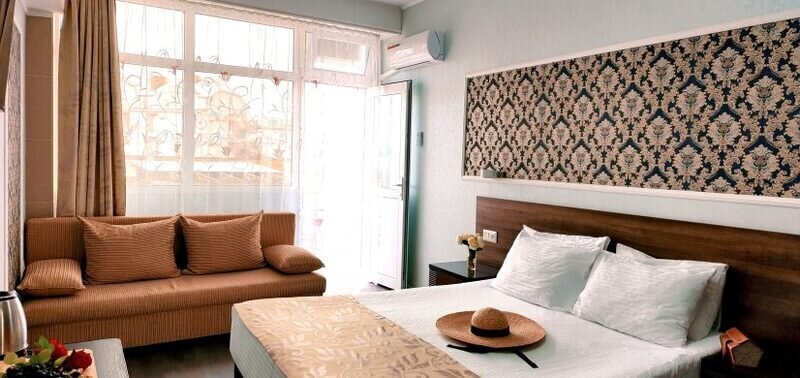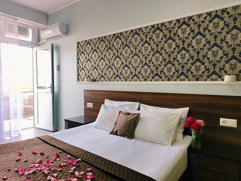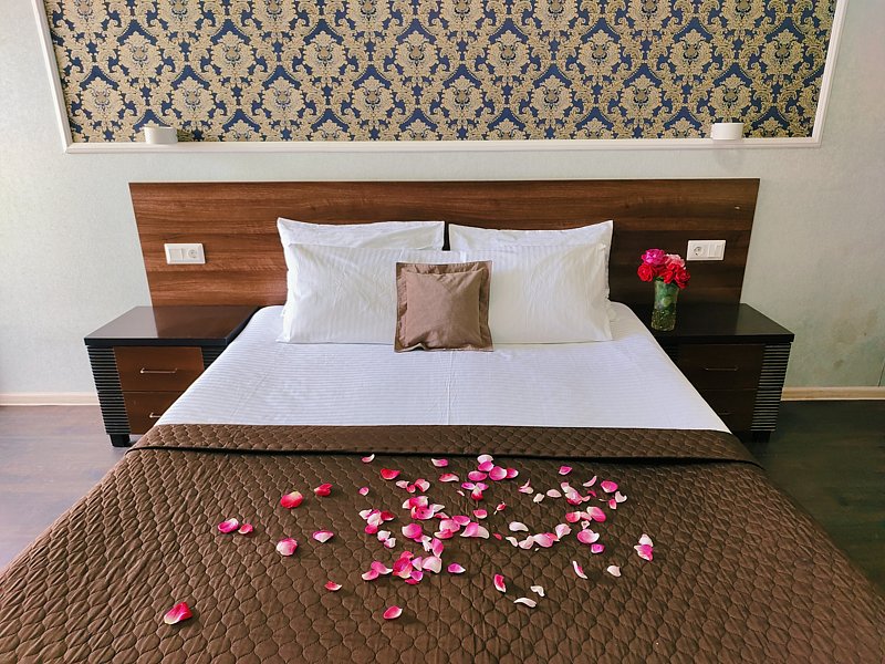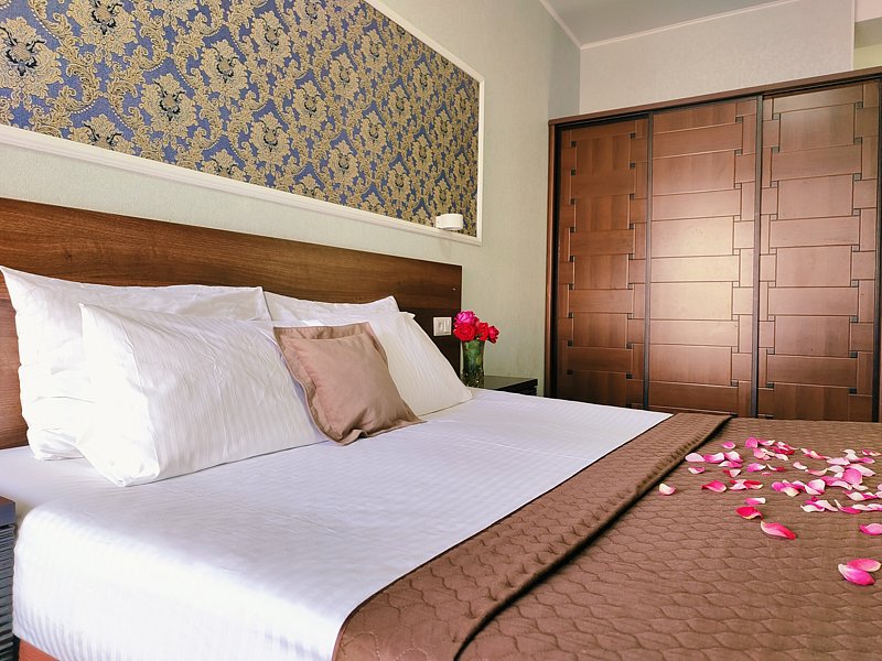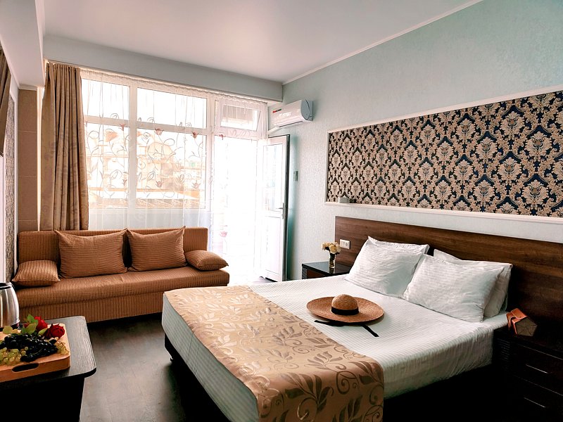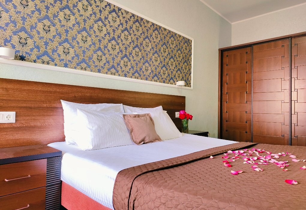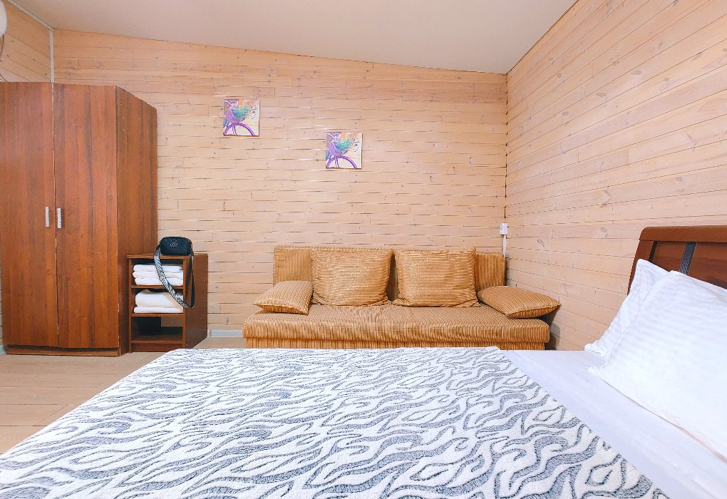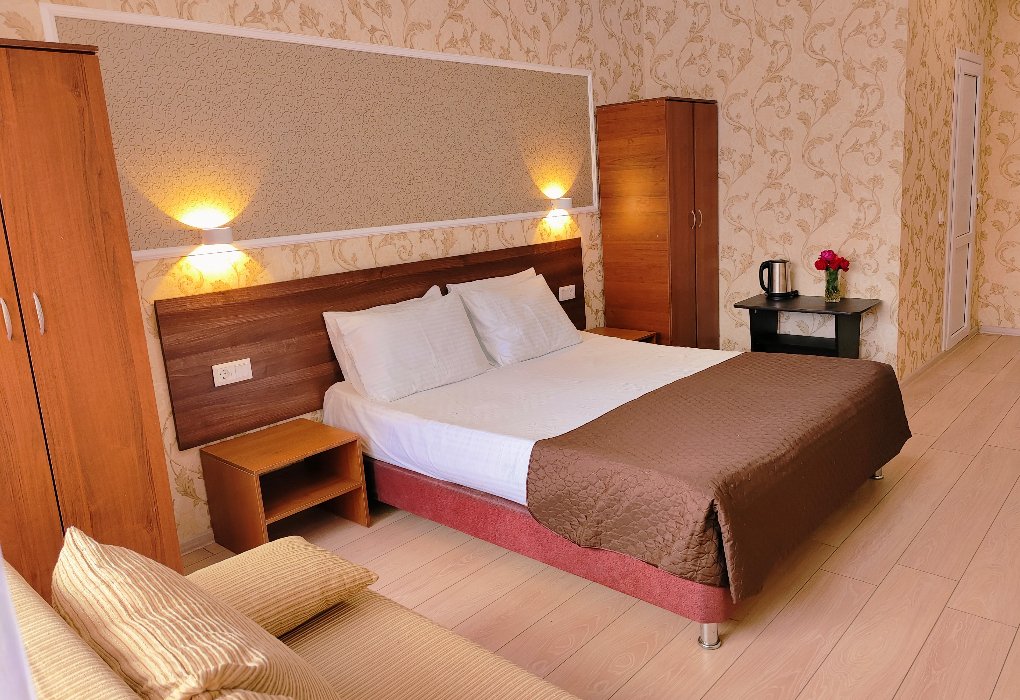 Двуспальная кровать + двуспальный диван, шкаф для одежды, тумбочки или журнальный столик, сплит-система, мини холодильник, тв, чайник, кружки, набор одноразовой косметики (гель, шампунь, мыло).