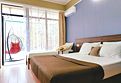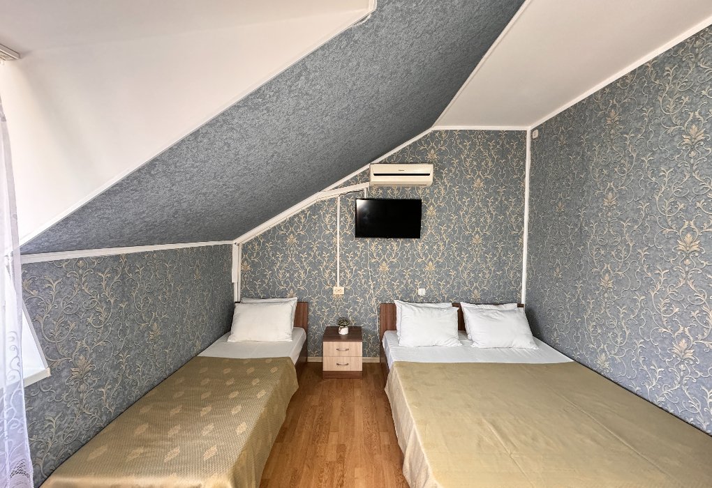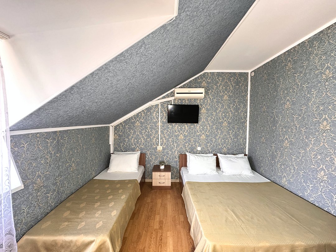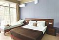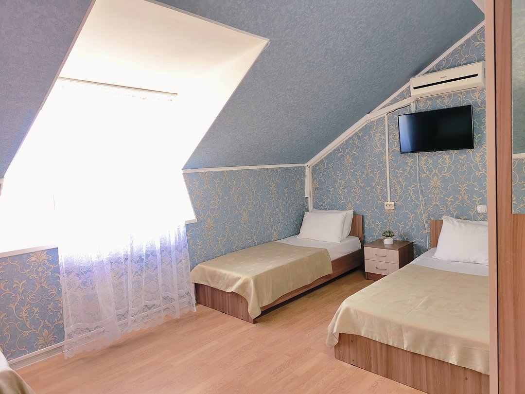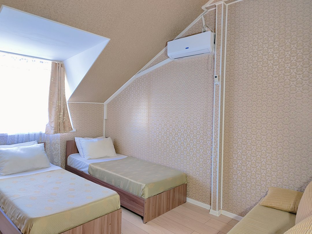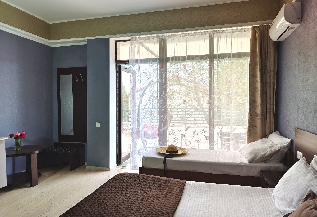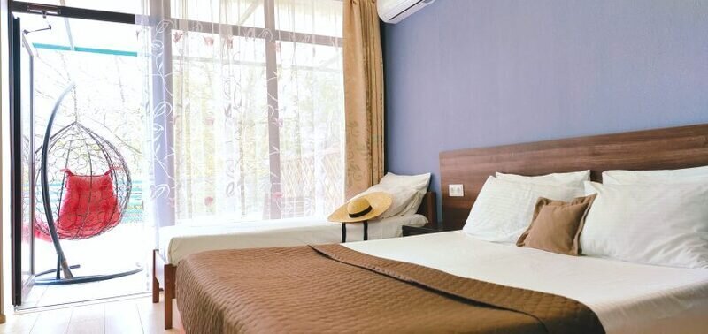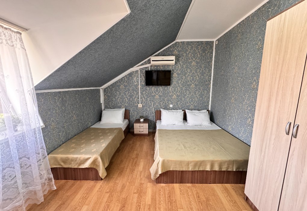 Двуспальная кровать + односпальная кровать или три односпальные кровати, шкаф для одежды, тумбочки или журнальный столик, сплит система, мини холодильник, тв, чайник, кружки, набор одноразовой косметики (гель, шампунь, мыло), летняя мебель