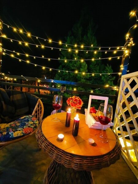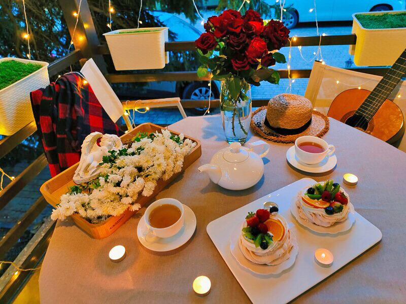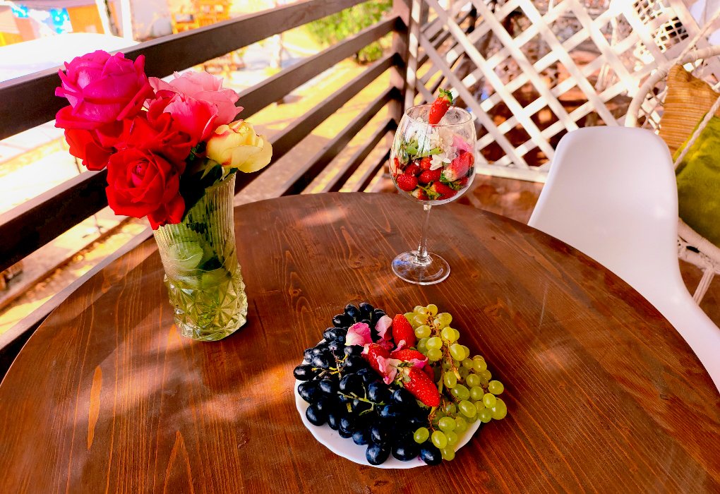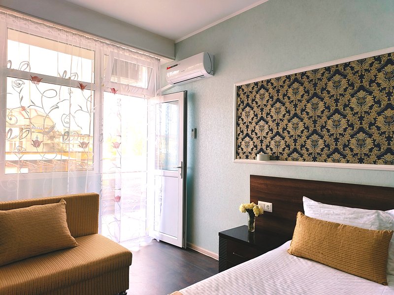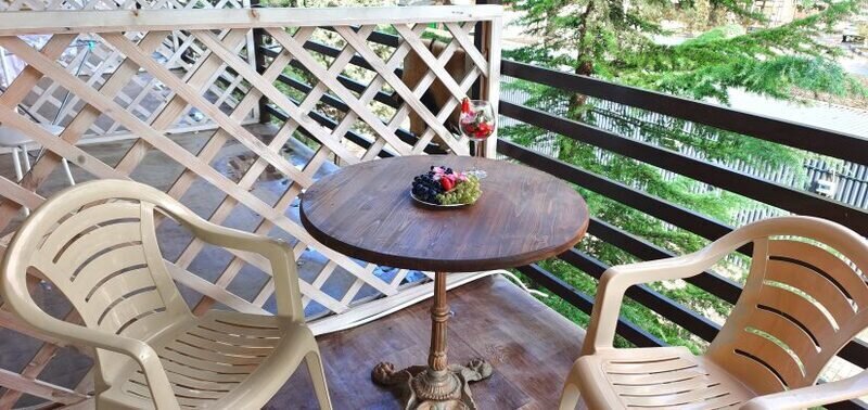 Двуспальная кровать, шкаф для одежды, тумбочки или журнальный столик, сплит система, мини холодильник, тв, чайник, кружки, набор одноразовой косметики (гель, шампунь, мыло). Балкон с летней мебелью
