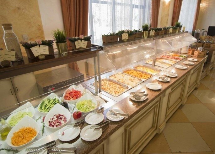 Работа по тарифу Все включено (шведский стол) — завтрак, обед, ужин, два перекуса; алкоголь — пиво, вино в часы обеда и ужина, безалкогольные напитки.