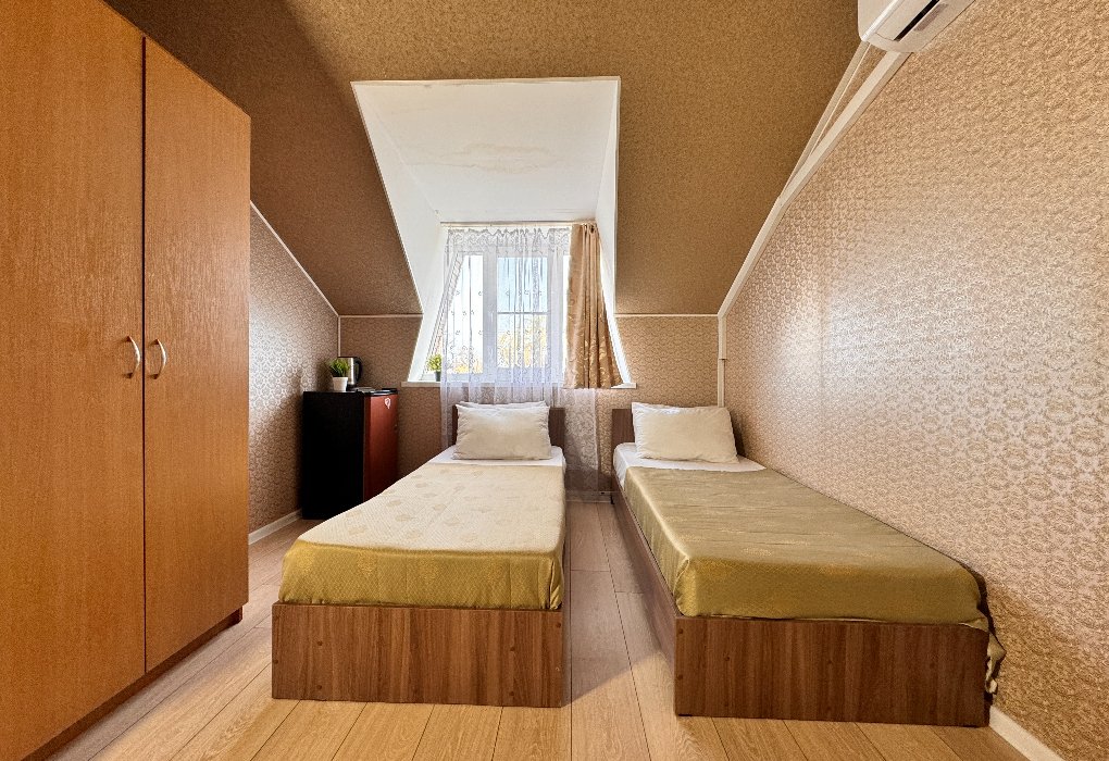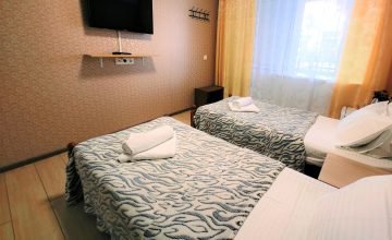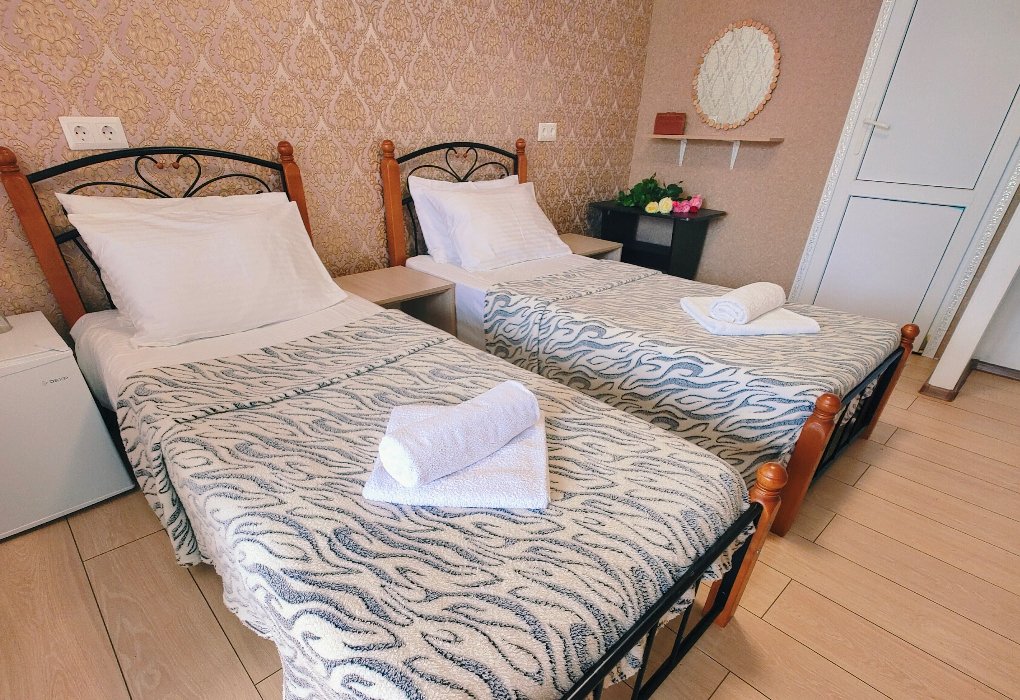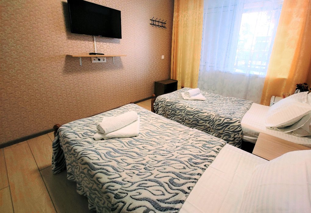 2-х спальная кровать или две 1-спальные кровати, встроенный шкаф для одежды, тумбочки или журнальный столик, сплит система, мини холодильник, тв, чайник, кружки, набор одноразовой косметики (гель, шампунь, мыло).