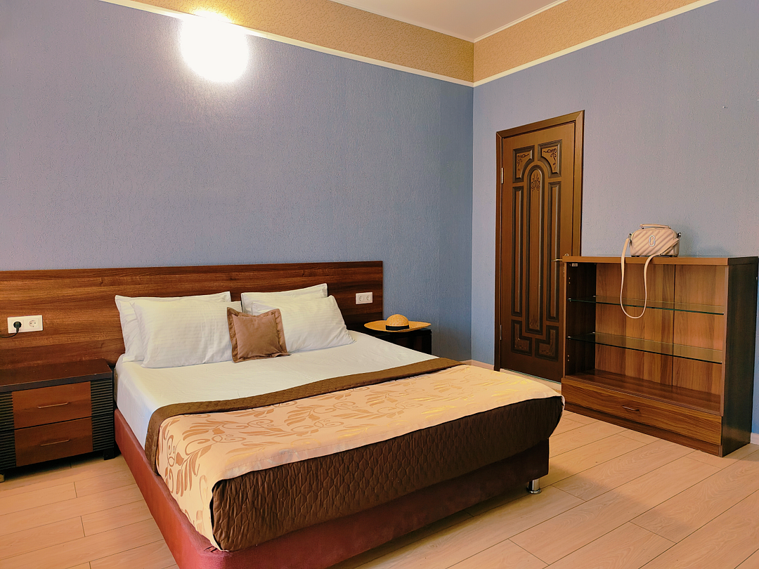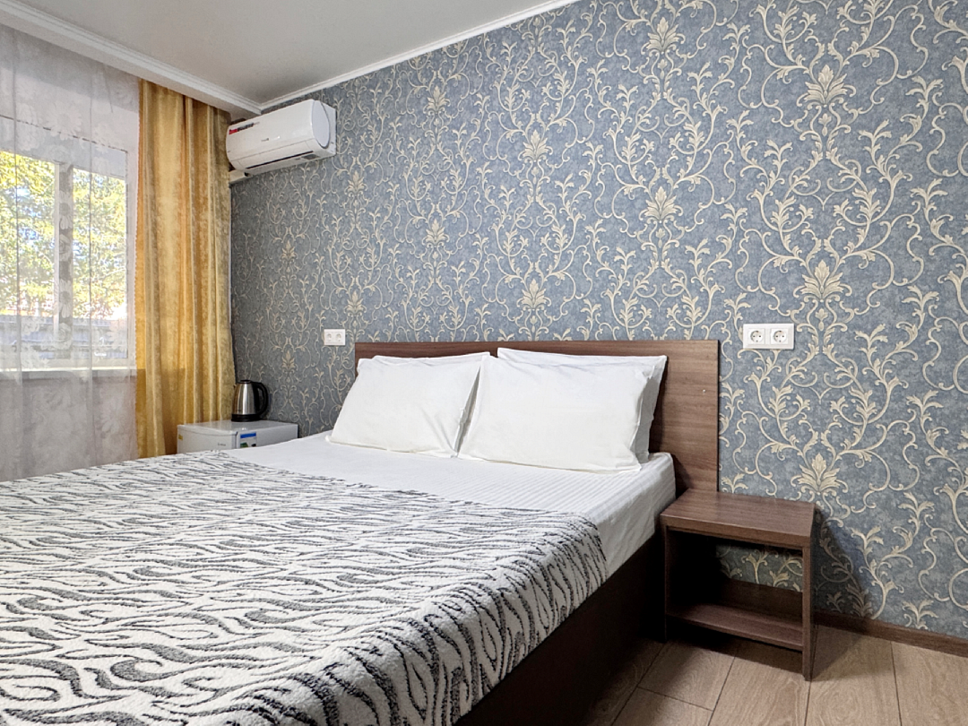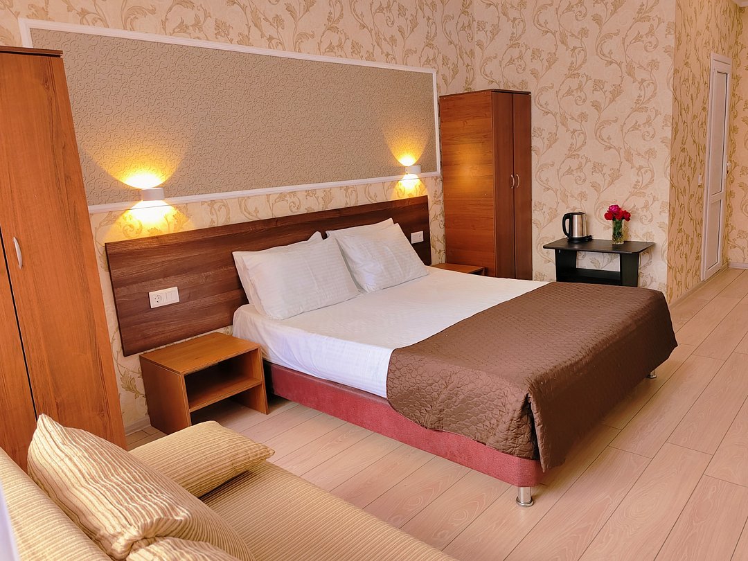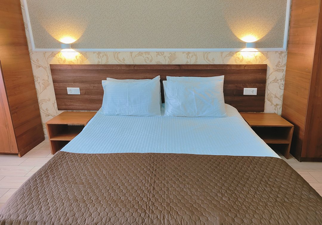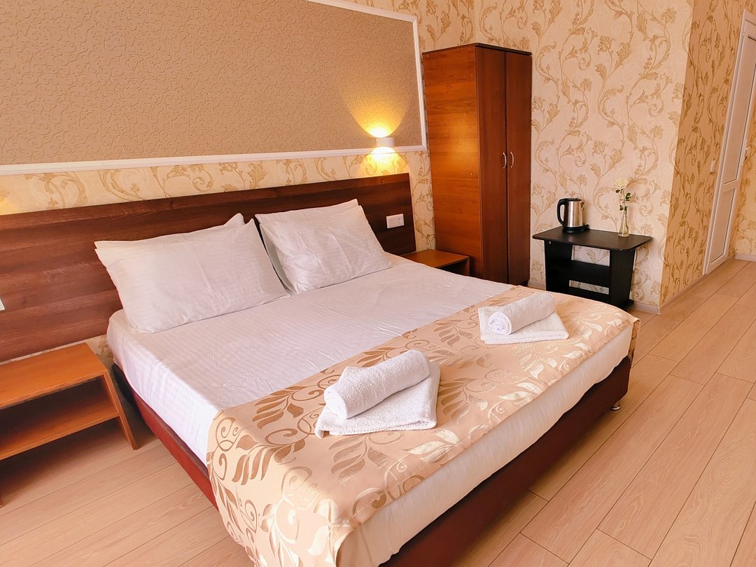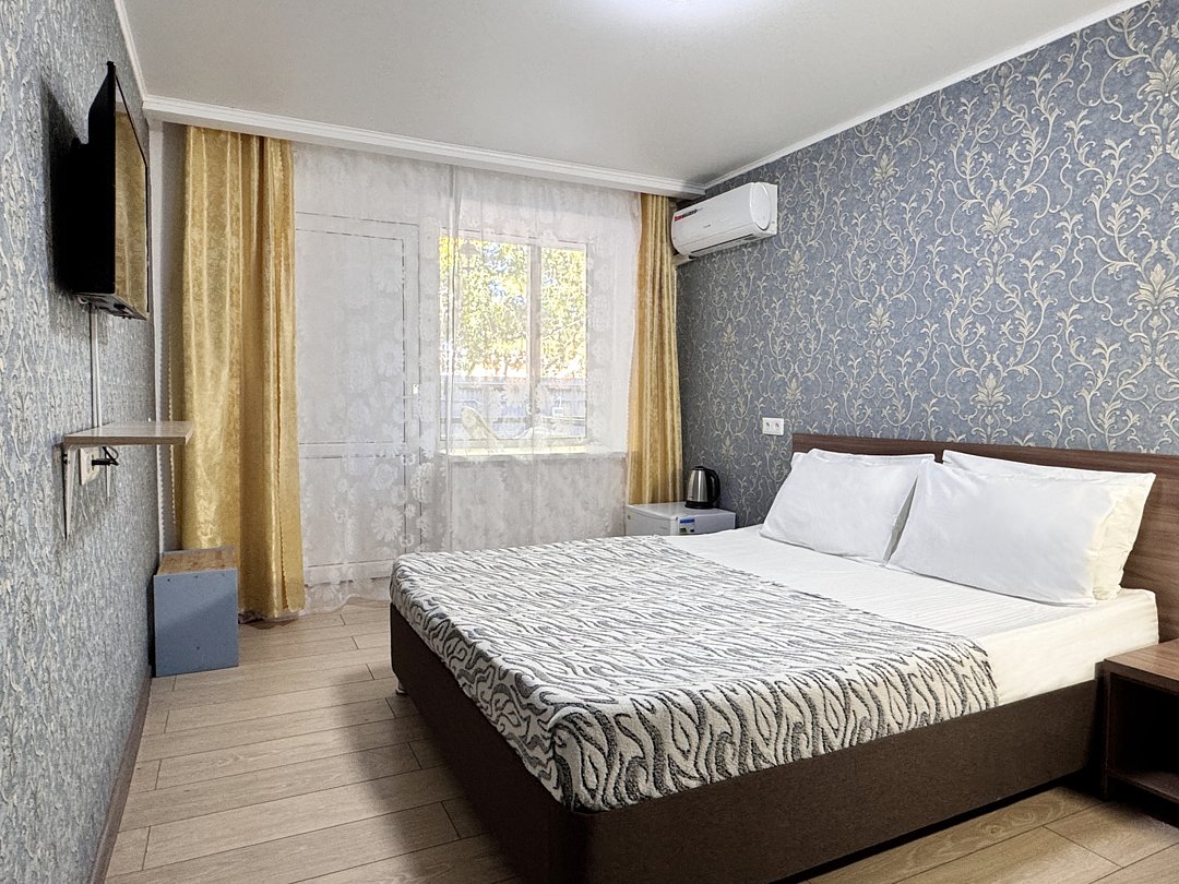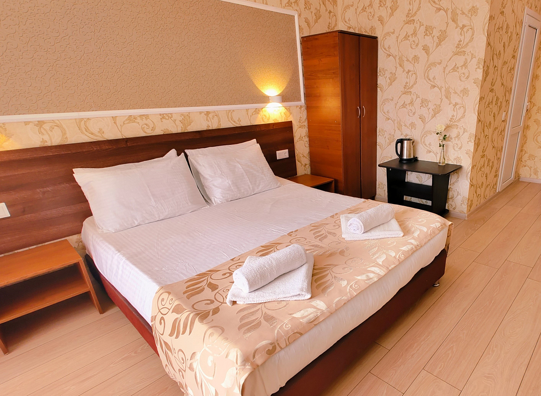 В номере: двуспальная кровать, прикроватные тумбочки,журнальный столик, комод, шкаф,вешалки,зеркало, телевизор, кондиционер, мини-холодильник, электрочайник, набор посуды. Ванная комната: душ, раковина, зеркало, фен, туалет, сушилка для одежды. Зона отдыха перед входом в номер. (Проживание с животными запрещено)В гостиничном номере