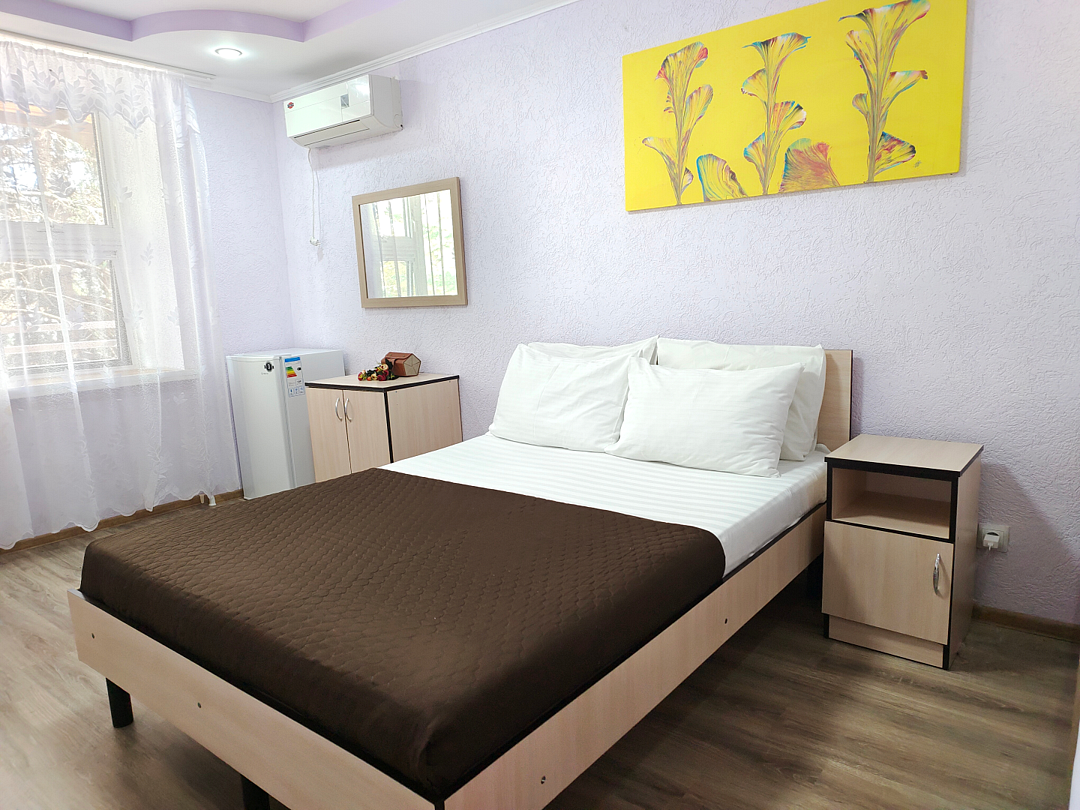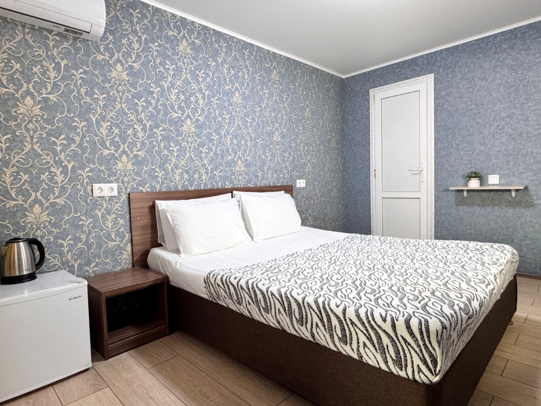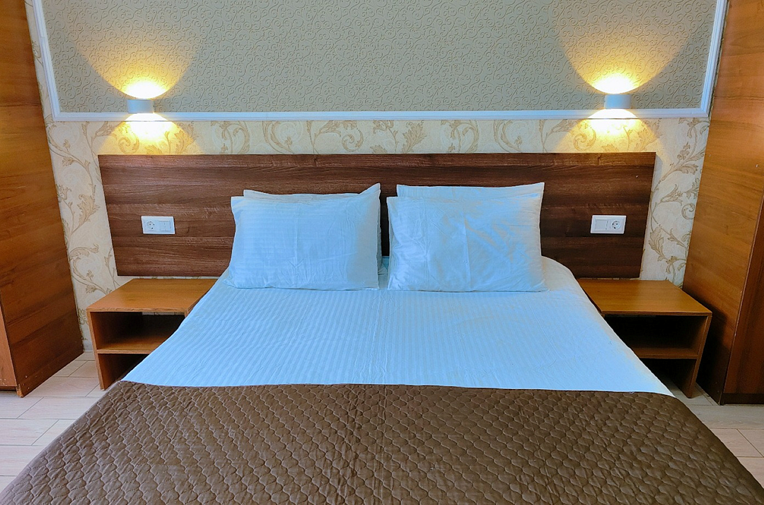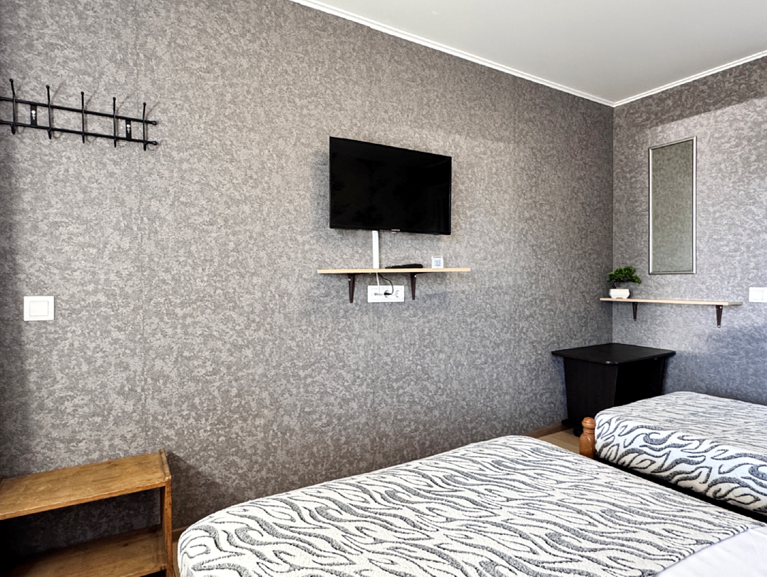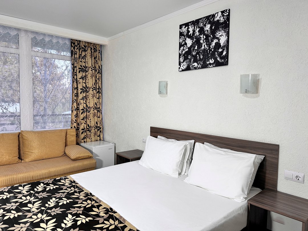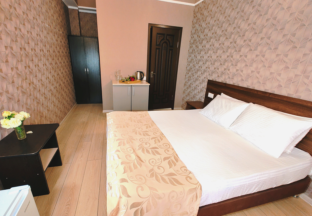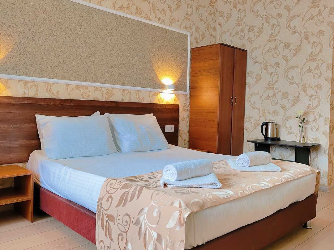 В номере: двуспальная кровать, прикроватные тумбочки,журнальный столик, комод, шкаф,вешалки,зеркало, телевизор, кондиционер, мини-холодильник, электрочайник, набор посуды. Ванная комната: душ, раковина, зеркало, фен, туалет, сушилка для одежды. Зона отдыха перед входом в номер. (Проживание с животными запрещено)В гостиничном номере