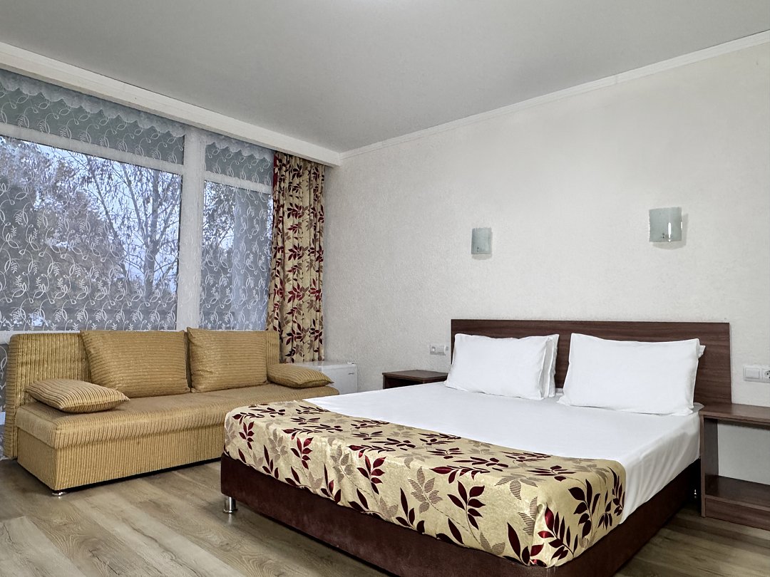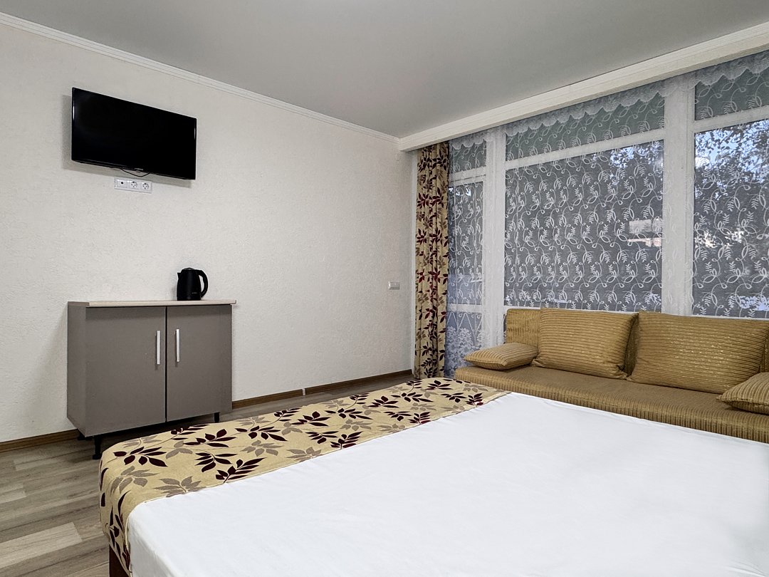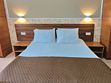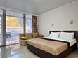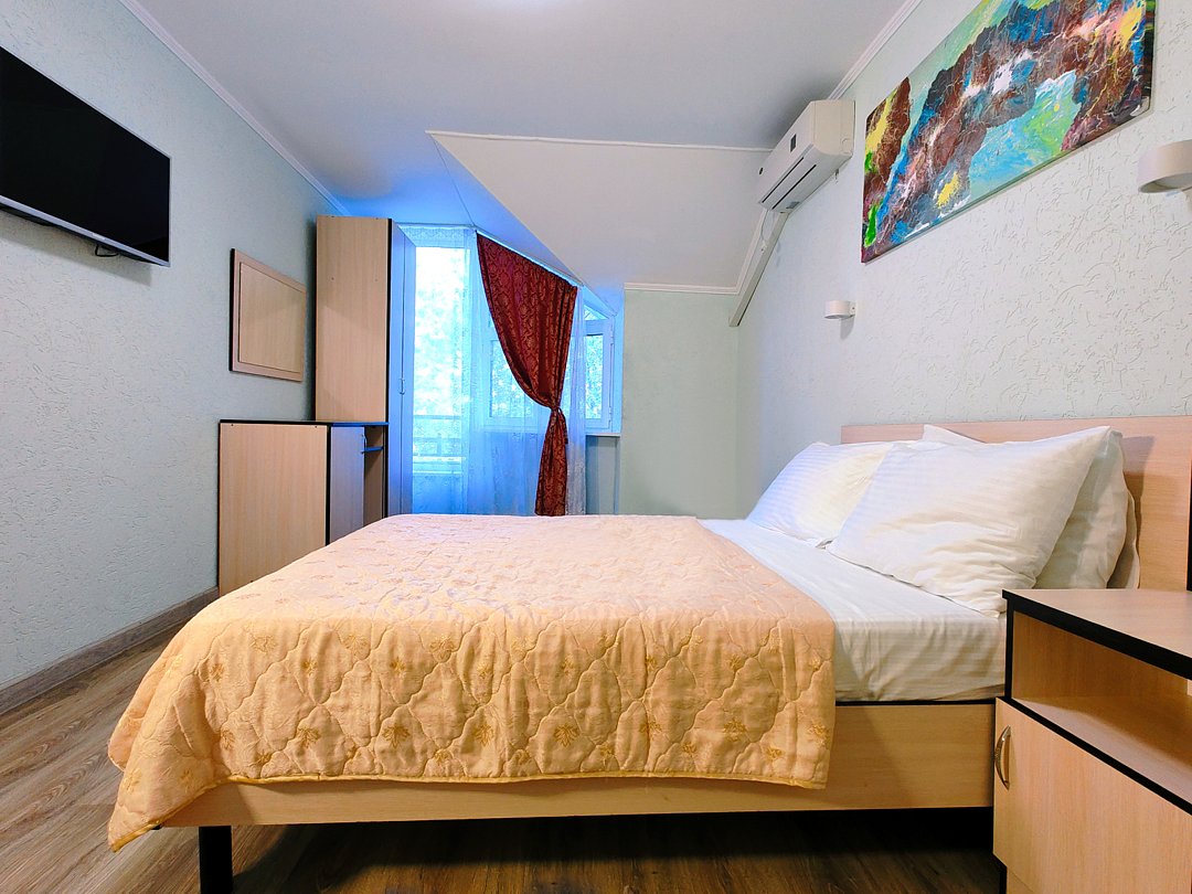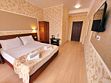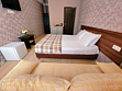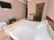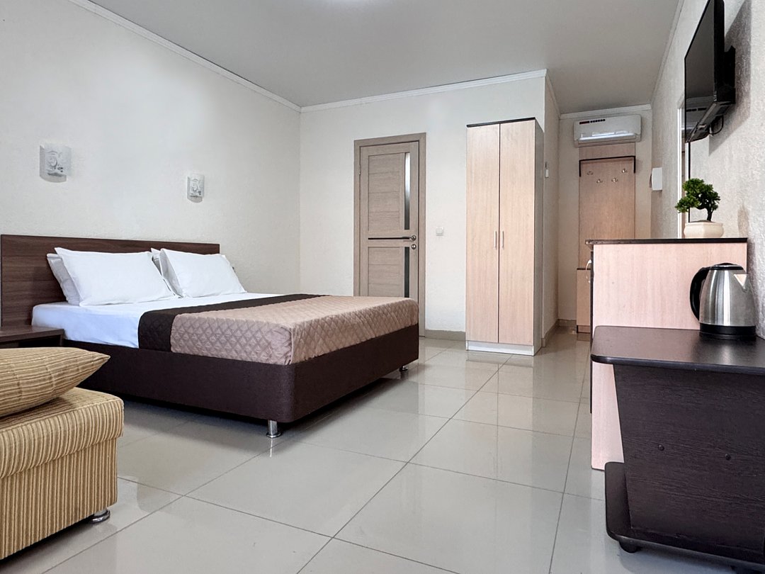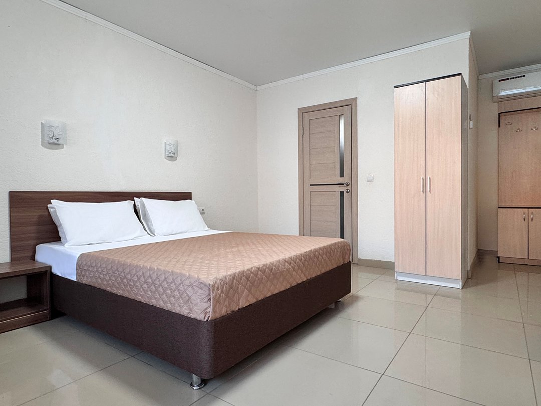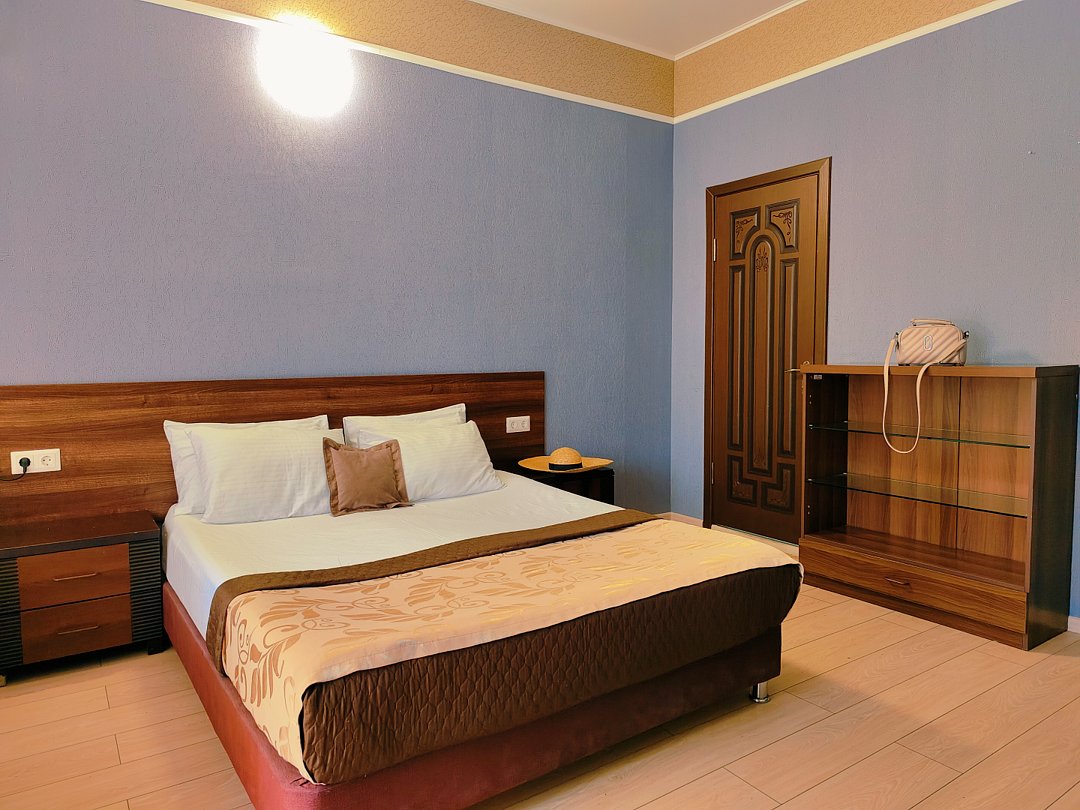 В номере: двуспальная кровать, прикроватные тумбочки,журнальный столик, комод, шкаф,вешалки,зеркало, телевизор, кондиционер, мини-холодильник, электрочайник, набор посуды. Ванная комната: душ, раковина, зеркало, фен, туалет, сушилка для одежды. Зона отдыха перед входом в номер. (Проживание с животными запрещено)В гостиничном номере