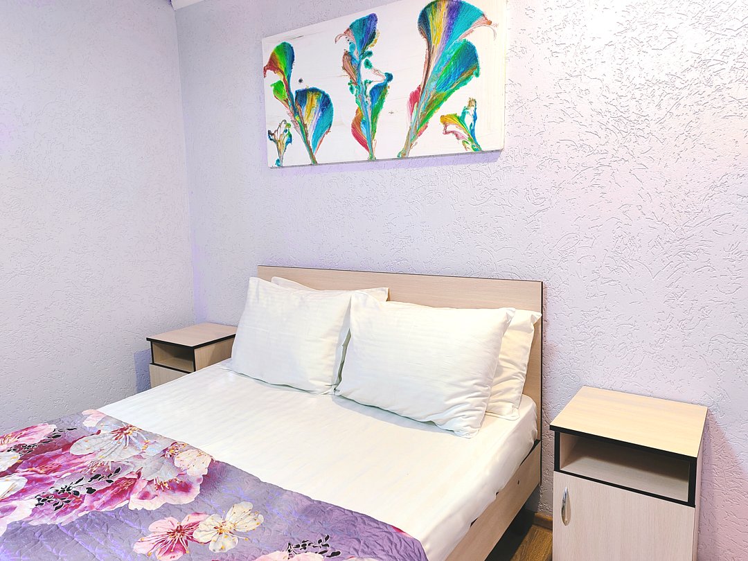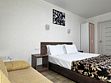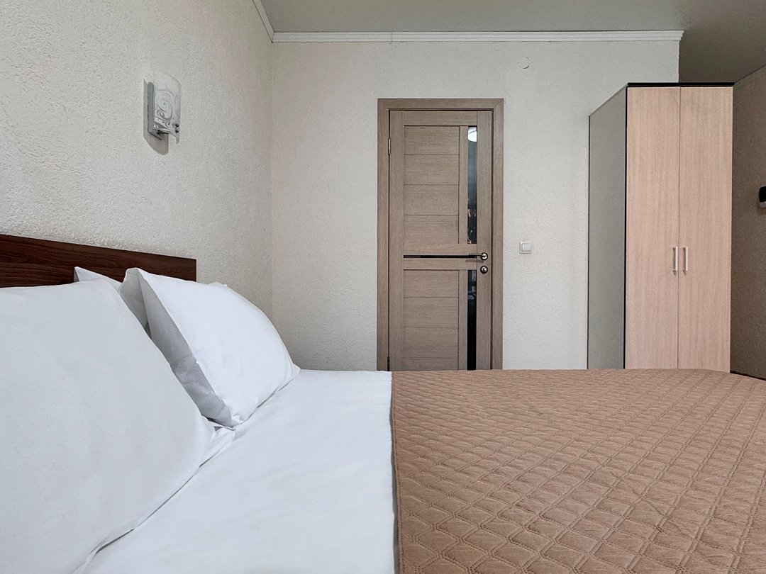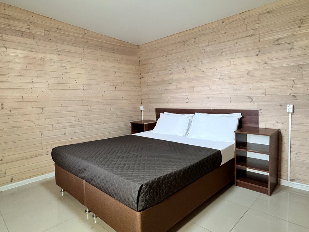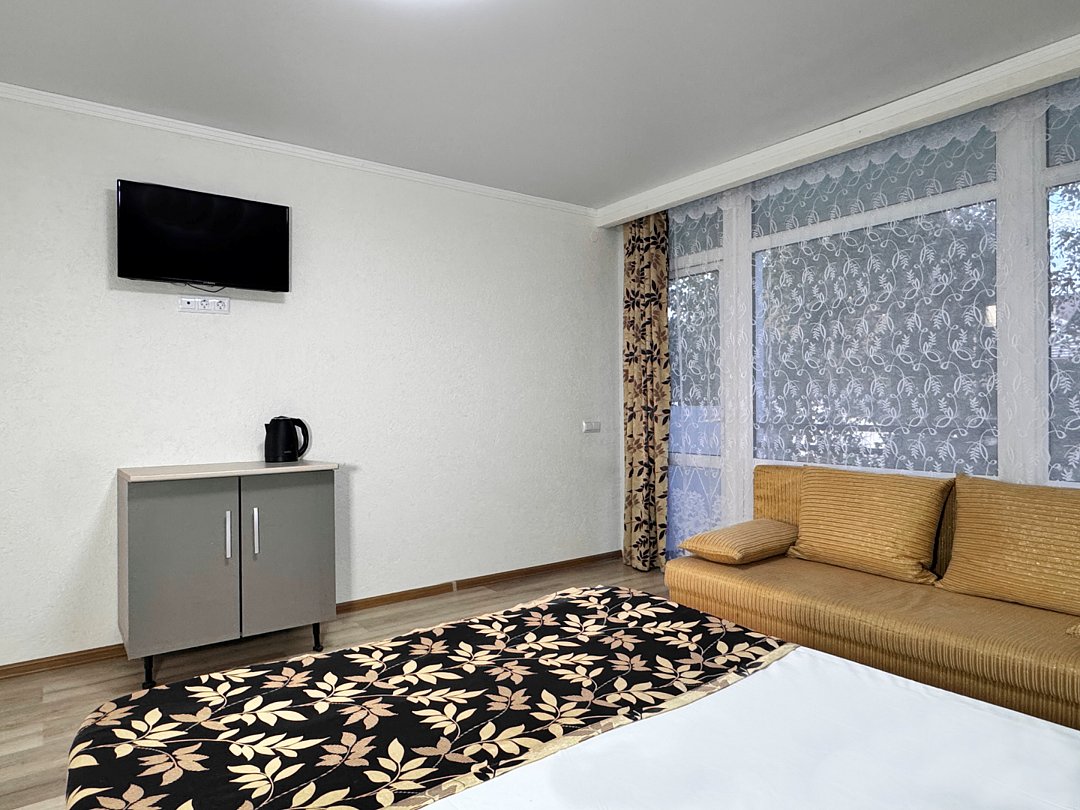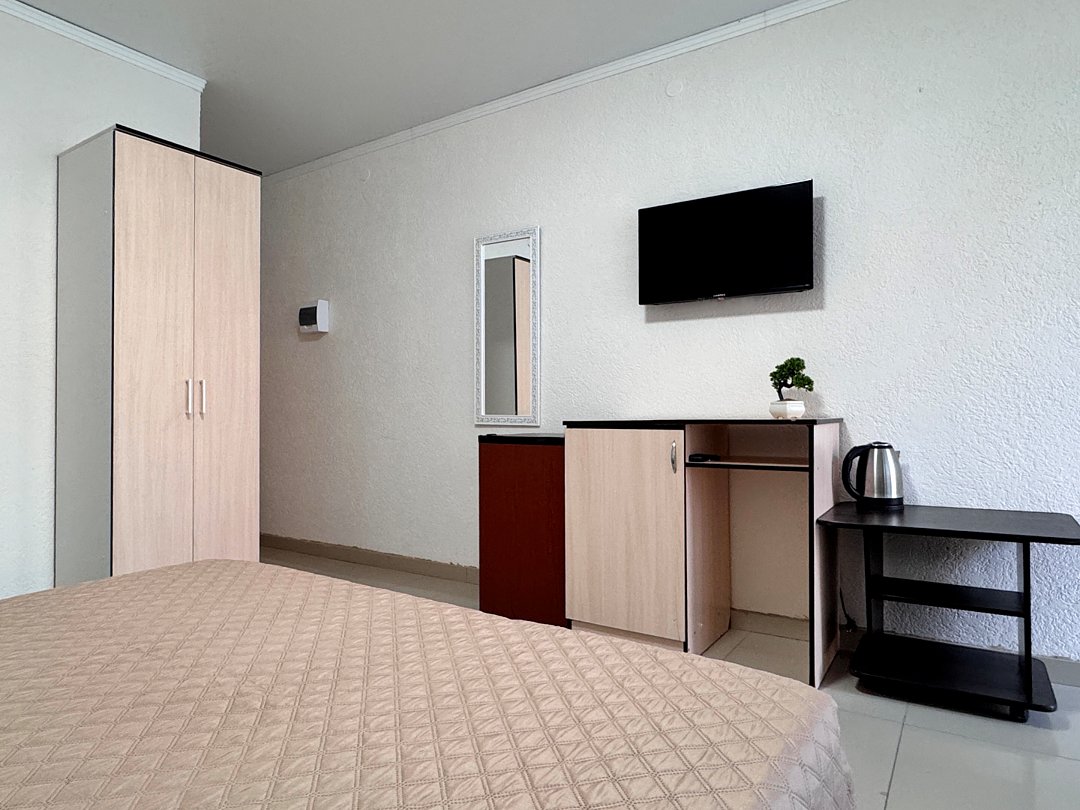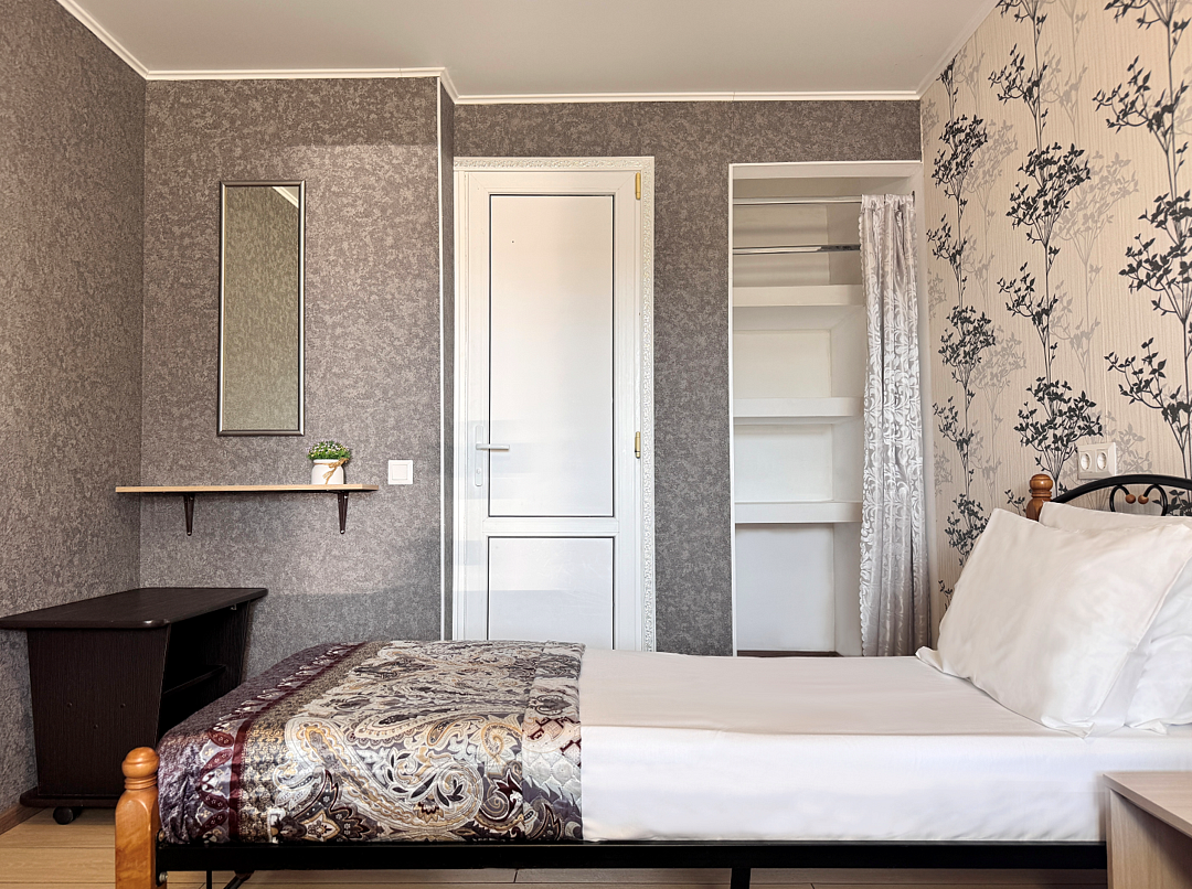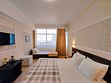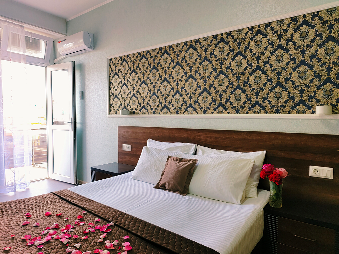 В номере: двуспальная кровать, прикроватные тумбочки,журнальный столик, комод, шкаф,вешалки,зеркало, телевизор, кондиционер, мини-холодильник, электрочайник, набор посуды. Ванная комната: душ, раковина, зеркало, фен, туалет, сушилка для одежды. Зона отдыха перед входом в номер. (Проживание с животными запрещено)В гостиничном номере
