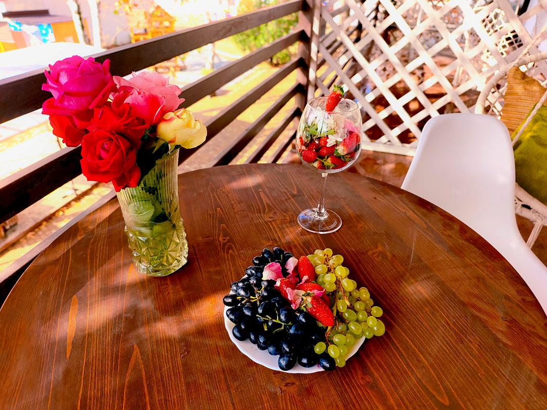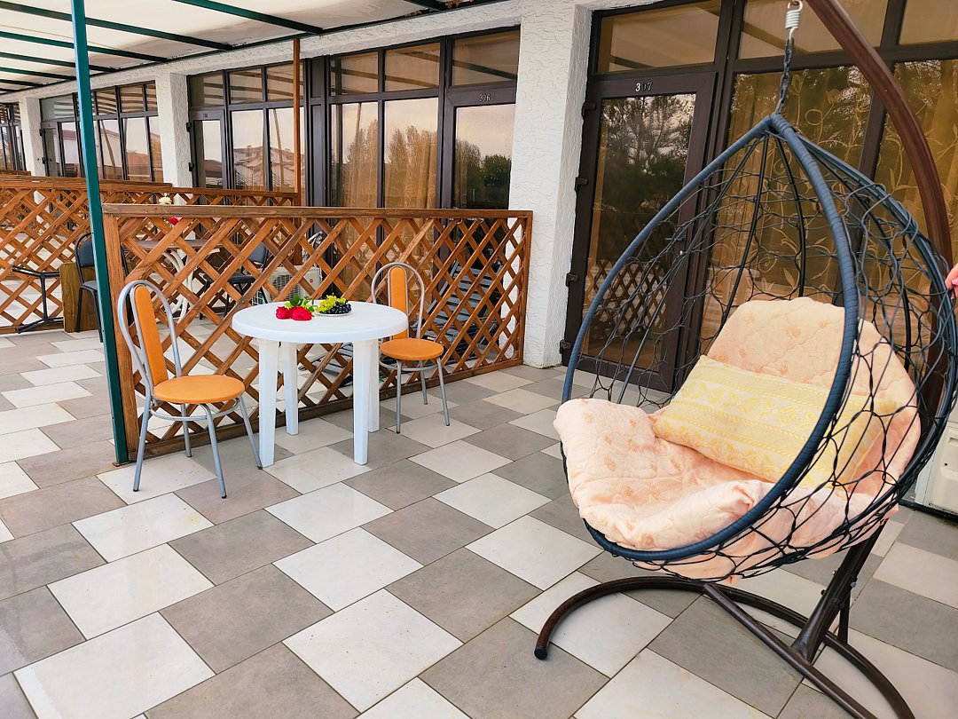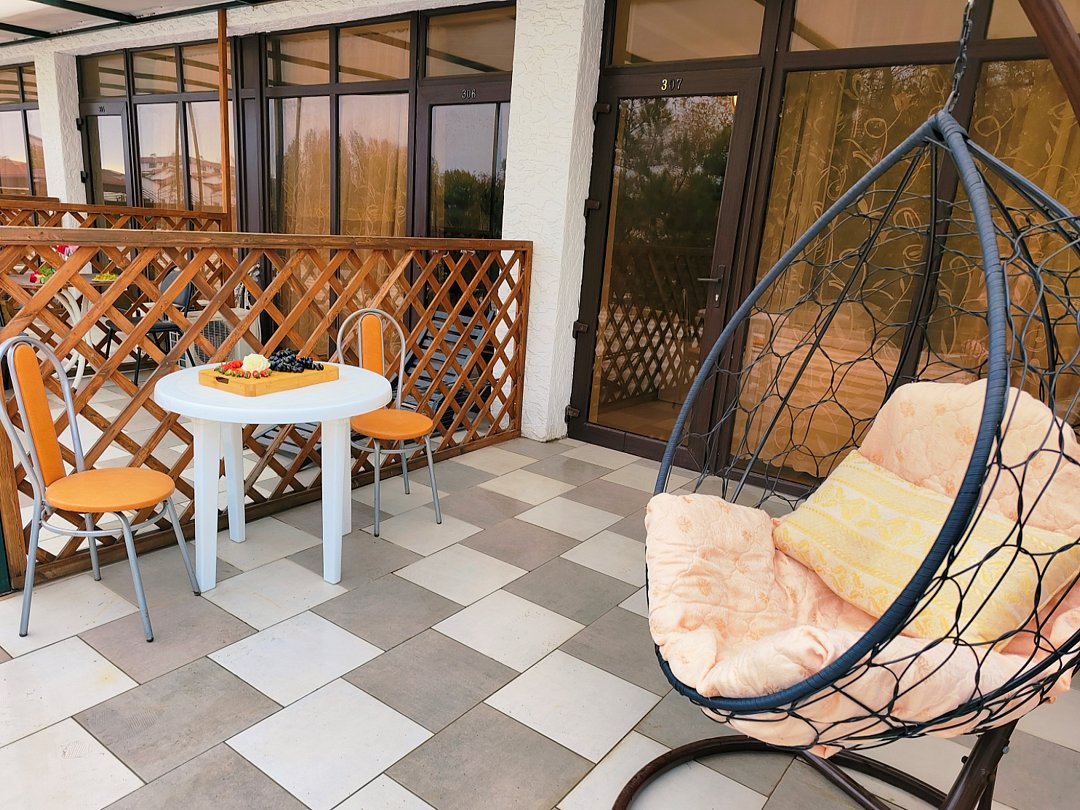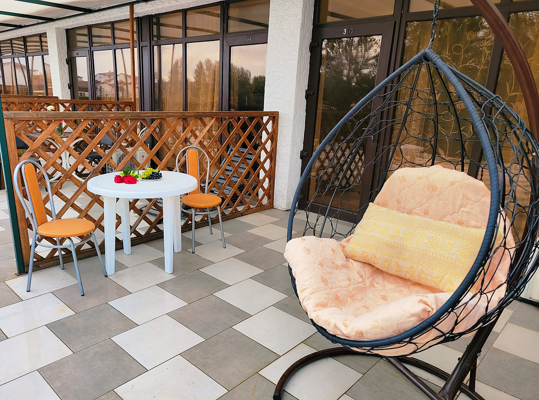 В номере: двуспальная кровать,прикроватные тумбочки,комод, шкаф,вешалки,зеркало, телевизор, кондиционер, мини-холодильник, электрочайник, набор посуды. Ванная комната: душ, раковина, зеркало, фен, туалет, сушилка для белья. Терраса с летней мебелью (Проживание с животными запрещено)В номере: двуспальная кровать,прикроватные тумбочки,комод, шкаф,вешалки,зеркало, телевизор, кондиционер, мини-холодильник, электрочайник, набор посуды. Ванная комната: душ, раковина, зеркало, фен, туалет, сушилка для белья. Терраса с летней мебелью