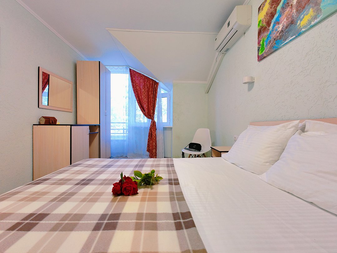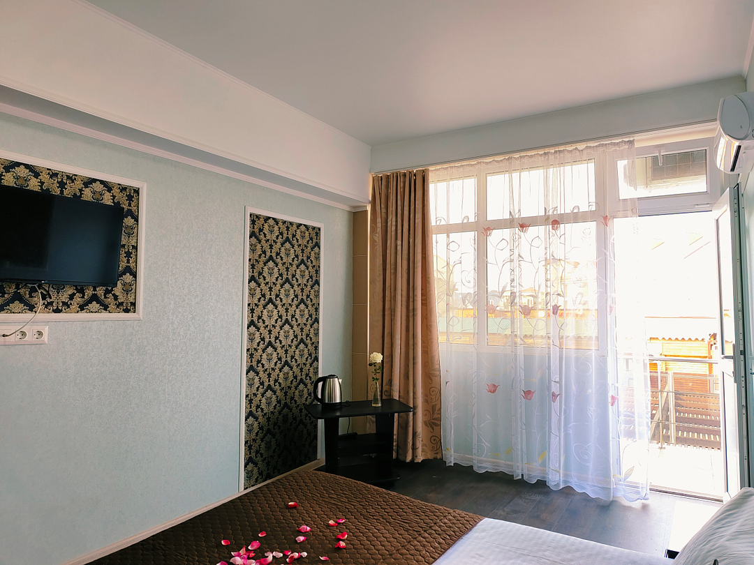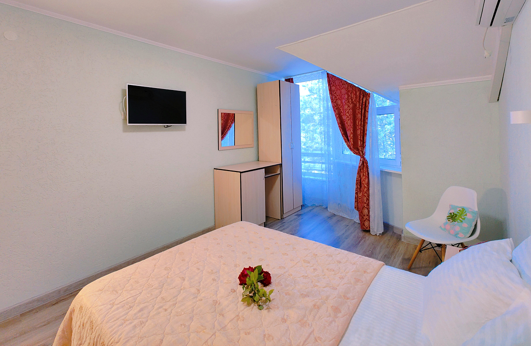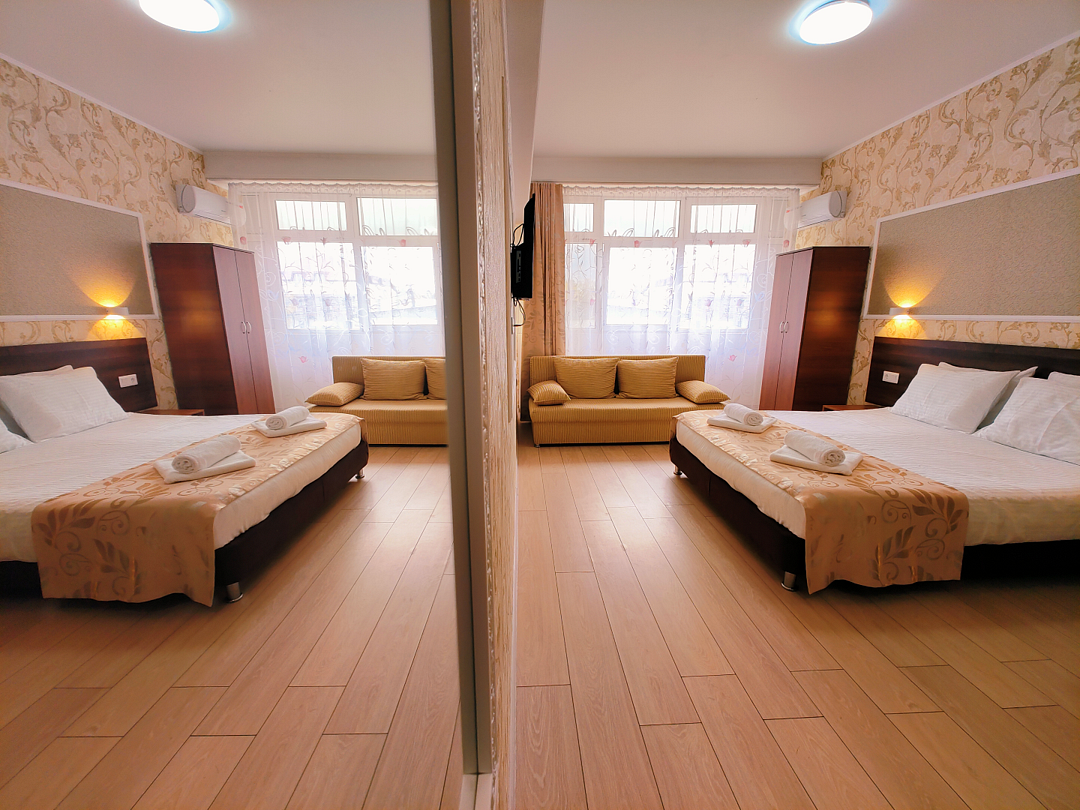В номере: двуспальная кровать, двуспальный диван, прикроватные тумбочки,журнальный столик, шкаф,вешалки,зеркало, телевизор, кондиционер, мини-холодильник, электрочайник, набор посуды. Ванная комната: душ, раковина, зеркало, фен, туалет, сушилка для одежды. Балкон с летней мебелью. (Проживание с животными запрещено)В номере: двуспальня кровать, двуспальный диван, прикроватные тумбочки,журнальный столик, шкаф,вешалки,зеркало, телевизор, кондиционер, мини-холодильник, электрочайник, набор посуды. Ванная комната: душ, раковина, зеркало, фен, туалет, сушилка для одежды. Балкон с летней мебелью