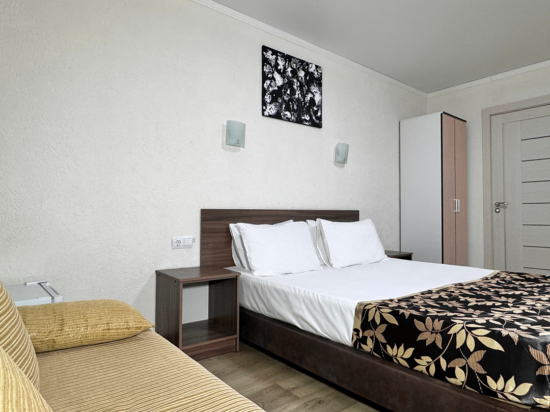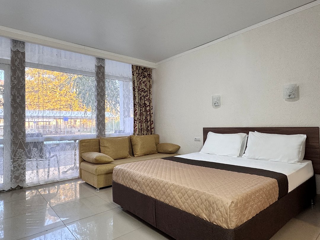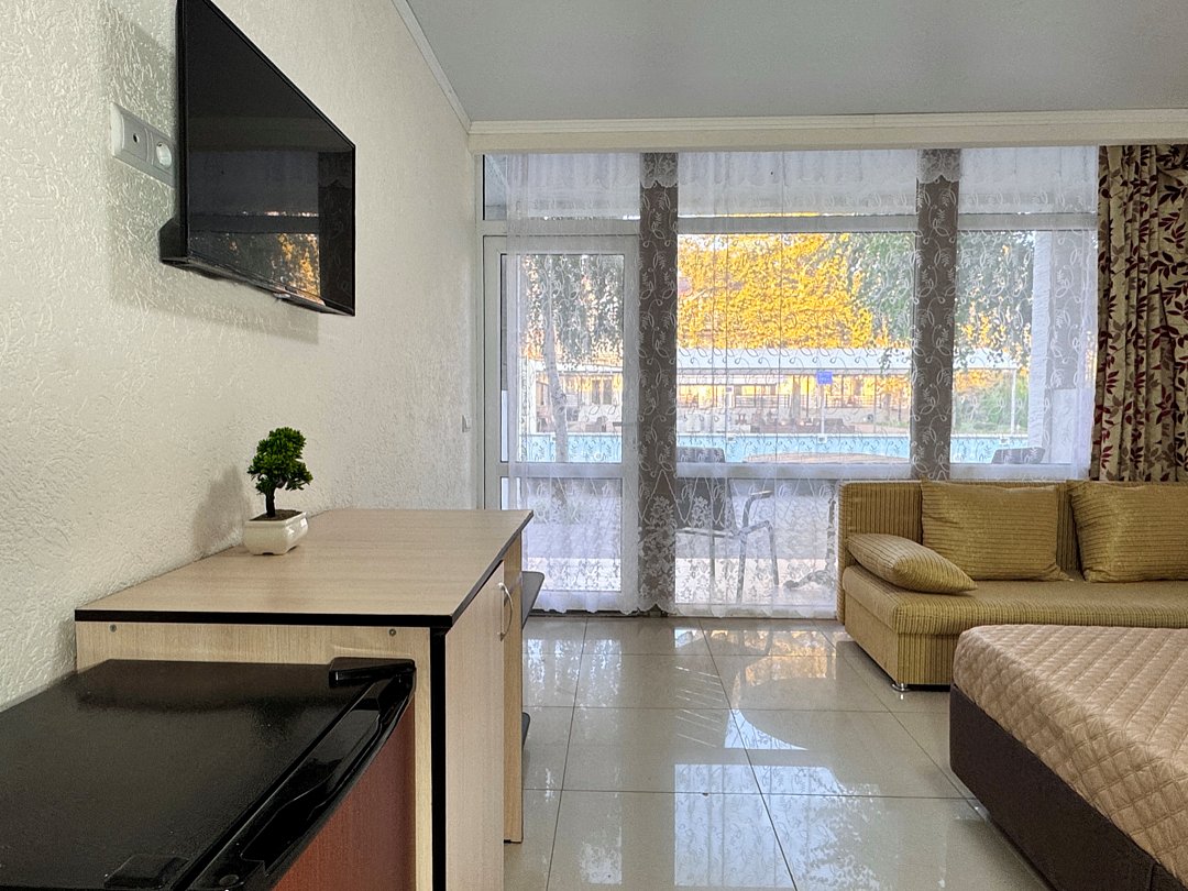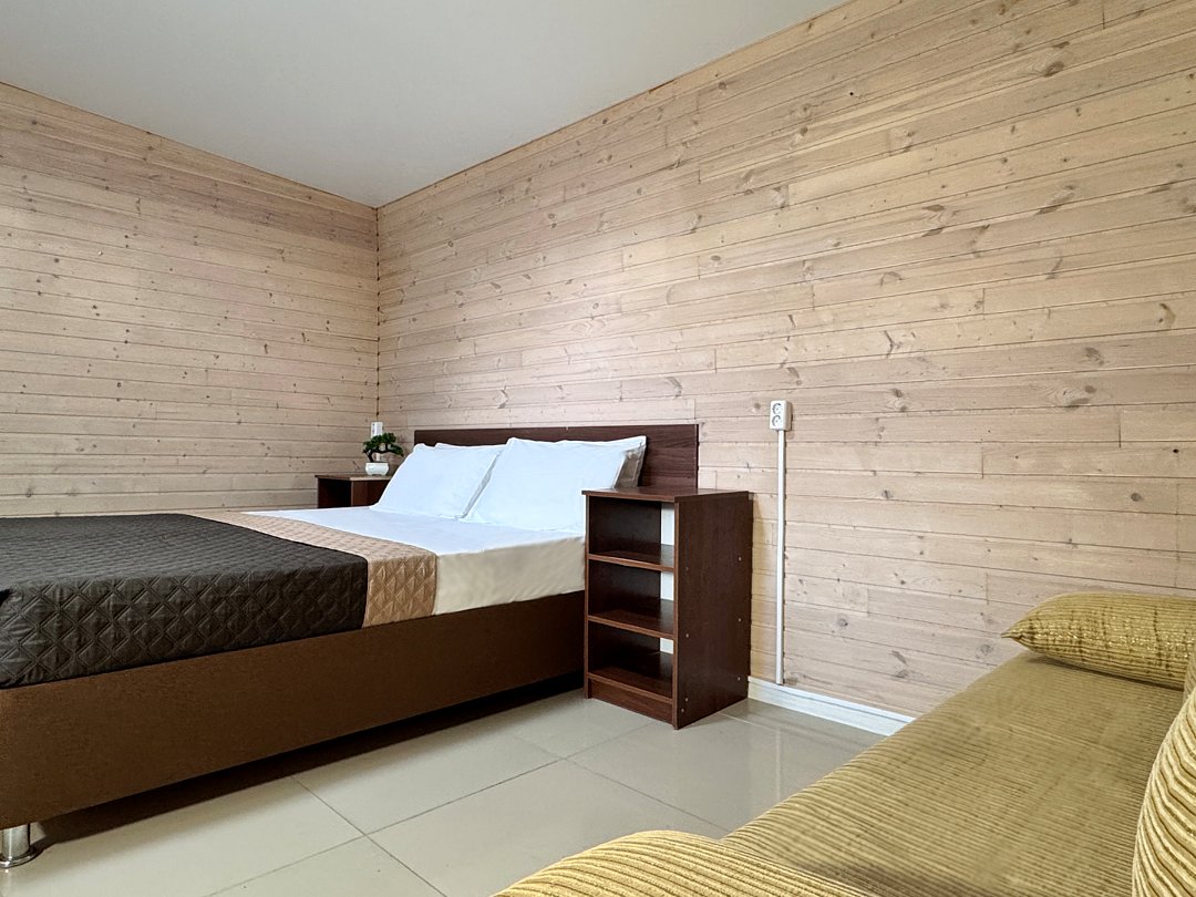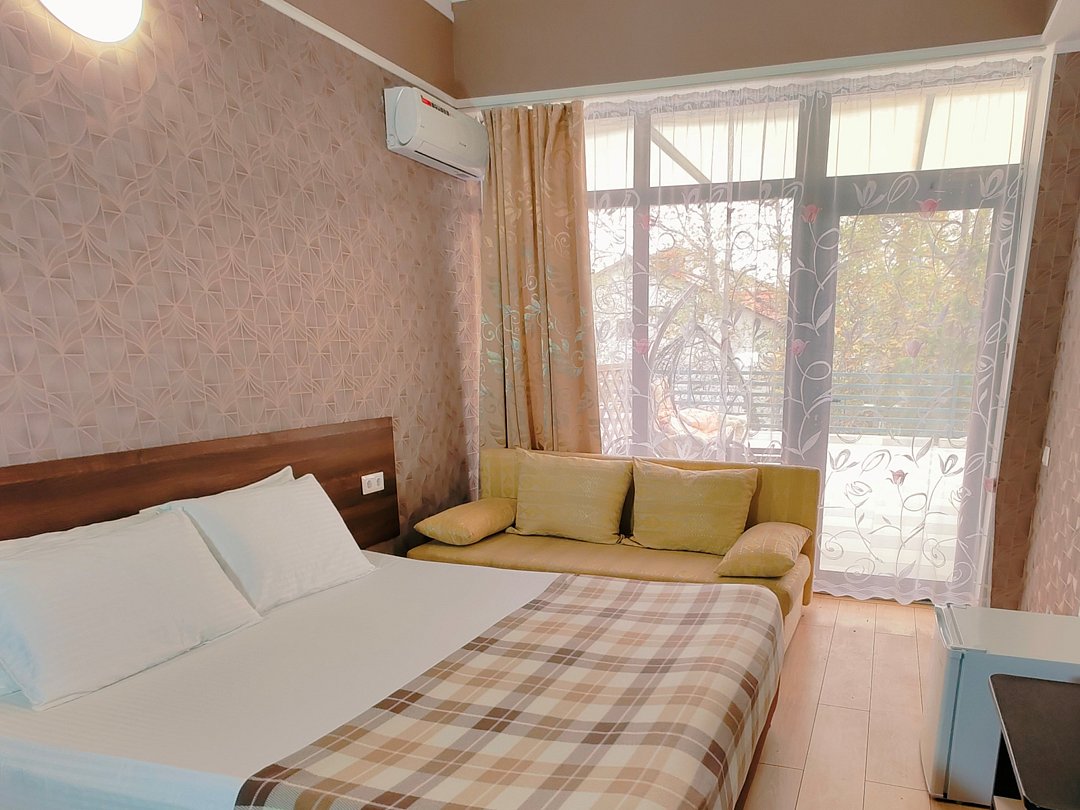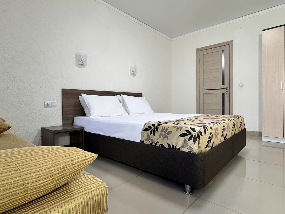В номере: двуспальная кровать, односпальный диван, прикроватные тумбочки,журнальный столик, шкаф,вешалки,зеркало, телевизор, кондиционер, мини-холодильник, электрочайник, набор посуды. Ванная комната: душ, раковина, зеркало, туалет, сушилка для одежды. Индивидуальная зона отдыха с отдельным входом в номер. (Проживание с животными разрешено до 10 кг)В номере: двуспальная кровать, односпальный диван, прикроватные тумбочки,журнальный столик, шкаф,вешалки,зеркало, телевизор, кондиционер, мини-холодильник, электрочайник, набор посуды. Ванная комната: душ, раковина, зеркало, туалет, сушилка для одежды. Индивидуальная зона отдыха с отдельным входом в номер.