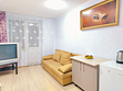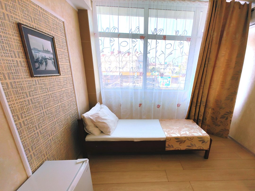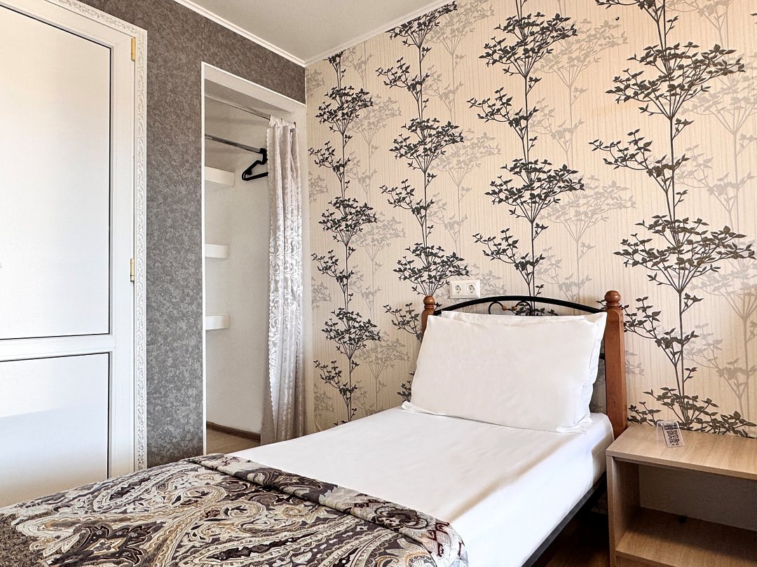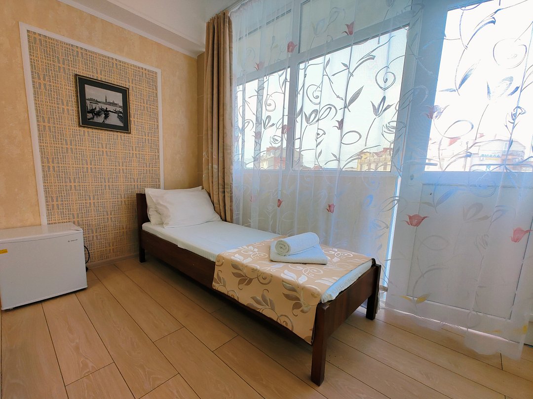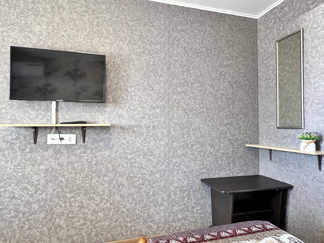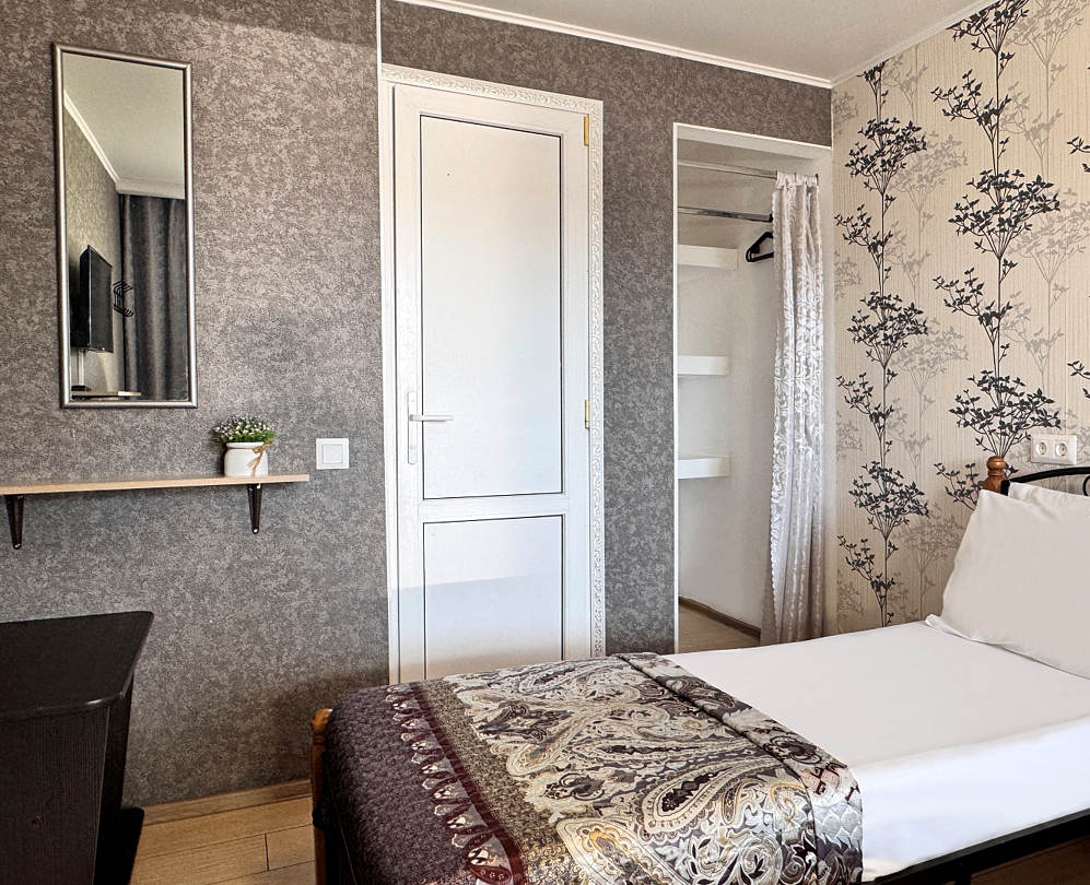 В номере: односпальная кровать, прикроватные тумбочки,журнальный столик, встроенный шкаф,вешалки,зеркало, телевизор, кондиционер, мини-холодильник, электрочайник, набор посуды. Ванная комната: душ, раковина, зеркало, фен, туалет.