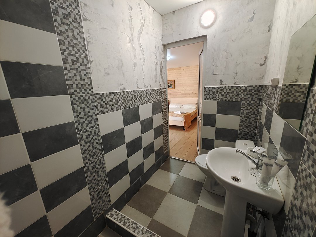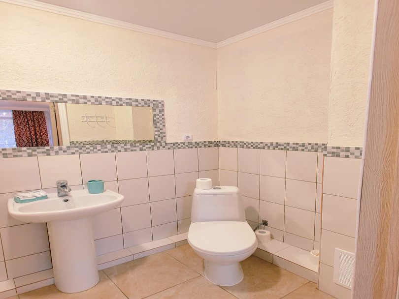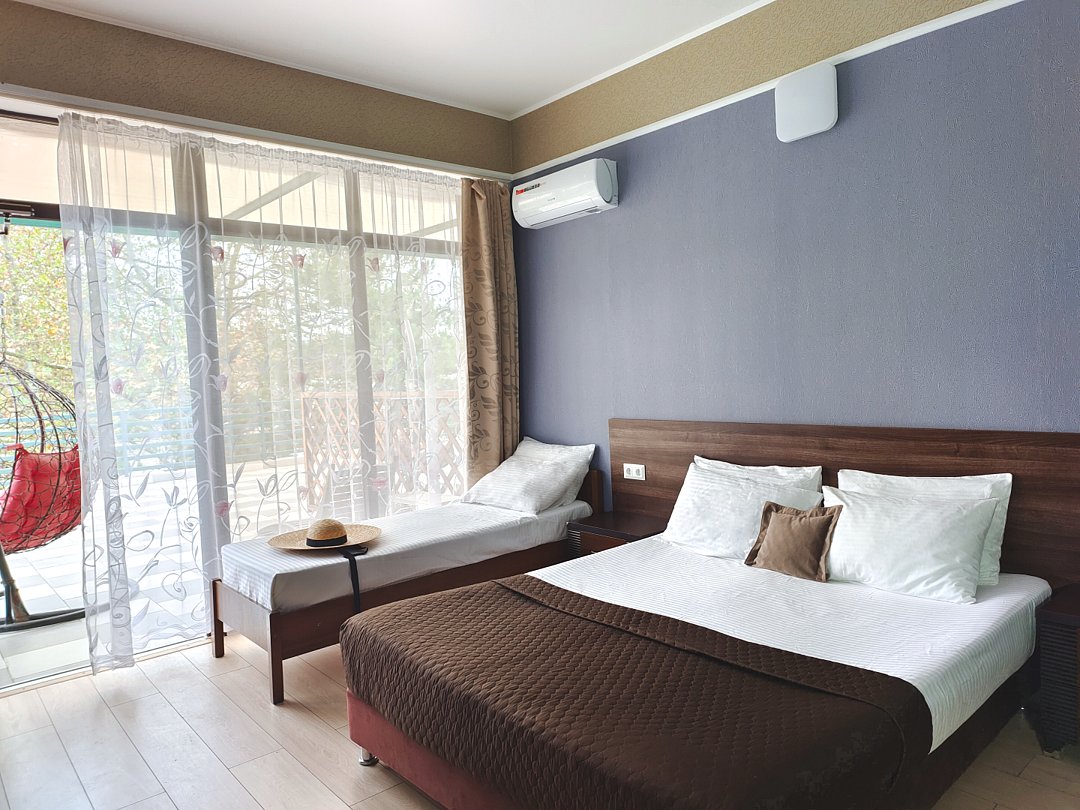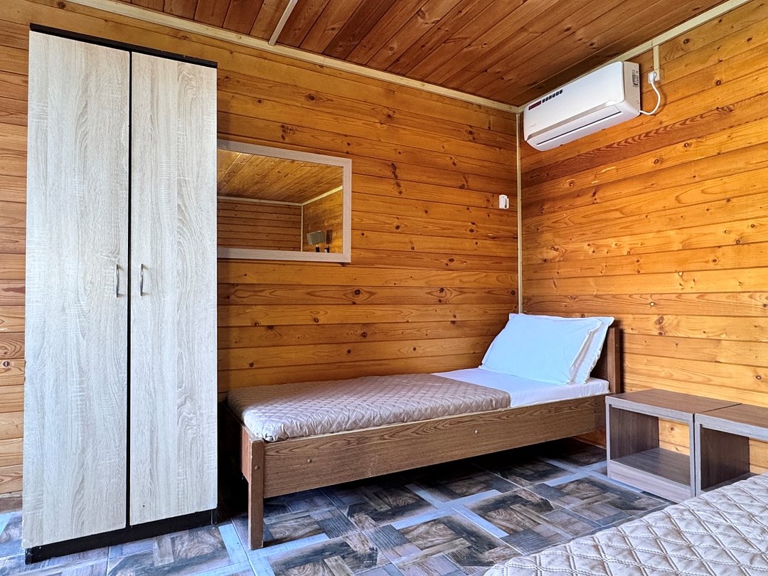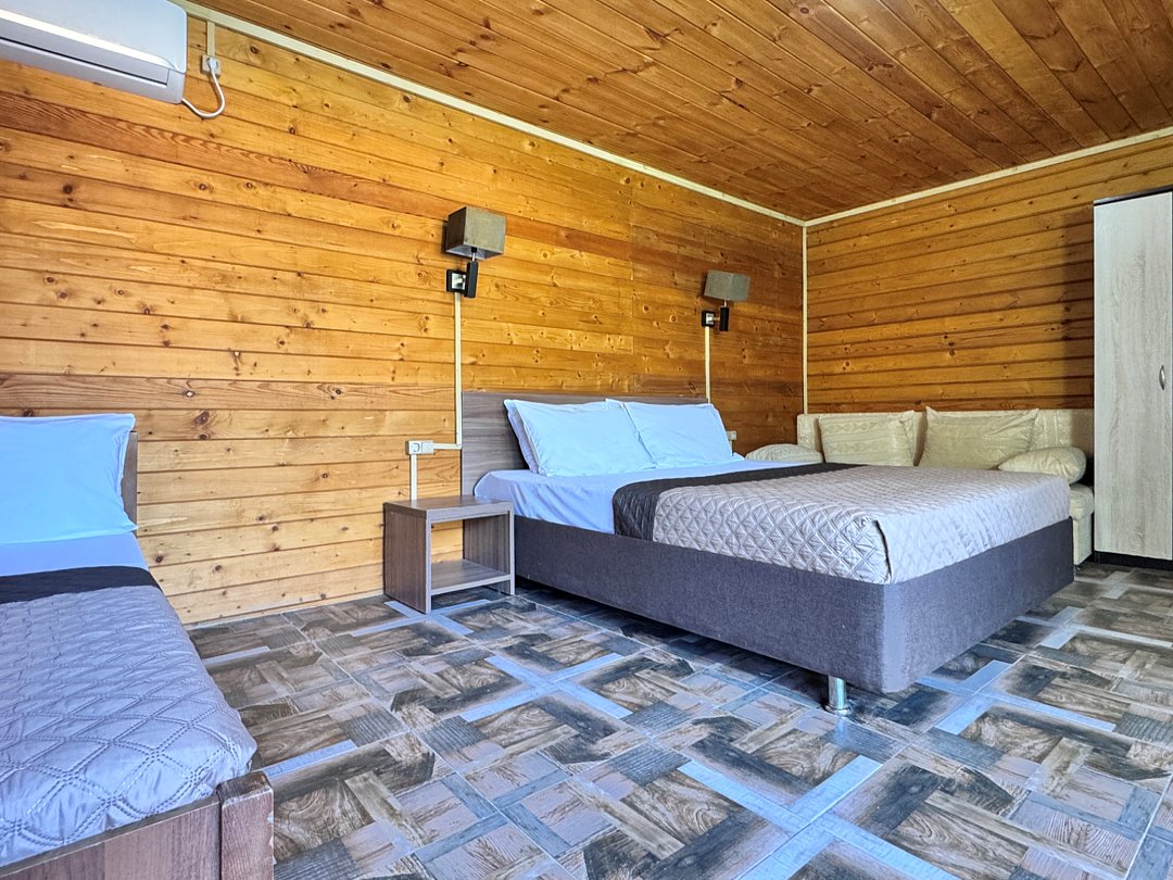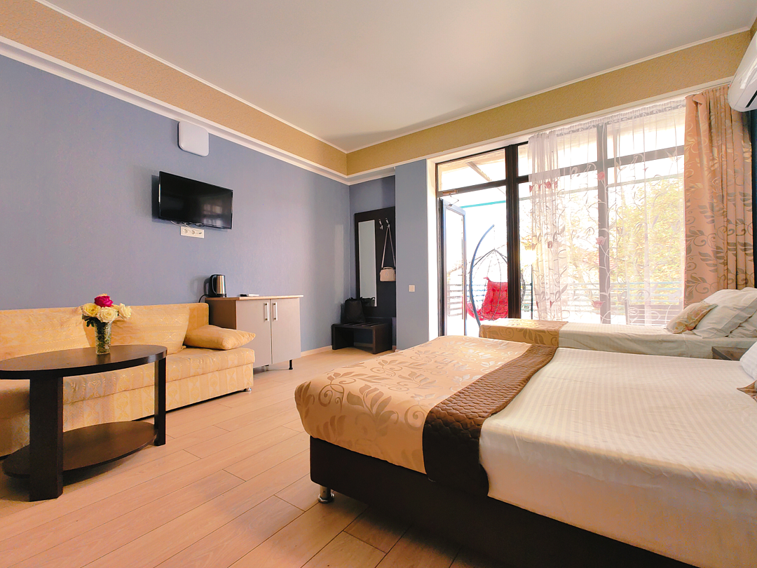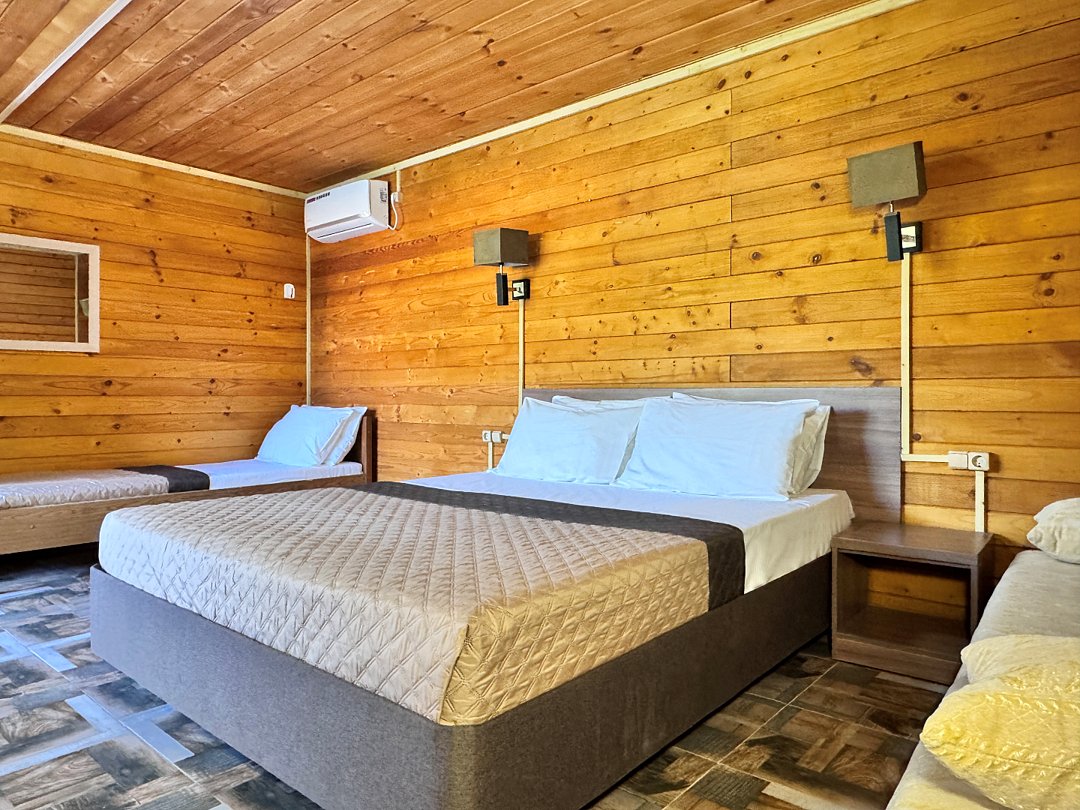 В номере: двуспальная кровать, односпальная кровать, прикроватные тумбочки,журнальный столик, шкаф,вешалки,зеркало, телевизор, кондиционер, мини-холодильник, электрочайник, набор посуды. Ванная комната: душ, раковина, зеркало, туалет, сушилка для одежды. Индивидуальная зона отдыха с отдельным входом в номер.