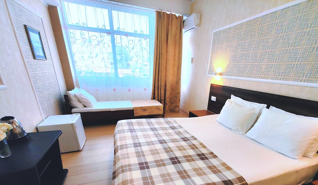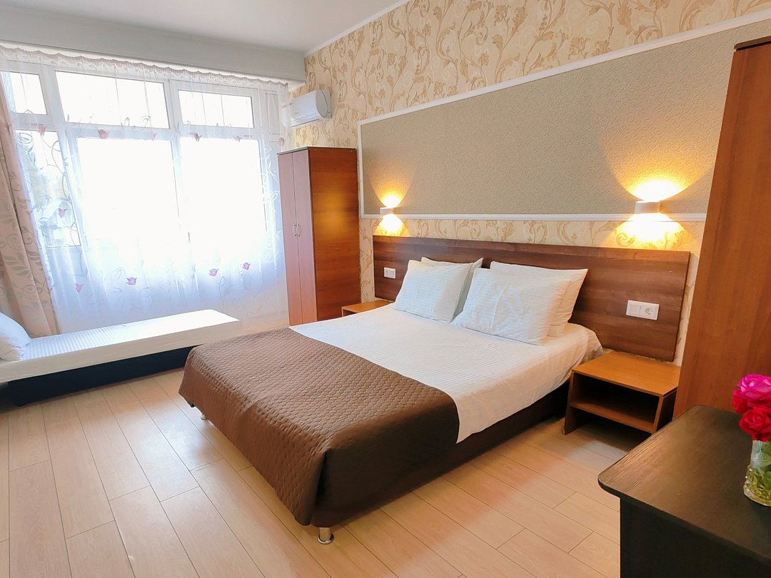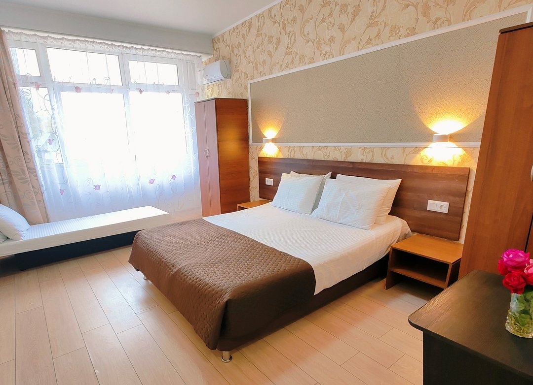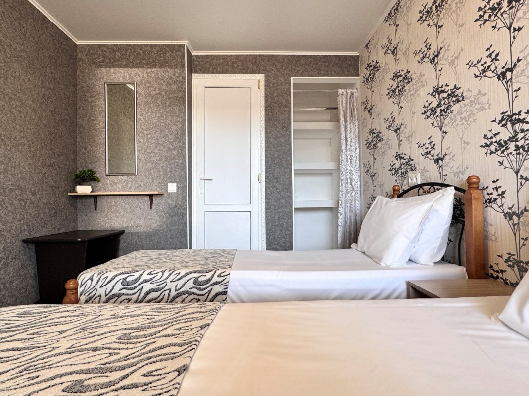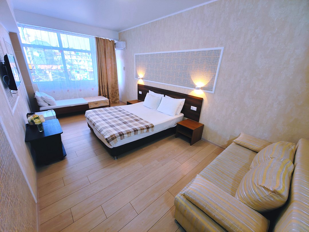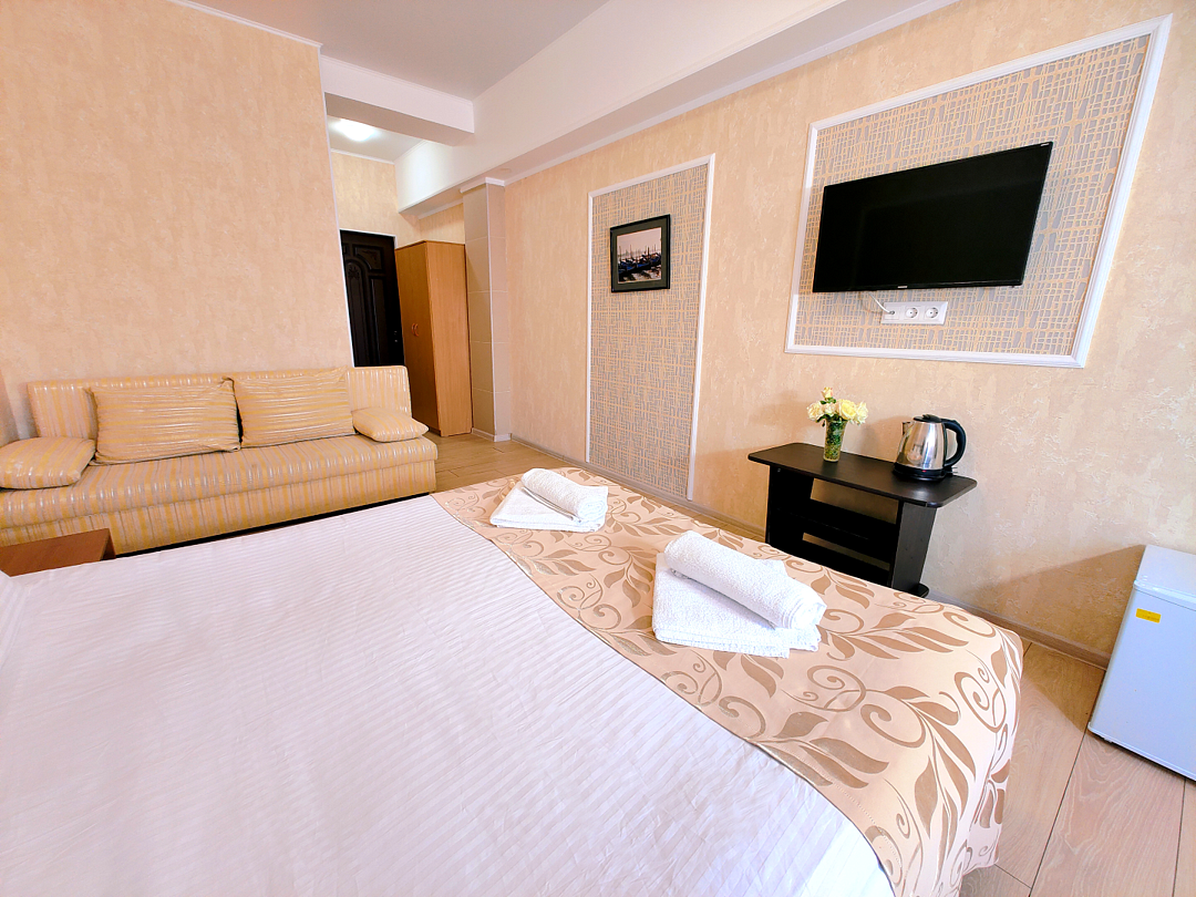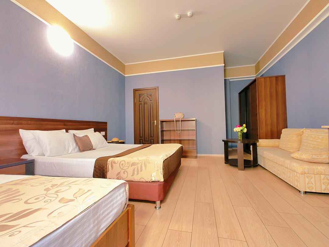 В номере: двуспальная кровать, односпальный диван, односпальный диван, прикроватные тумбочки,журнальный столик, комод, шкаф,вешалки,зеркало, телевизор, кондиционер, мини-холодильник, электрочайник, набор посуды. Ванная комната: душ, раковина, зеркало, фен, туалет, сушилка для одежды. Зона отдыха перед входом в номер. (Проживание с животными запрещено)В номере: двуспальная кровать, односпальный диван, прикроватные тумбочки,журнальный столик, комод, шкаф,вешалки,зеркало, телевизор, кондиционер, мини-холодильник, электрочайник, набор посуды. Ванная комната: душ, раковина, зеркало, фен, туалет, сушилка для одежды. Зона отдыха перед входом в номер.