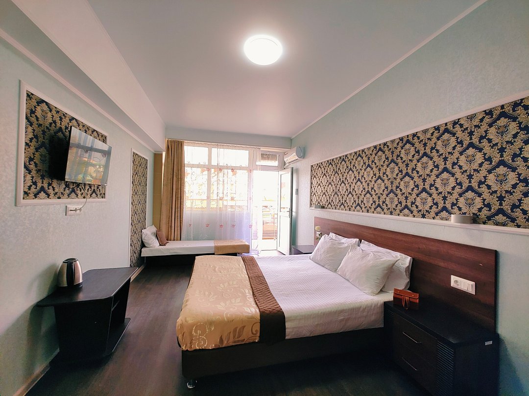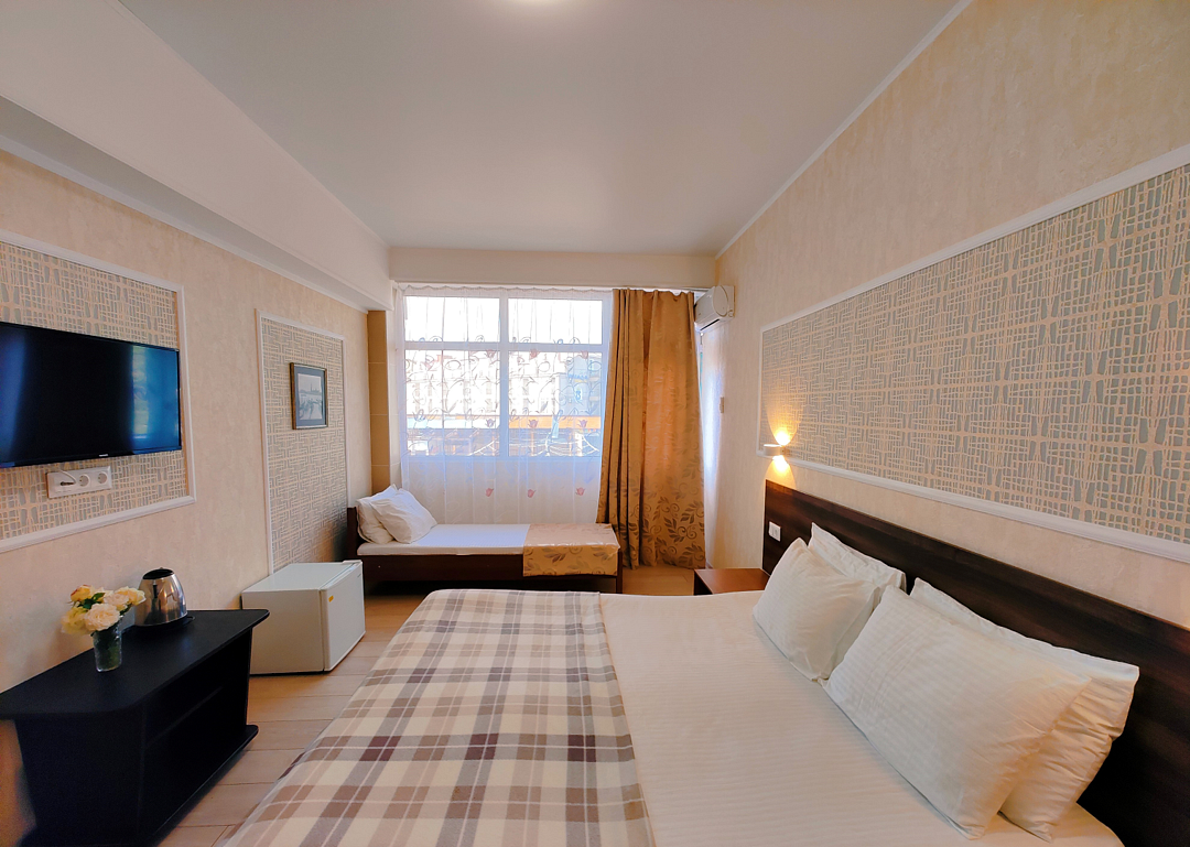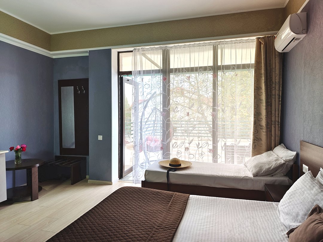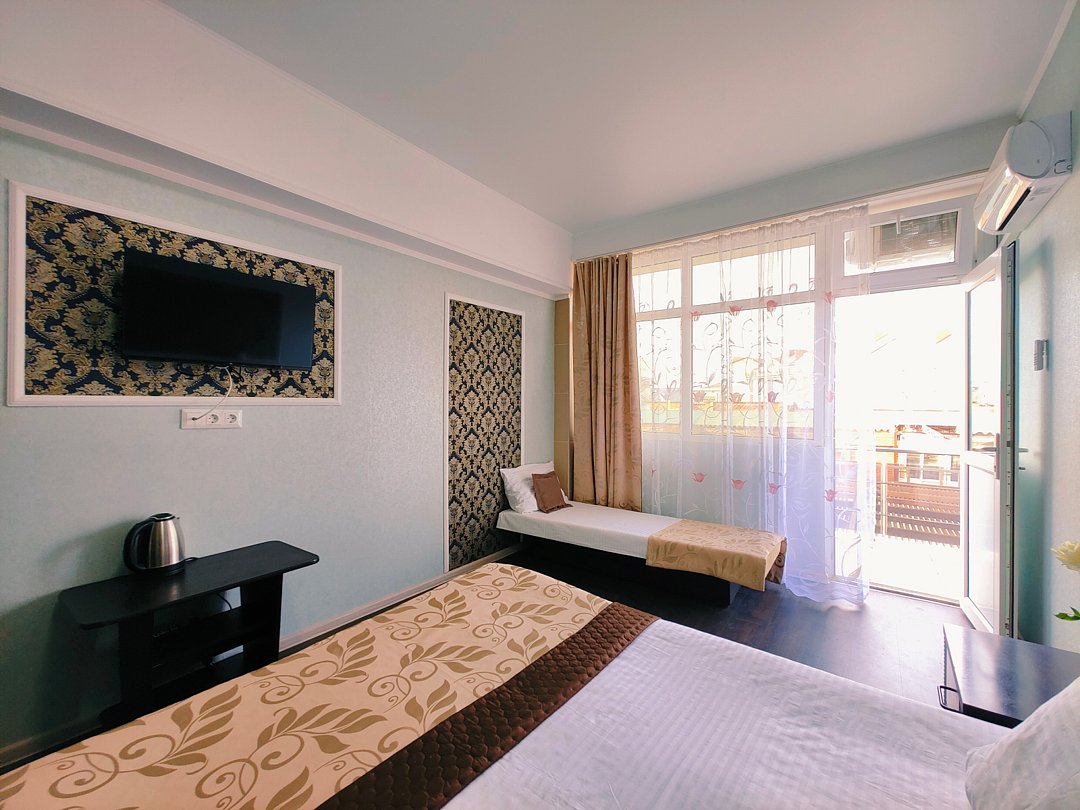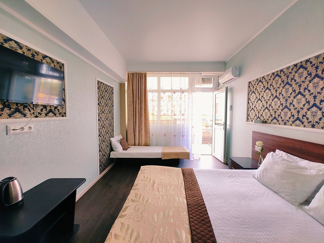 В номере: односпальная кровать, двуспальная кровать, двуспальный диван, прикроватные тумбочки,журнальный столик, шкаф,вешалки,зеркало, телевизор, кондиционер, мини-холодильник, электрочайник, набор посуды. Ванная комната: душ, раковина, зеркало, фен, туалет, сушилка для одежды. Балкон с летней мебелью. (Проживание с животными запрещено)В номере: односпальная кровать, двуспальная кровать, двуспальный диван, прикроватные тумбочки,журнальный столик, шкаф,вешалки,зеркало, телевизор, кондиционер, мини-холодильник, электрочайник, набор посуды. Ванная комната: душ, раковина, зеркало, фен, туалет, сушилка для одежды. Балкон с летней мебелью