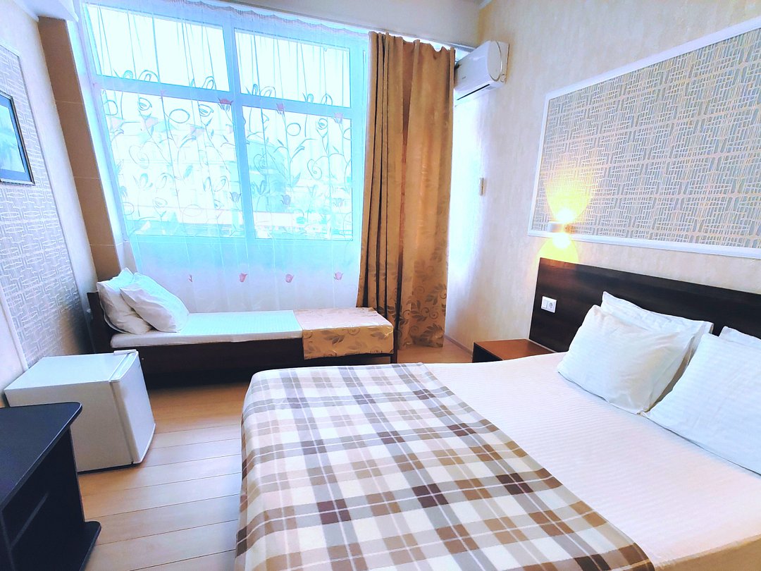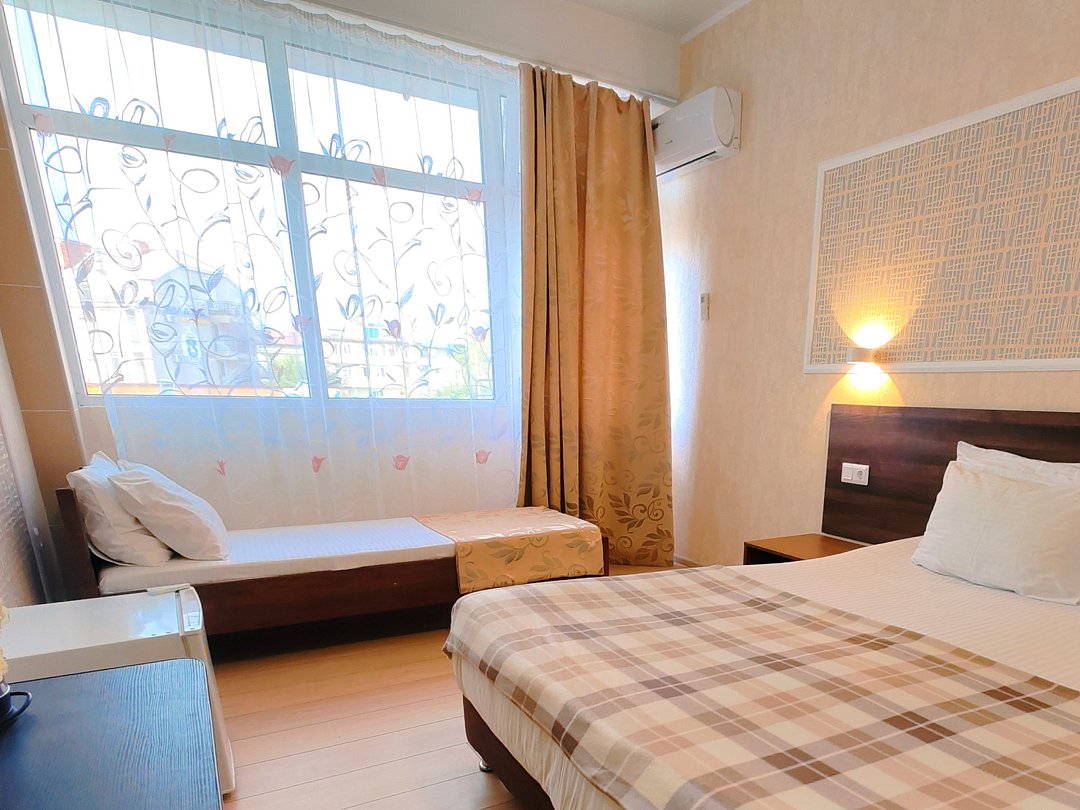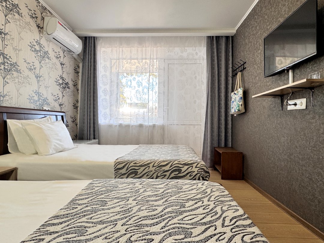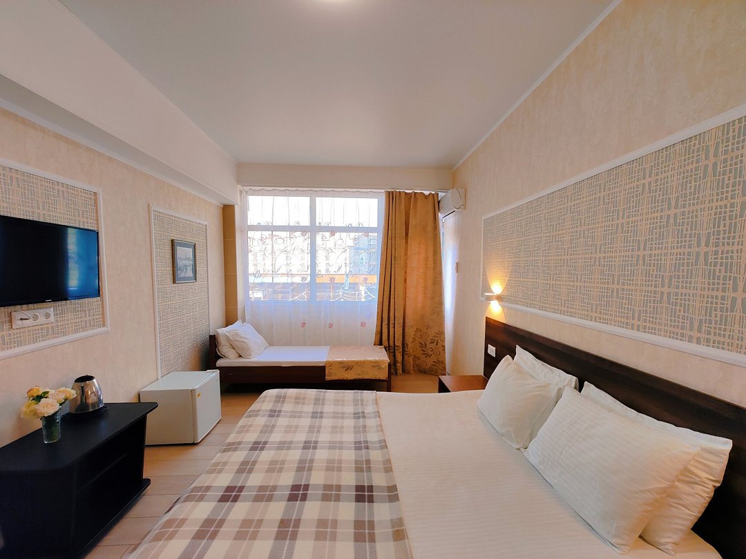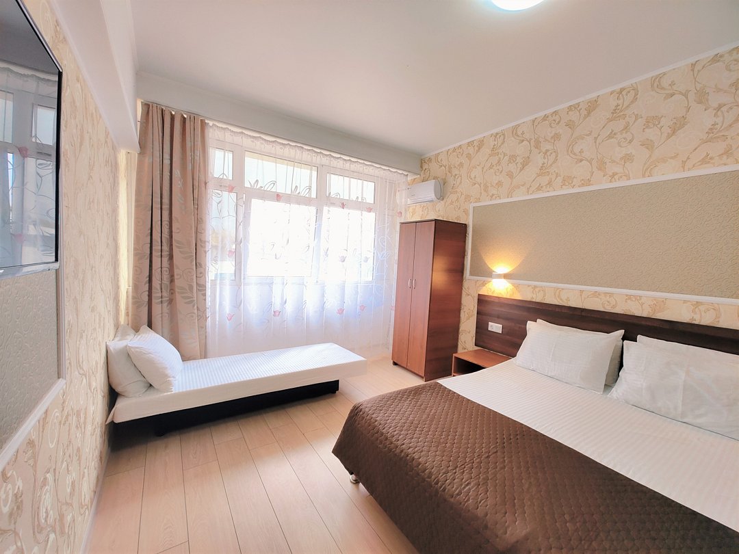 В номере: односпальная кровать, двуспальная кровать, двуспальный диван, прикроватные тумбочки,журнальный столик, шкаф,вешалки,зеркало, телевизор, кондиционер, мини-холодильник, электрочайник, набор посуды. Ванная комната: душ, раковина, зеркало, фен, туалет, сушилка для одежды. Балкон с летней мебелью. (Проживание с животными запрещено)В номере: односпальная кровать, двуспальная кровать, двуспальный диван, прикроватные тумбочки,журнальный столик, шкаф,вешалки,зеркало, телевизор, кондиционер, мини-холодильник, электрочайник, набор посуды. Ванная комната: душ, раковина, зеркало, фен, туалет, сушилка для одежды. Балкон с летней мебелью