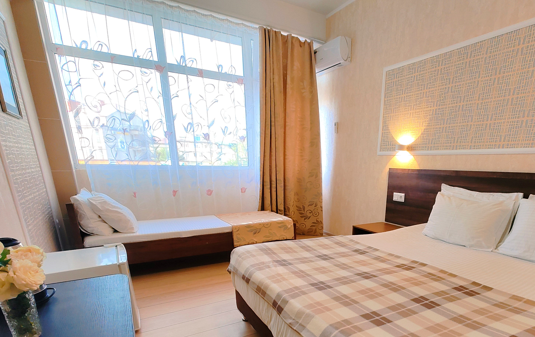 В номере: Двуспальная кровать, односпальная кровать, прикроватные тумбочки,журнальный столик, шкаф,вешалки,зеркало, телевизор, кондиционер, мини-холодильник, электрочайник, набор посуды. Ванная комната: душ, раковина, зеркало, фен, туалет, сушилка для одежды.