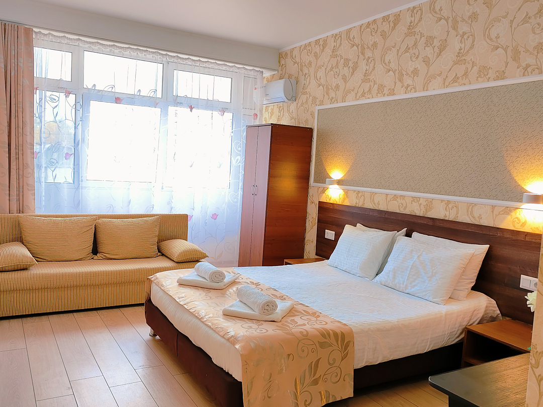 В номере: Двуспальная кровать,односпальная кровать или двуспальная кровать и односпальный диван, прикроватные тумбочки,журнальный столик, шкаф,вешалки,зеркало, телевизор, кондиционер, мини-холодильник, электрочайник, набор посуды. Ванная комната: душ, раковина, зеркало, фен, туалет, сушилка для одежды. Балкон с летней мебелью