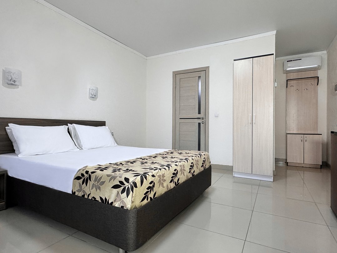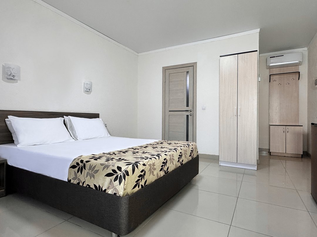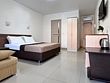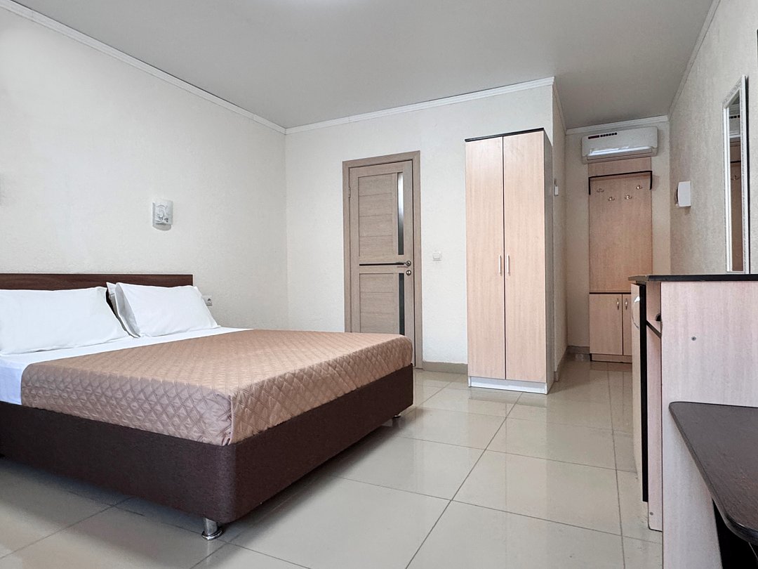 В номере: Двуспальная кровать, прикроватные тумбочки,журнальный столик, шкаф,вешалки,зеркало, телевизор, кондиционер, мини-холодильник, электрочайник, набор посуды. Ванная комната: душ, раковина, зеркало, туалет, сушилка для одежды.