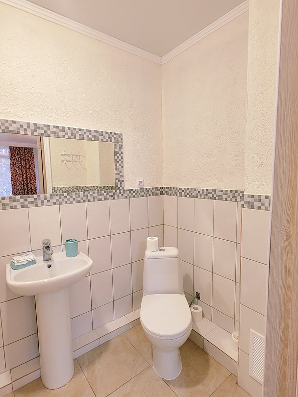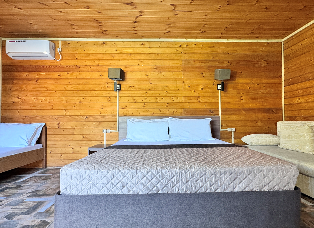 В номере: двуспальная кровать, односпальная кровать, прикроватные тумбочки,журнальный столик, комод, шкаф,вешалки,зеркало, телевизор, кондиционер, мини-холодильник, электрочайник, набор посуды. Ванная комната: душ, раковина, зеркало, туалет, сушилка для одежды. Зона отдыха перед входом в номер. (Проживание с животными запрещено)В номере: двуспальная кровать, односпальная кровать, прикроватные тумбочки,журнальный столик, шкаф,вешалки,зеркало, телевизор, кондиционер, мини-холодильник, электрочайник, набор посуды. Ванная комната: душ, раковина, зеркало, туалет, сушилка для одежды. Индивидуальная зона отдыха с отдельным входом в номер.