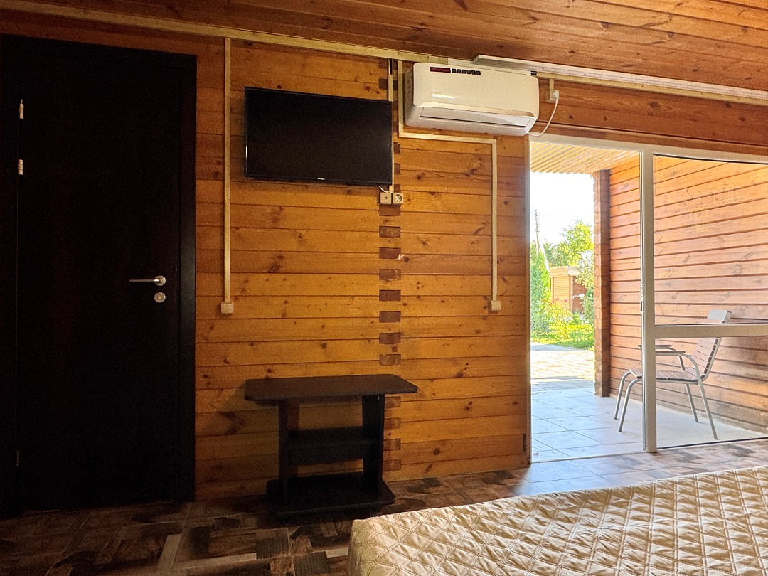 В номере: двуспальная кровать, прикроватные тумбочки,журнальный столик, шкаф,вешалки,зеркало, телевизор, кондиционер, мини-холодильник, электрочайник, набор посуды. Ванная комната: душ, раковина, зеркало, туалет, сушилка для одежды. Индивидуальная зона отдыха с отдельным входом в номер.