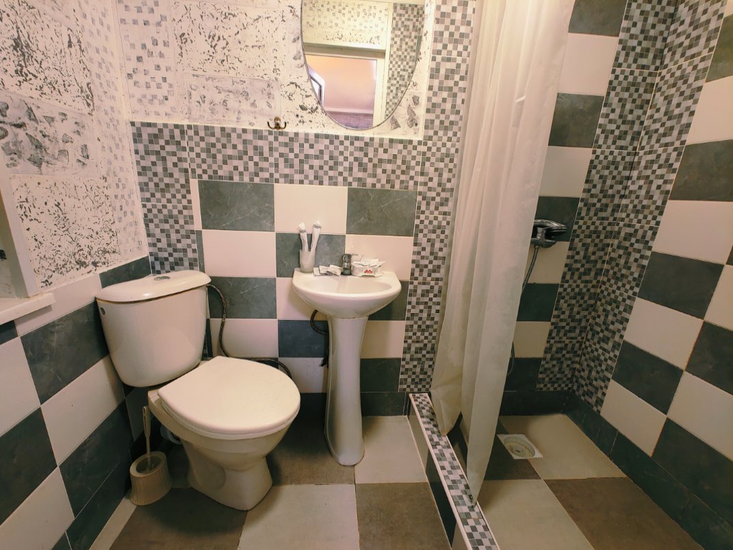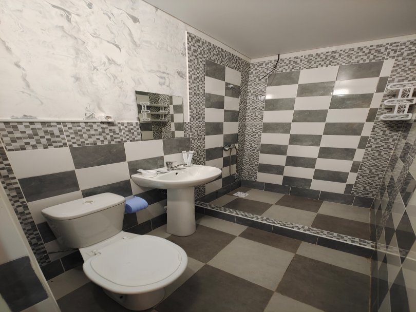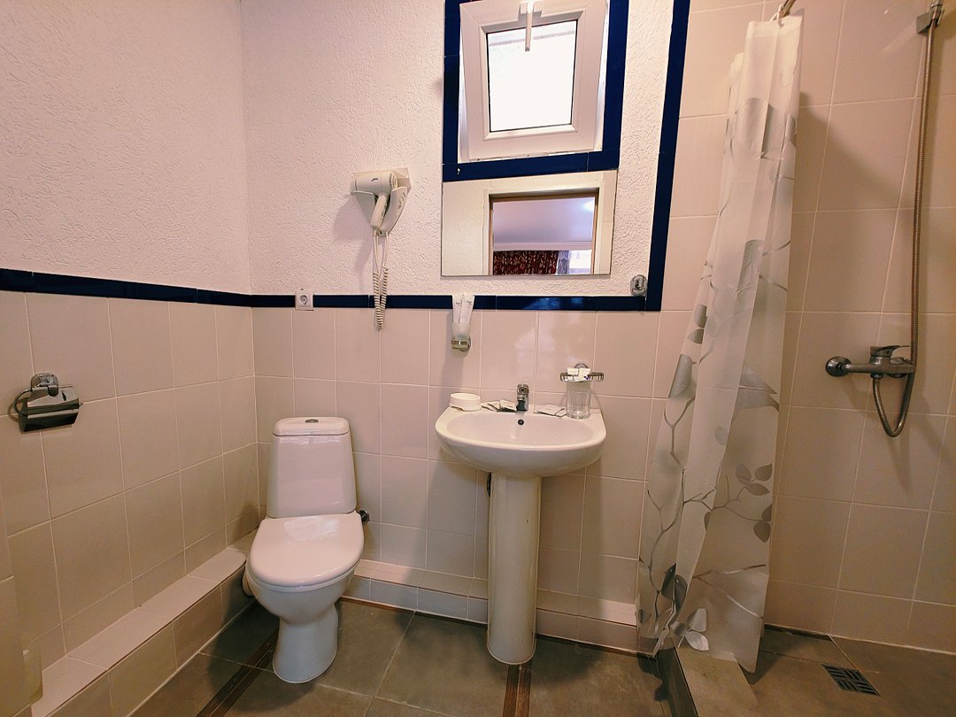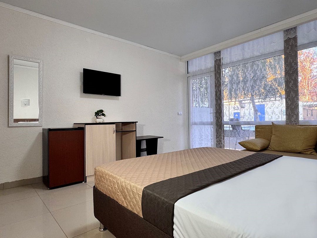 В номере: двуспальная кровать или две односпальные кровати, прикроватные тумбочки,журнальный столик, встроенный шкаф,вешалки,зеркало, телевизор, кондиционер, мини-холодильник, электрочайник, набор посуды. Ванная комната: душ, раковина, зеркало, фен, туалет.