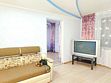 В первой комнате: двуспальная кровать, прикроватные тумбочки,комод, шкаф,вешалки,зеркало, телевизор, кондиционер. Во второй комнате: два двуспальных дивана, мини-холодильник, электрочайник, набор посуды. Ванная комната: душ, раковина, зеркало, фен, туалет, сушилка для белья. Терраса с летней мебелью