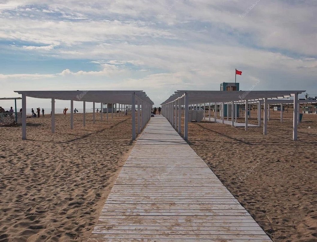 Инфраструктура: лежаки, зонтики, шезлонгиПесчаный пляж