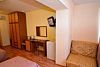 В номере: двуспальная кровать, прикроватные тумбочки, два кресла-кровати (два дополнительных места), стол журнальный, телевизор, холодильник, кондиционер, комплект мебели – шкаф «Горка», шкаф для одежды, комплект посуды, эл. чайник.