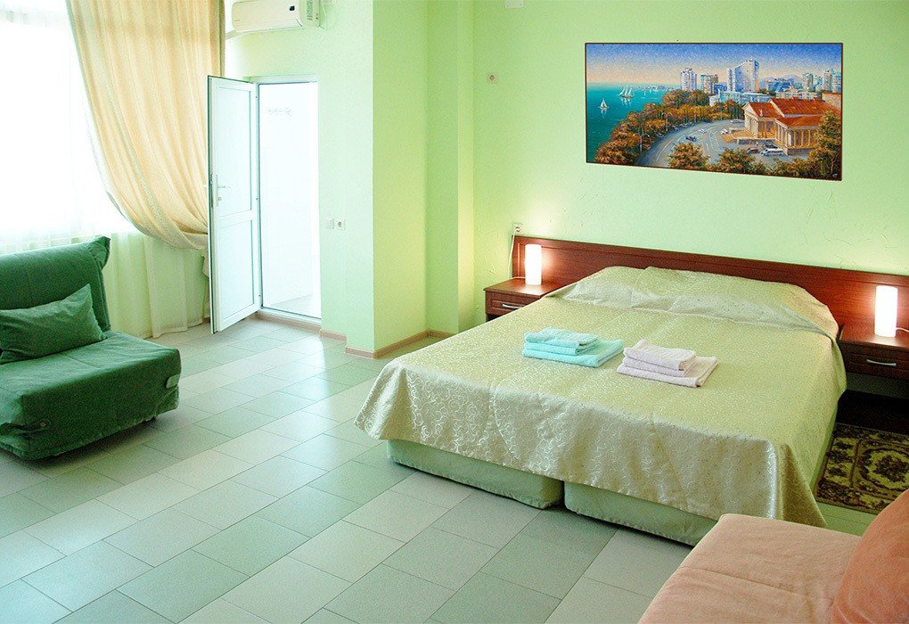 В каждом номере предусмотрена ванная комната с душем. Все они стильно меблированы. Есть холодильник, телевизор, кондиционер. При желании в номерах можно организовать место для детей.