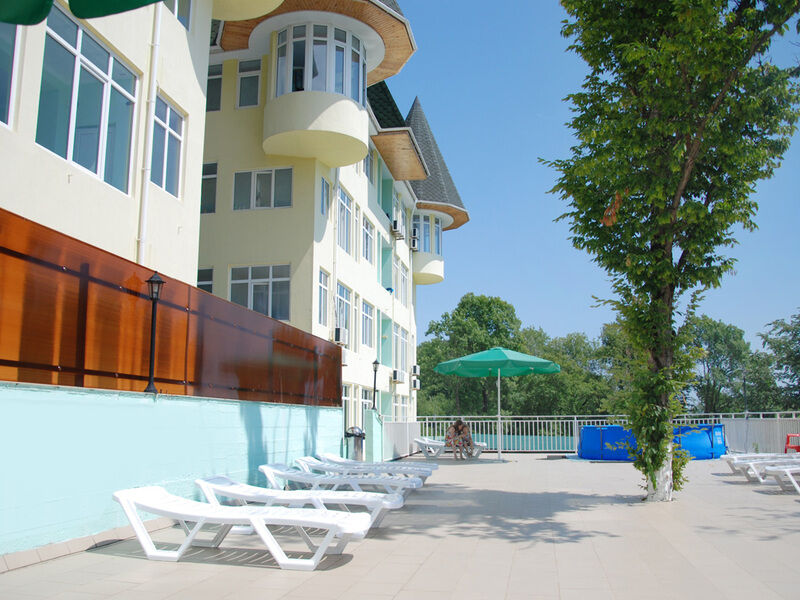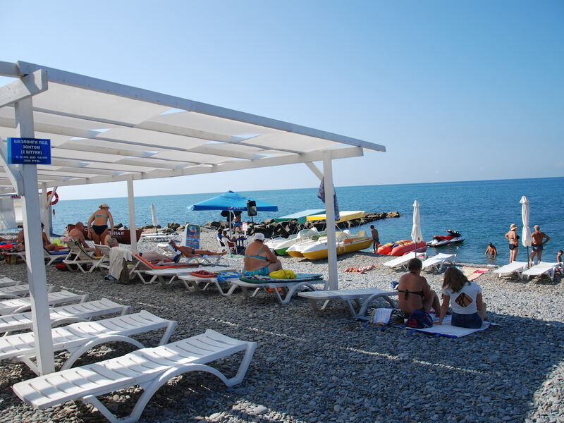 Пляжный отдых в пансионате просто замечательный, несмотря на то, что отельный комплекс не обладает собственным пляжем. Но здесь есть превосходная поселковая пляжная зона, и пройти от отеля нужно всего лишь сто метров. Пляж полностью подготовлен и оборудован для приятного отдыха, поэтому можно воспользоваться шезлонгами и солнцезащитными зонтами, а также выбрать для себя и своей семьи удобное место на мелкой гальке.