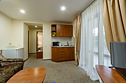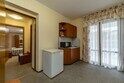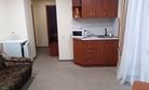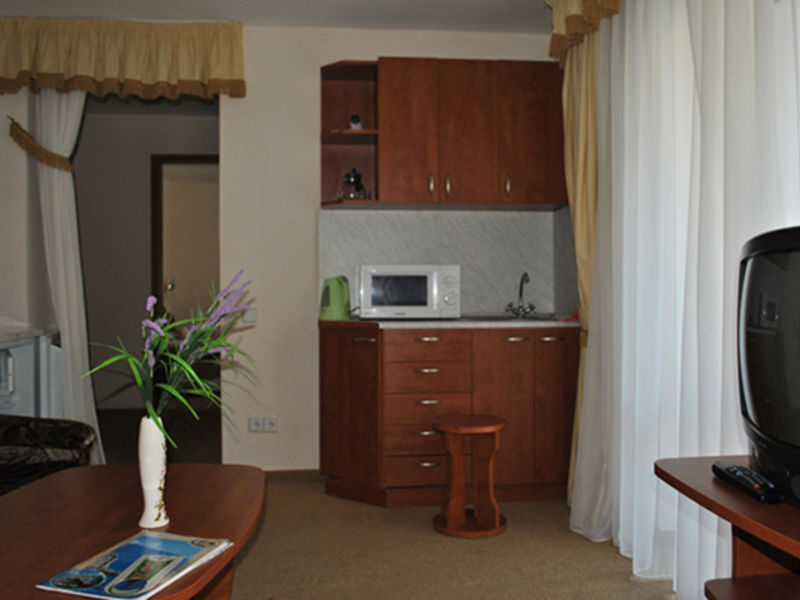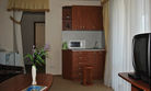 Сам номер же (402) более-менее нормальный. Вполне свежая мебель. Нормальный кухонный уголок с чайником и микроволновкой. Для большой семьи вполне подходит. Но и тут проблема с шумом - под дверью номера всегда сидит обслуга и слышит все, что вы говорите в своем номере... И вы их слышите... Как-то не очень удобно...