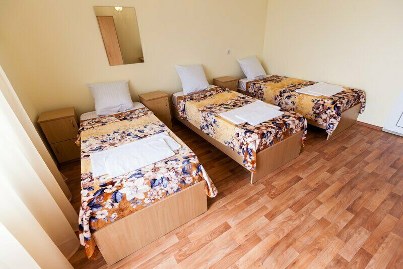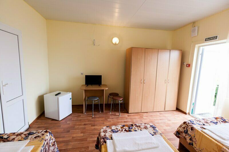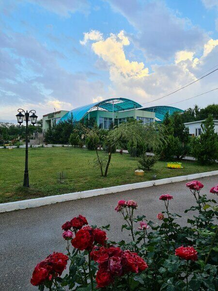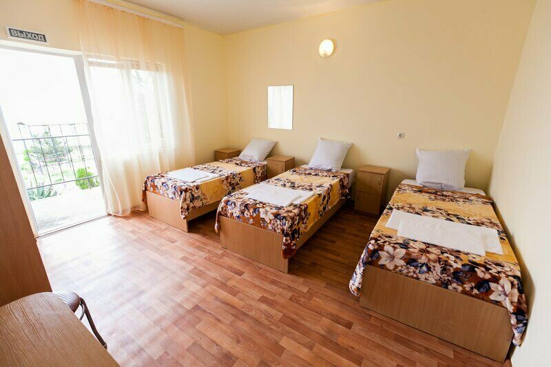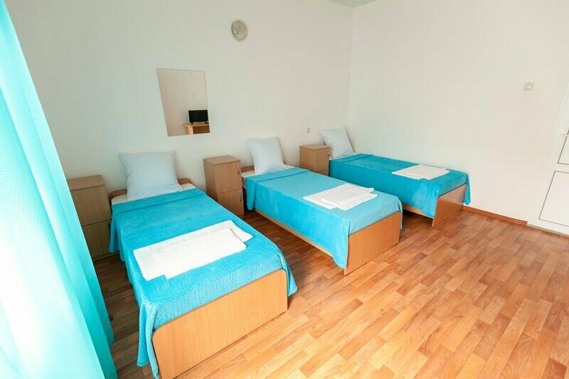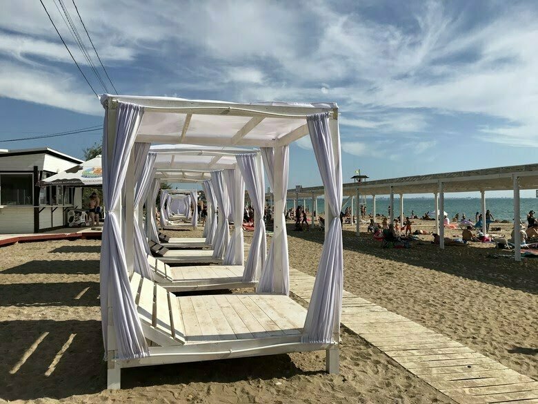Тип пляжа: песчано-галечныйПесчано–галечный с плавным заходом в море, 5–10 минут пешком от пансионата. На пляже есть раздевалки, душевые, туалет, кафе, магазины, столовая, детские игровые центры, салон красоты, аптека и т.д.