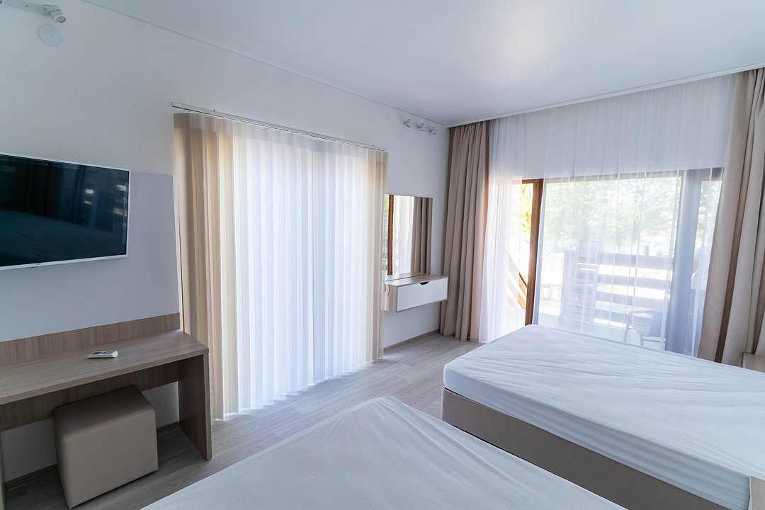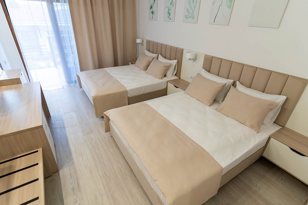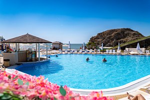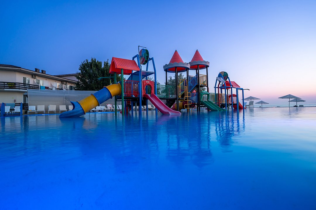 Преимущество отеля — роскошный песчаный пляж с бассейном и лаундж-зоной, детским аквапарком и водной горкой для всей семьи. Плавный заход в море, что удобно как детям, так и взрослым.
