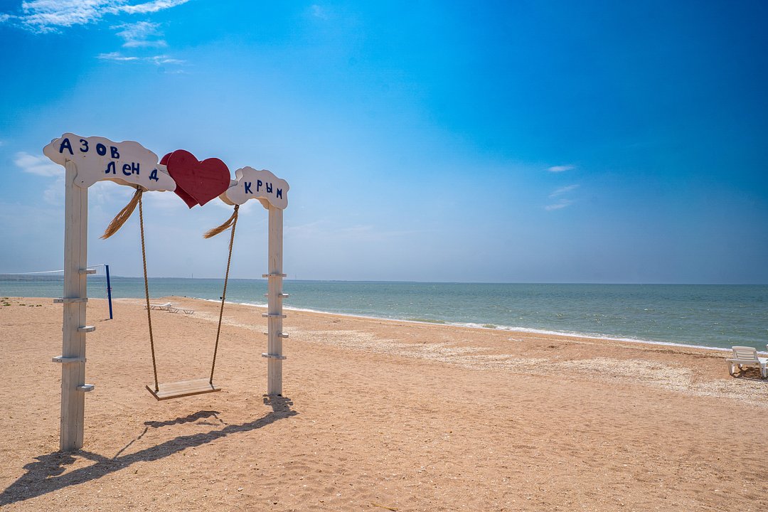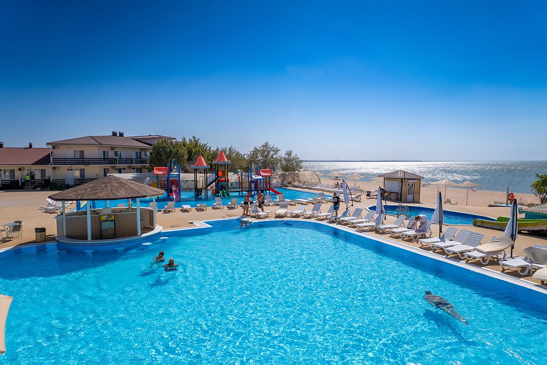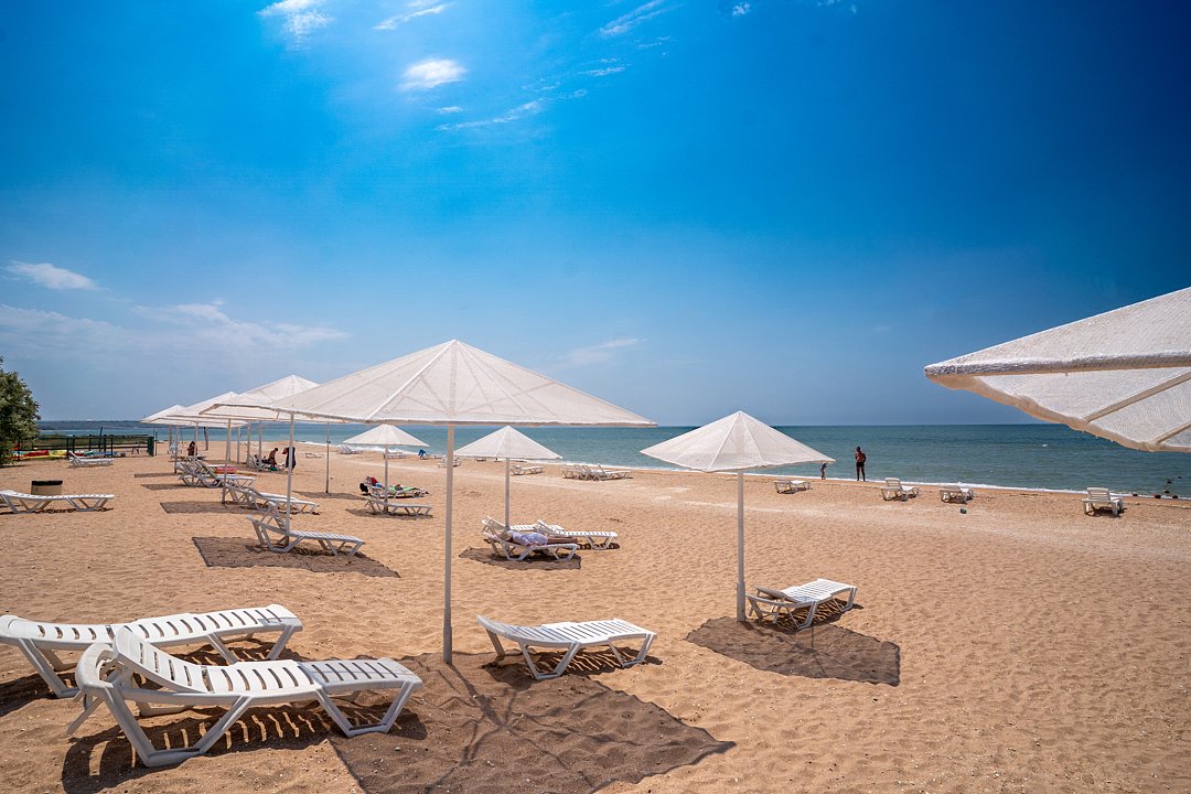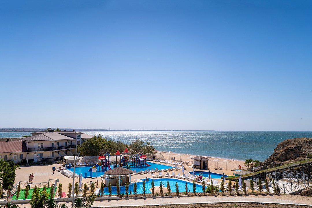 Семейный отель «АзовЛенд» расположен на самом берегу Азовского моря в 40 км от Керчи вблизи легендарных Генеральских пляжей.