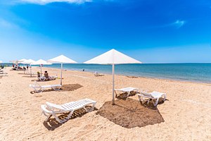 Обустроенный пляж с лежаками, навесом и зонтиками (в 30 м от отеля).