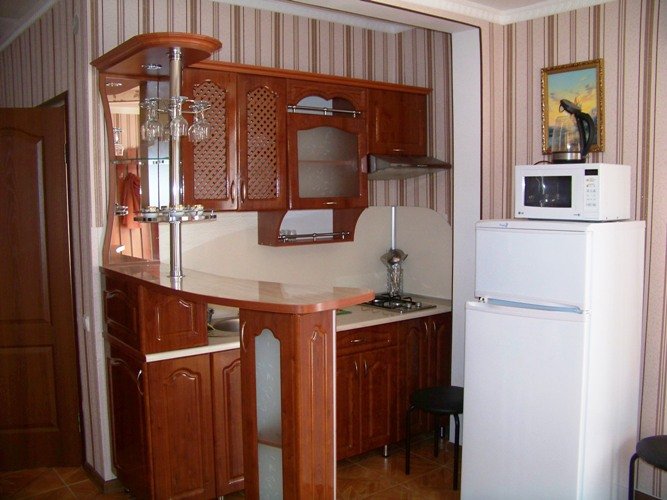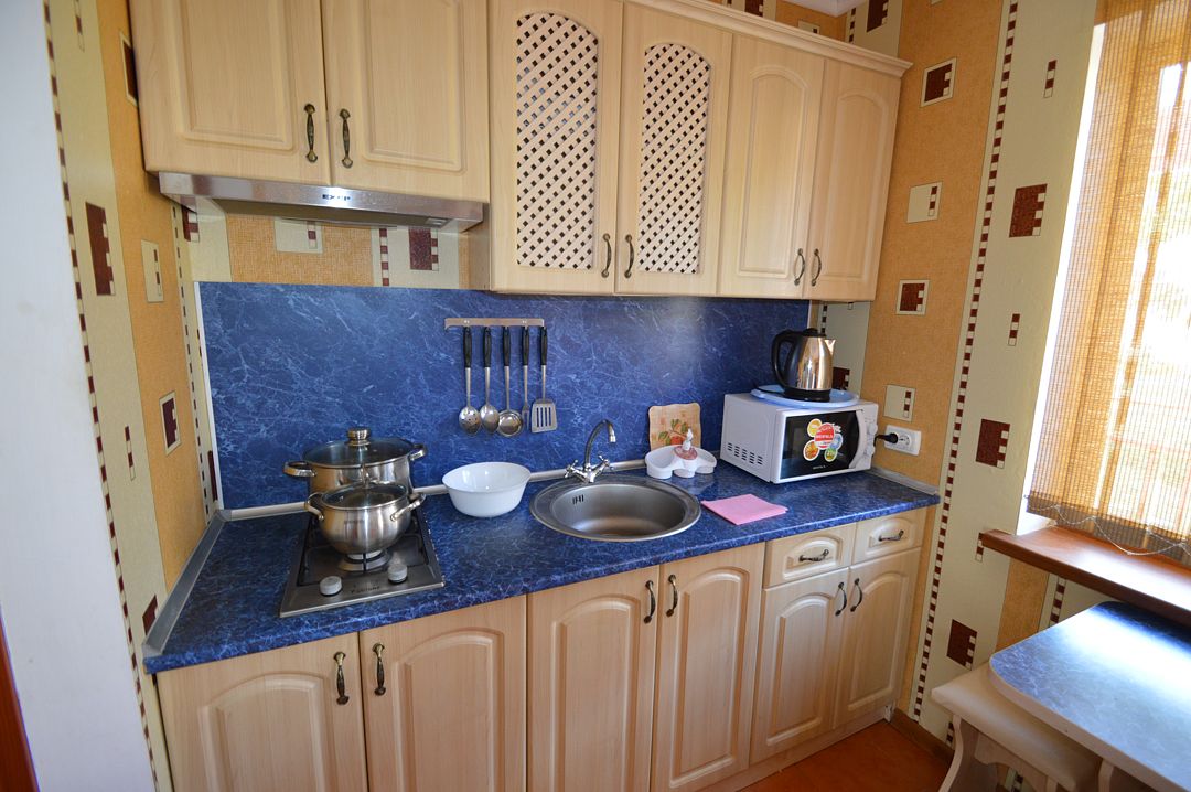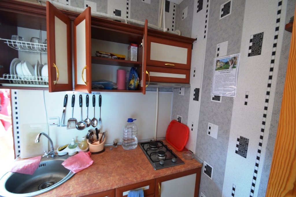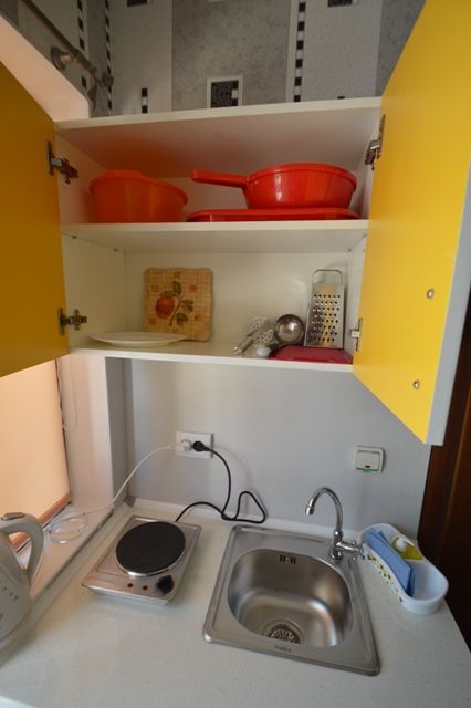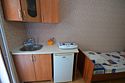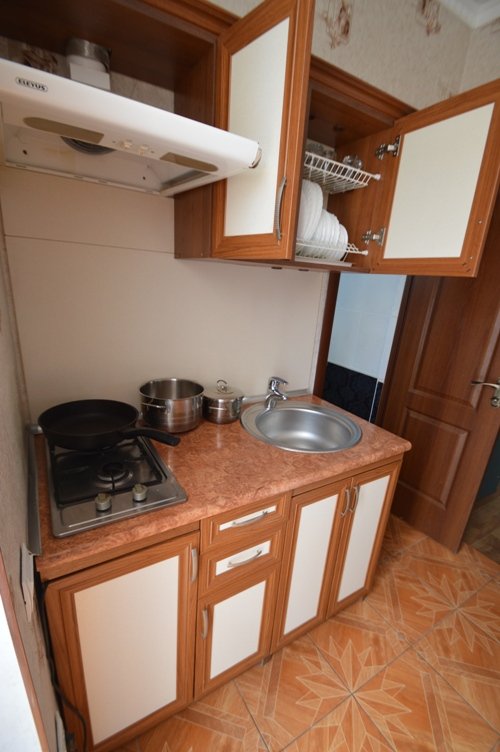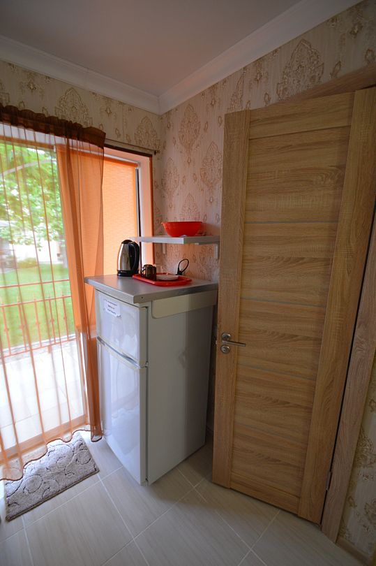 В номере есть мини-кухня, набор посуды необходимой для приготовления пищи, холодильник, электрочайник.