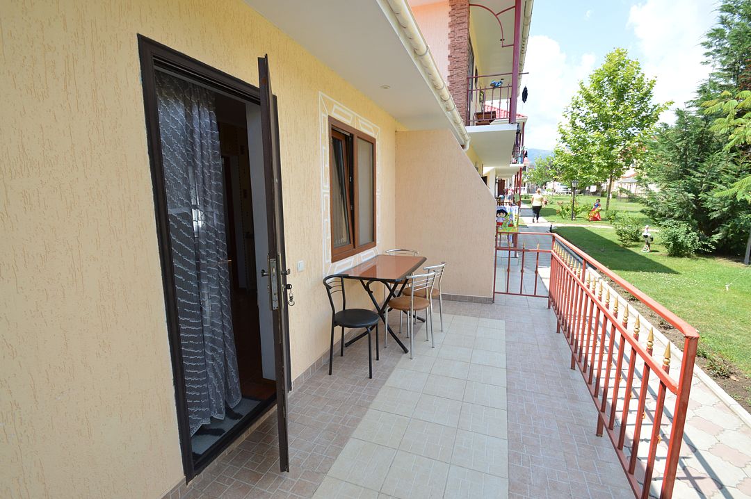 Номер на первом или втором этажах двухэтажных коттеджей. Перед номером на улице — столик, стулья.