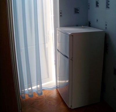 В прихожей находится холодильник, электрочайник, набор посуды, фен.