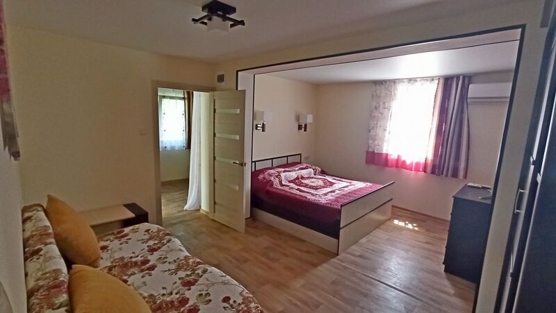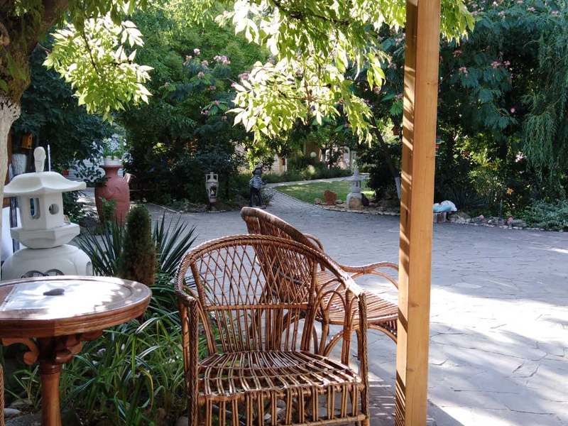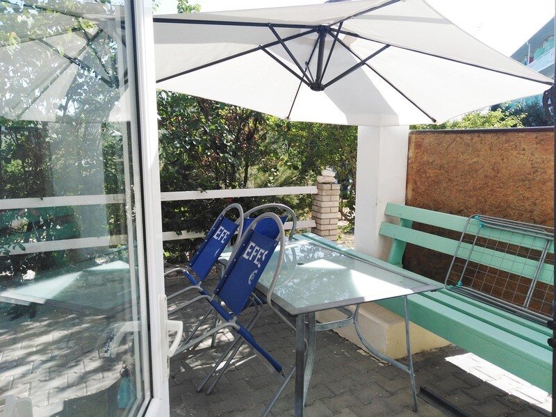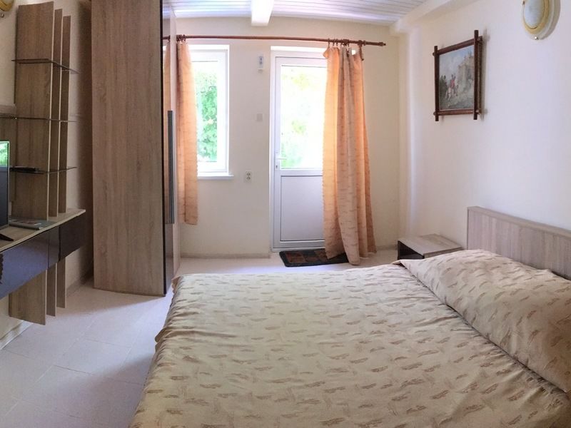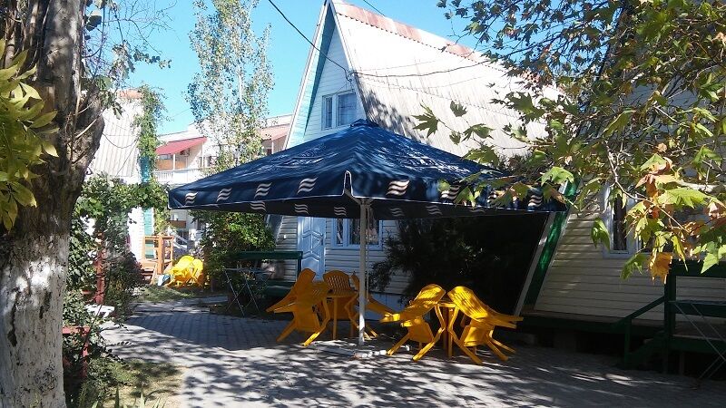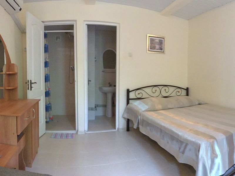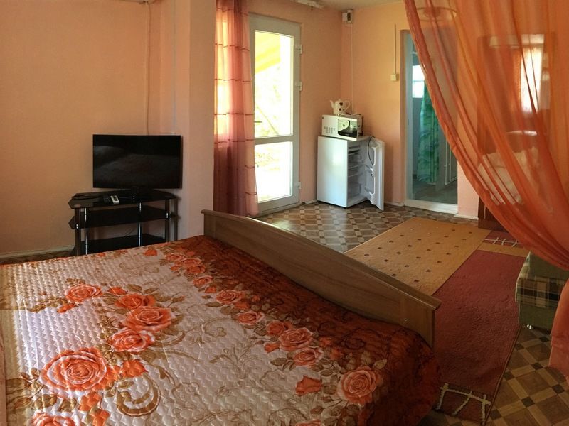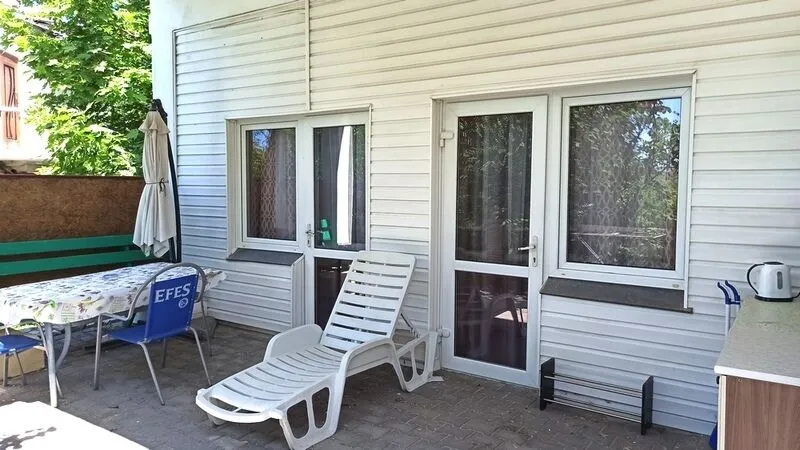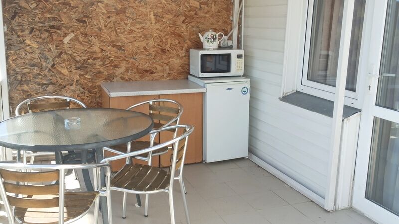 В доме: большой холл, холодильник, душ, туалет, телевизор. Перед домом площадка с летней мебелью для отдыха под большим зонтом. Дома на 7 основных мест, забронировать можно по тарифу до 5-ти основных мест. Смена белья и полотенец по графику, уборка в доме по требованию.