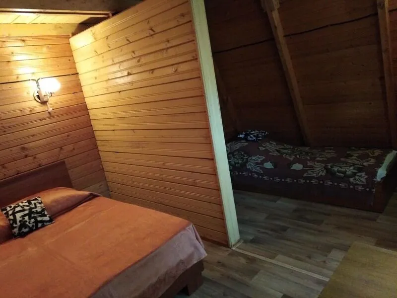 Двухэтажный дом из дерева с двумя 2-х местными спальнями на втором этаже и одной 3-х местной на первом.