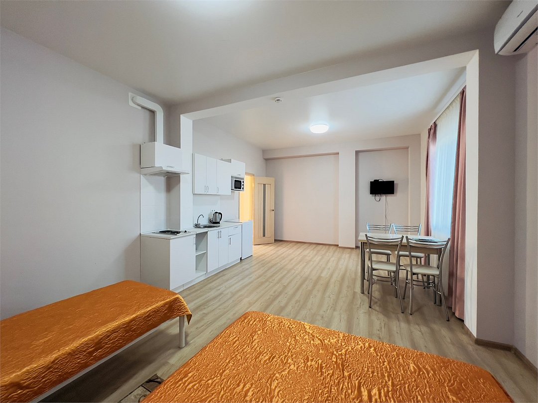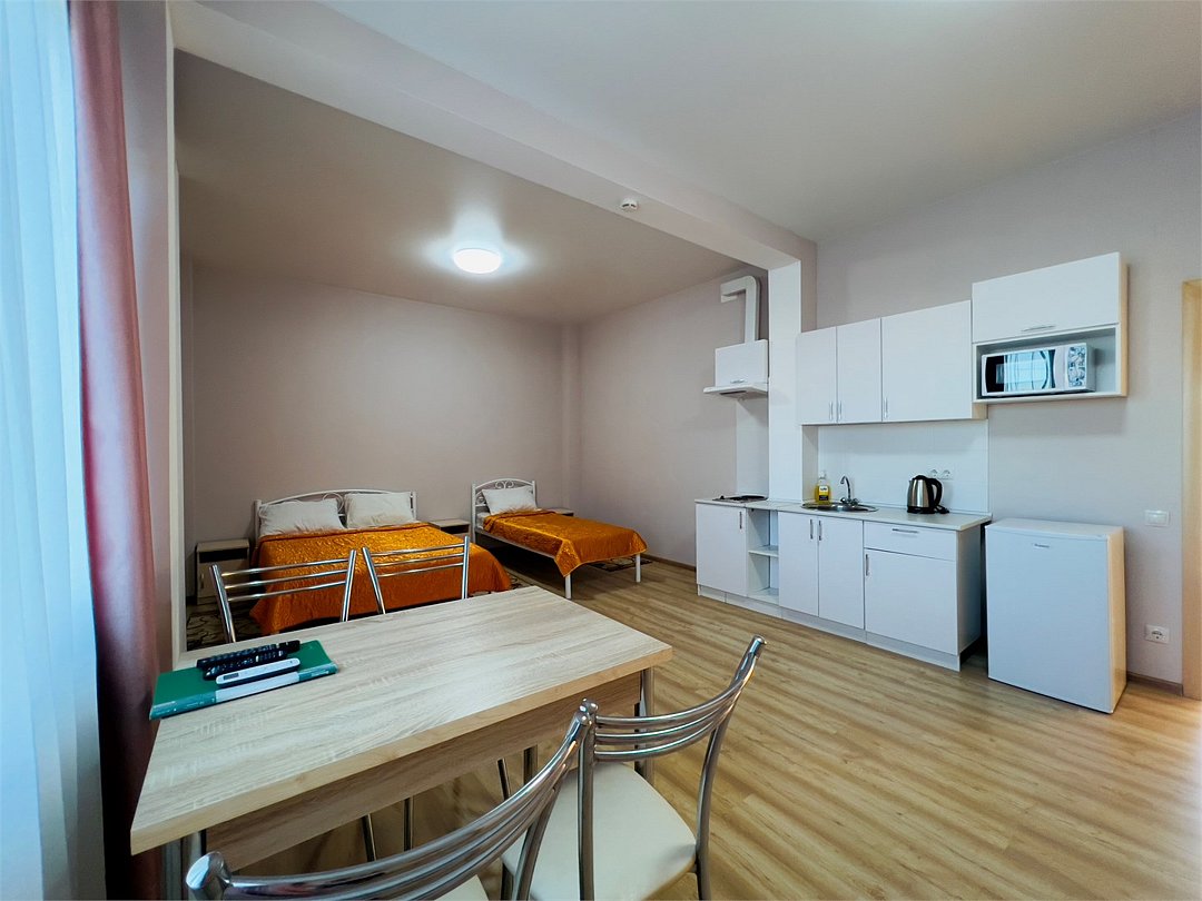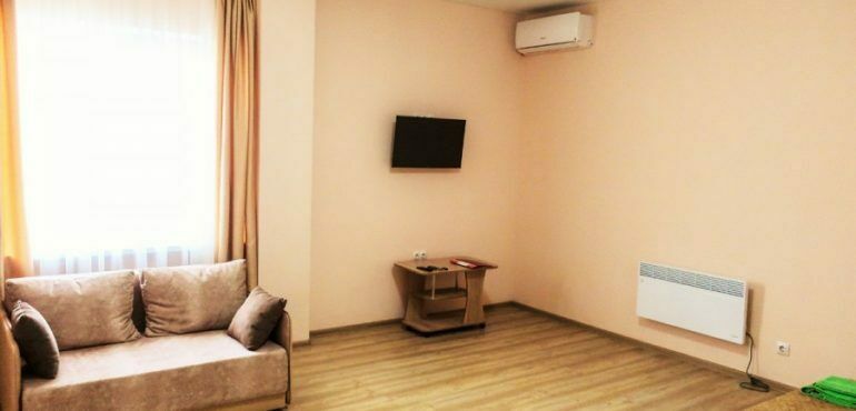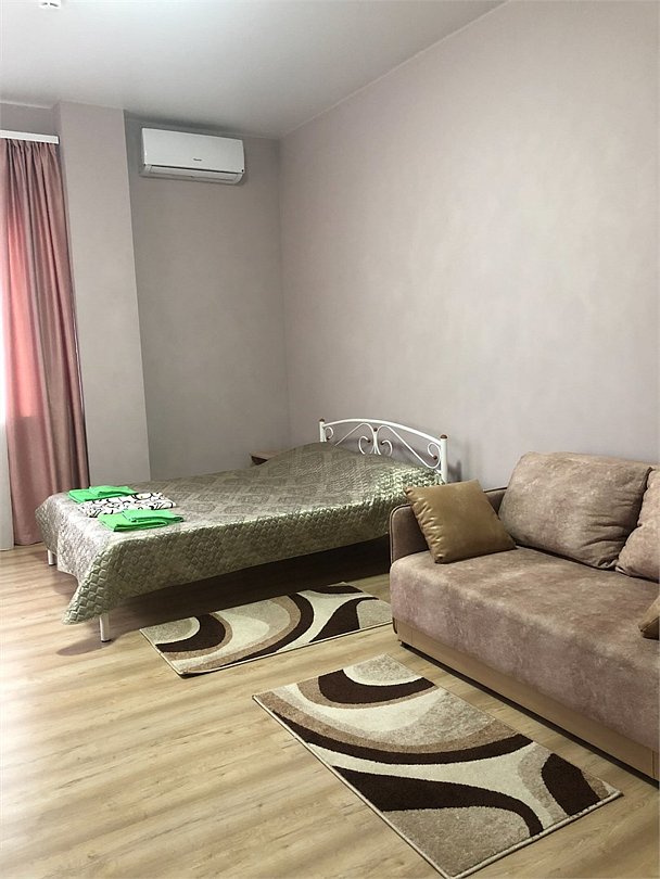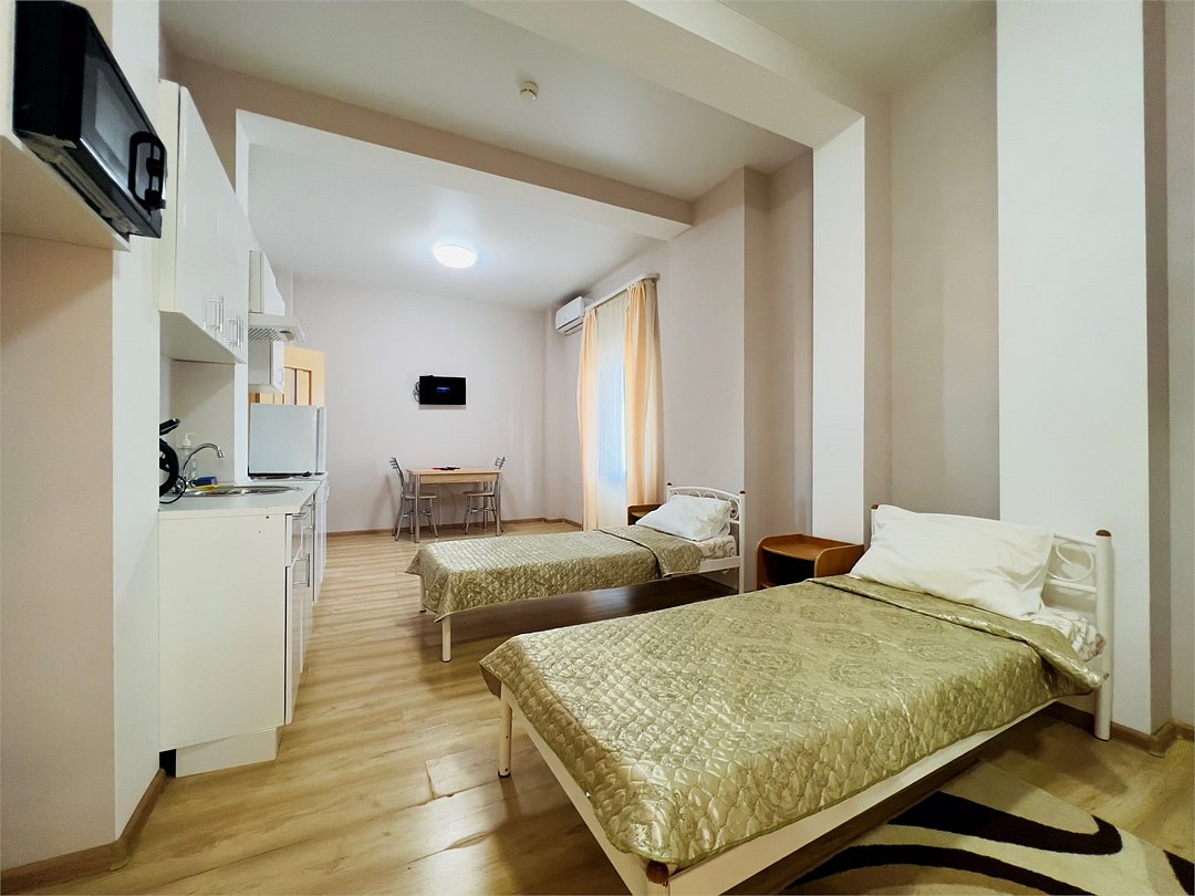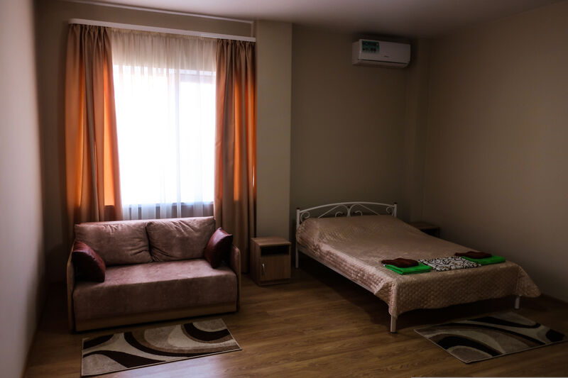 Просторные двухместные номера - студия. Оборудованы всем необходимым для комфортного проживания. Спальная зона и зона приготовления пищи находятся в одной комнате. В номере двуспальная кровать и диван. Душевая кабина, бойлер с горячей водой, кондиционер, стиральная машина. Дополнительные принадлежности Утюг, гладильная доска, фен, сушилка для белья, инвентарь для уборкиУслуги и удобства