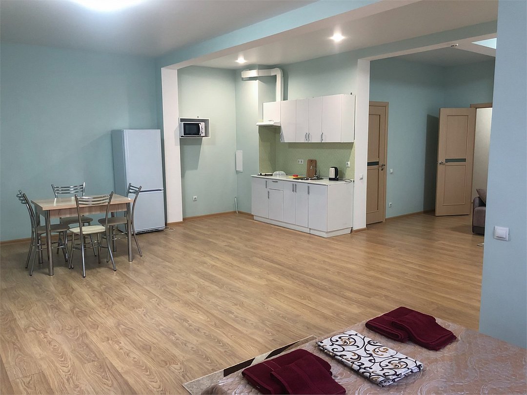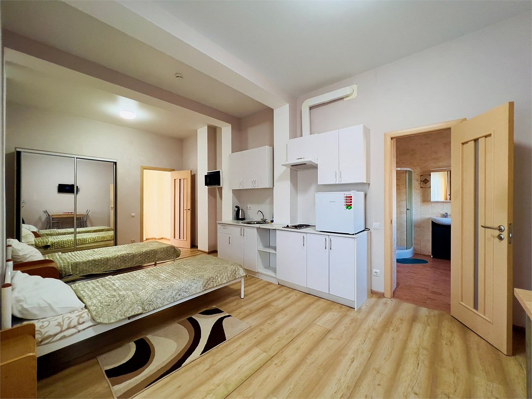 Просторные номера-студия расположены на 1-ом этаже и рассчитаны на проживание семьи до 6 человек. Спальная зона и зона приготовления пищи находятся в одной комнате. Дополнительное место — диван.Услуги и удобства