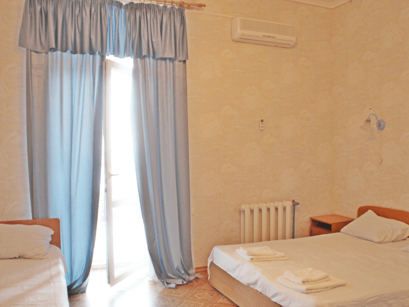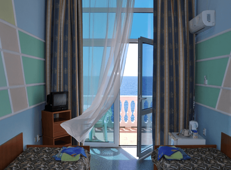 Номера в корпусе на берегу. Балконы с видом на море в каждом номере. В однокомнатном номере 2 односпальные кровати. S= 12,4 м2. Нет возможности размещения доп. места.