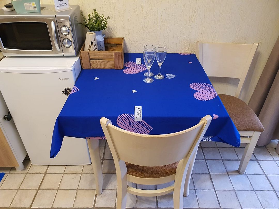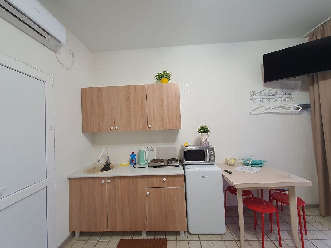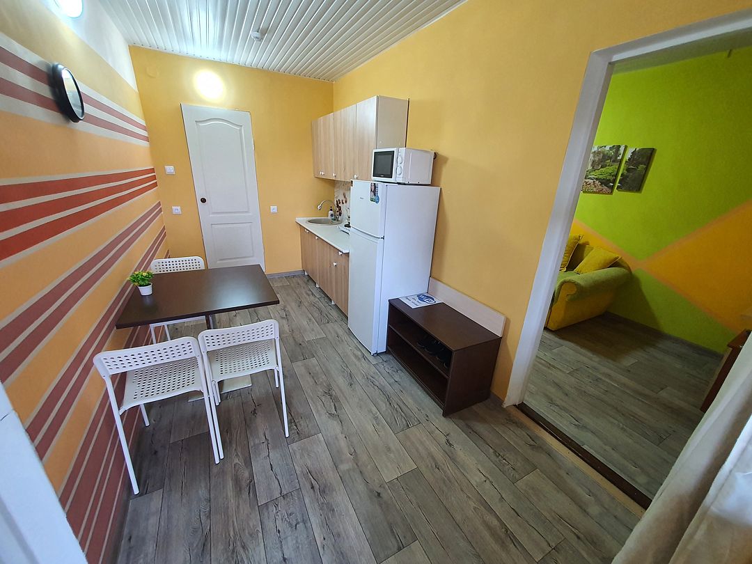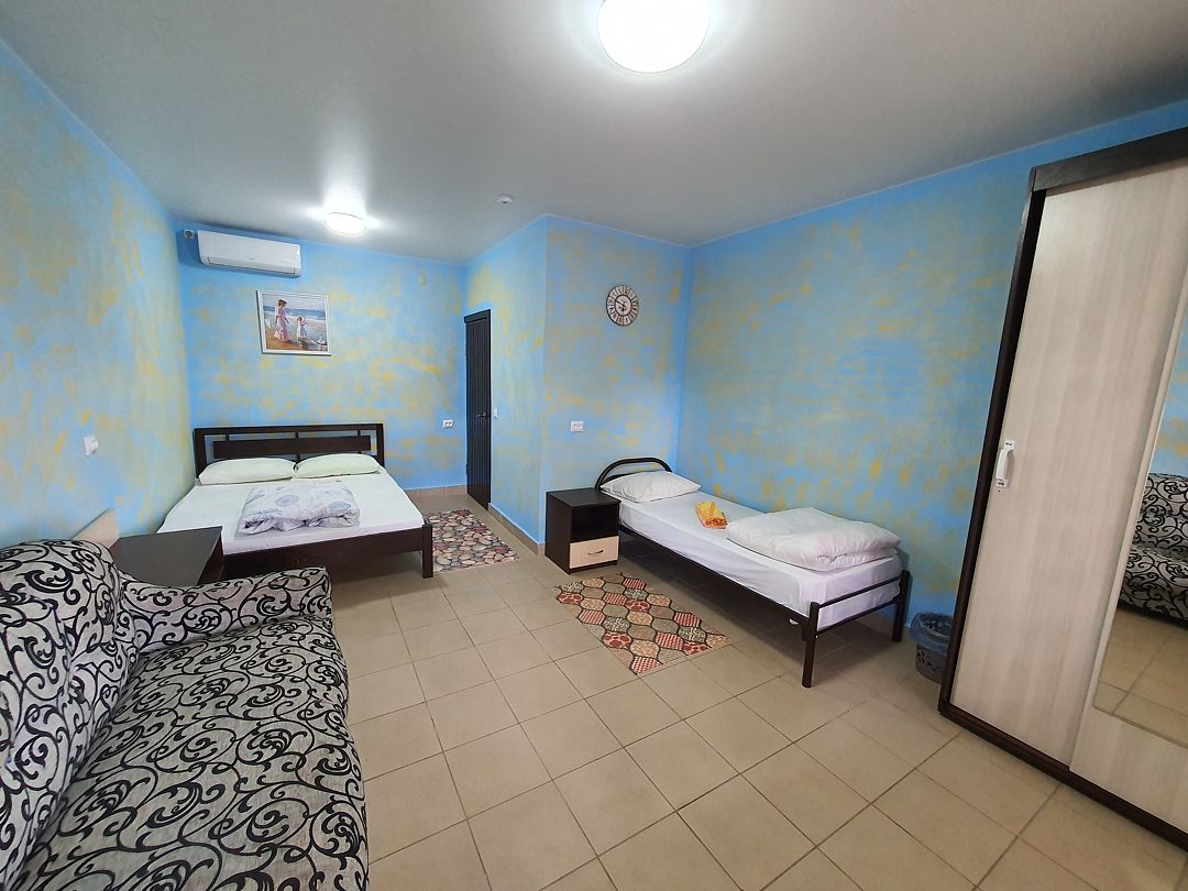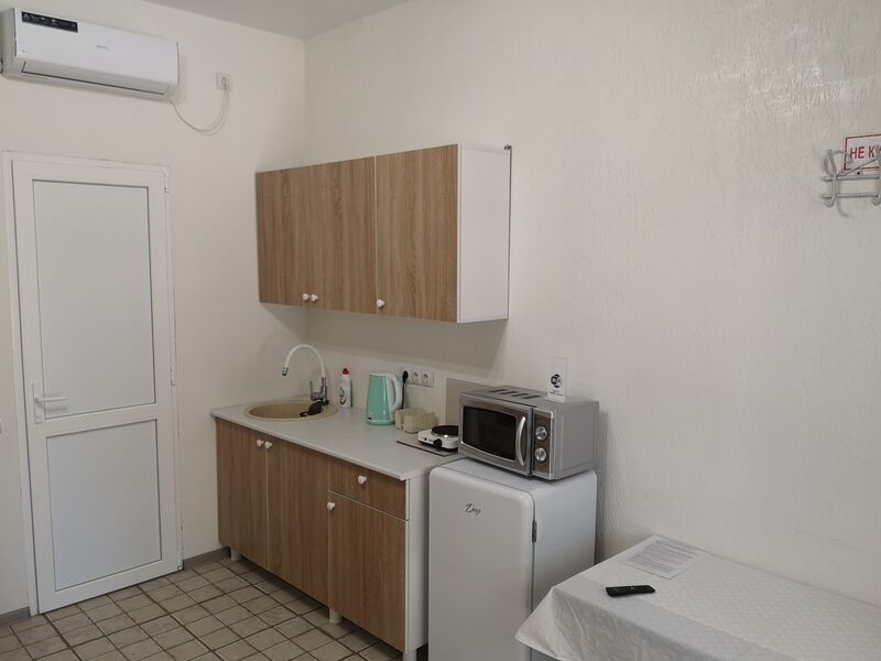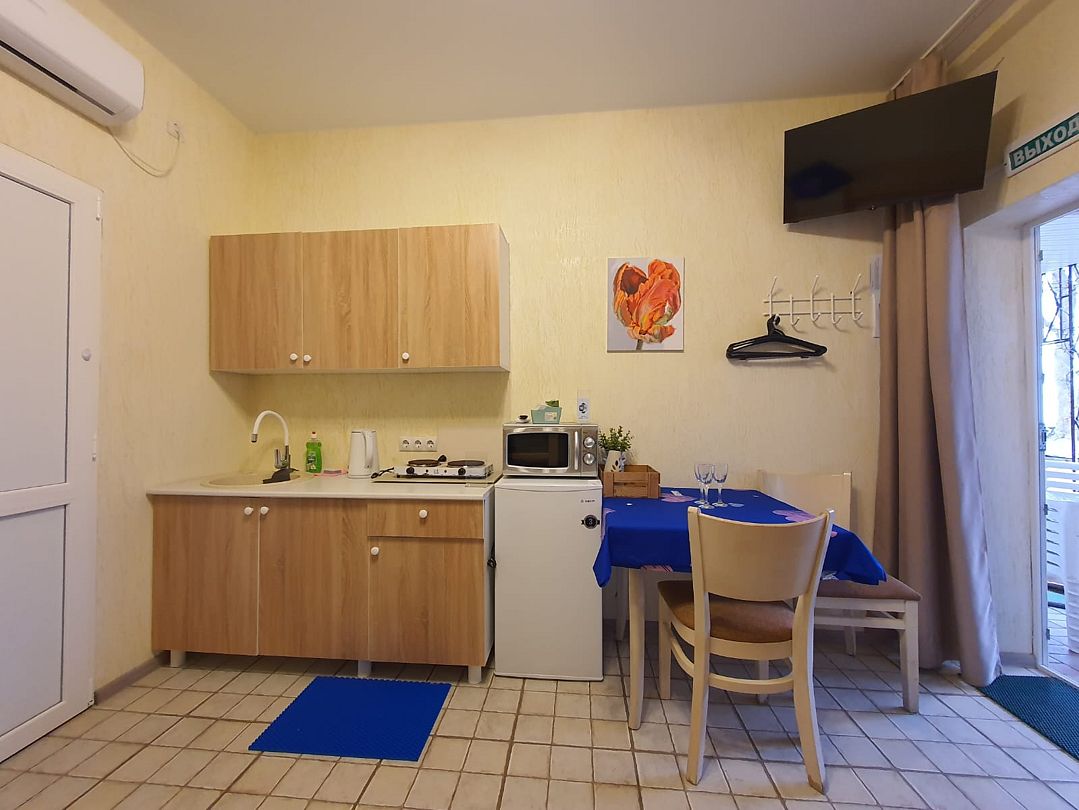 Просторный и уютный семейный номер идеально подходит для комфортного проживания семей с детьми. В номере есть всё необходимое для приятного отдыха и полноценного проживания. Описание номера: • Площадь: 20 кв. м. • Вместимость: до 4 человек. • Мебель: двуспальная кровать, диван-кровать, шкаф для одежды, письменный стол, стулья. • Техника: телевизор, холодильник, плита, микроволновая печь, чайник. • Ванная комната: душ, туалет, раковина, полотенца, косметические принадлежности. • Кухня: оборудована всем необходимым для приготовления пищи. • Терраса: просторная терраса с видом на море, где можно насладиться свежим воздухом и красивым видом. Семейный номер — это отличный выбор для тех, кто ценит комфорт и уют. Здесь вы сможете отдохнуть после насыщенного дня, приготовить любимые блюда и провести время в кругу семьи.