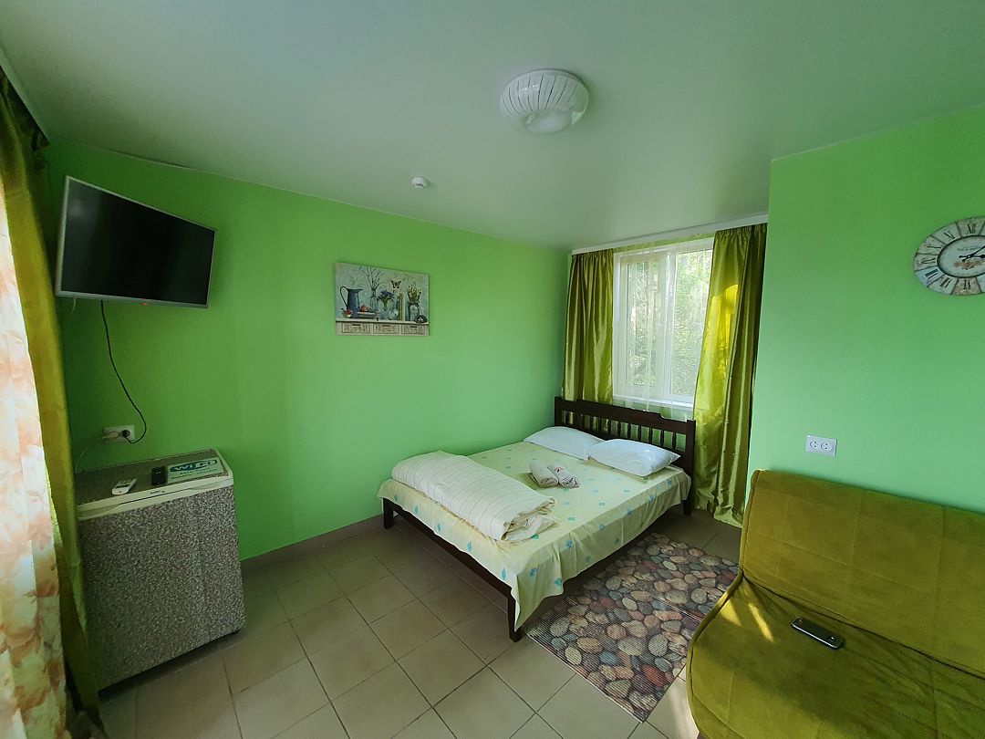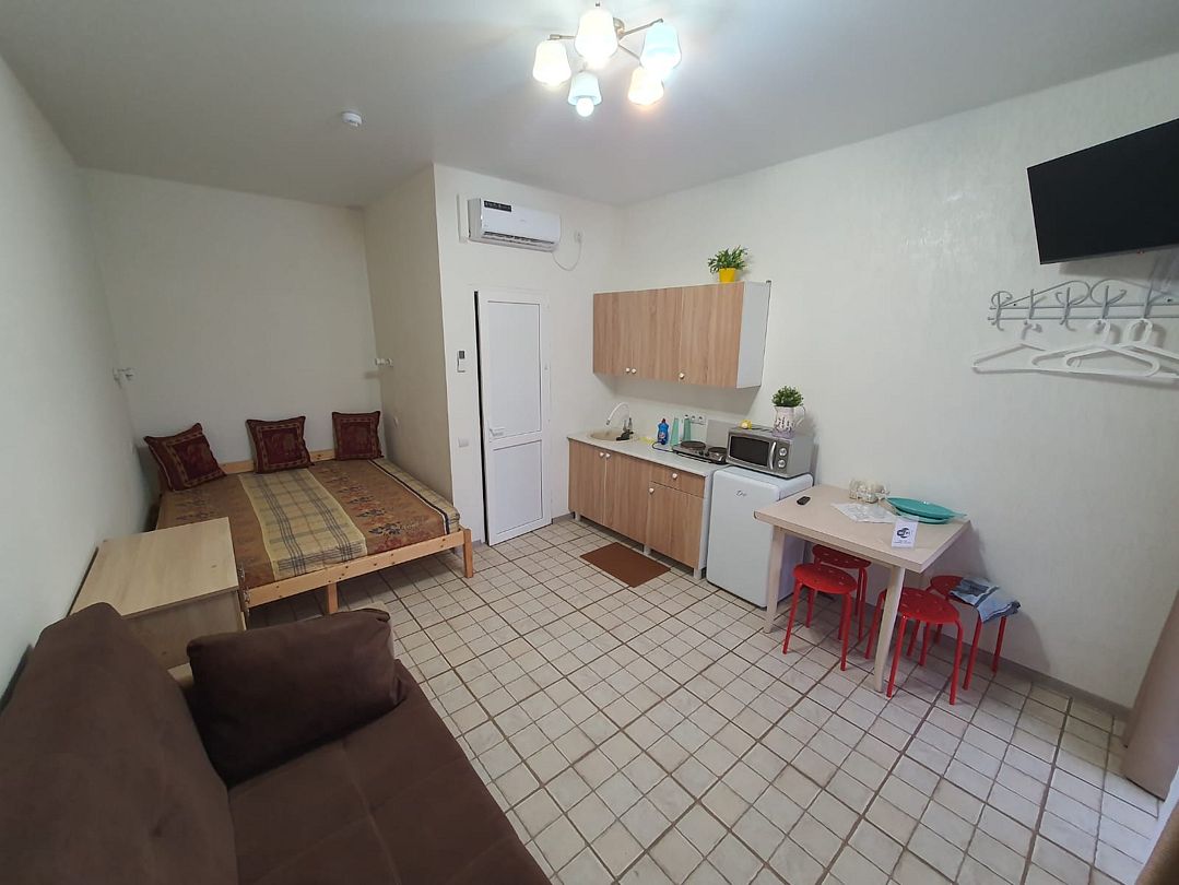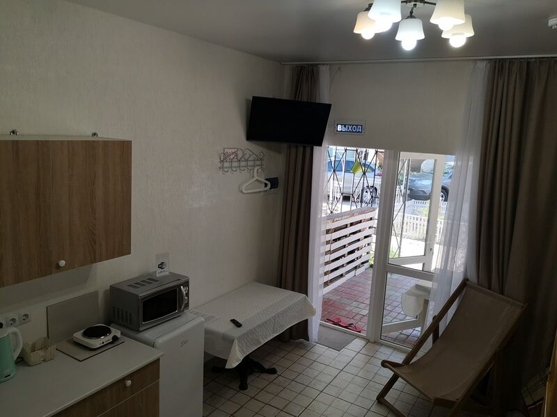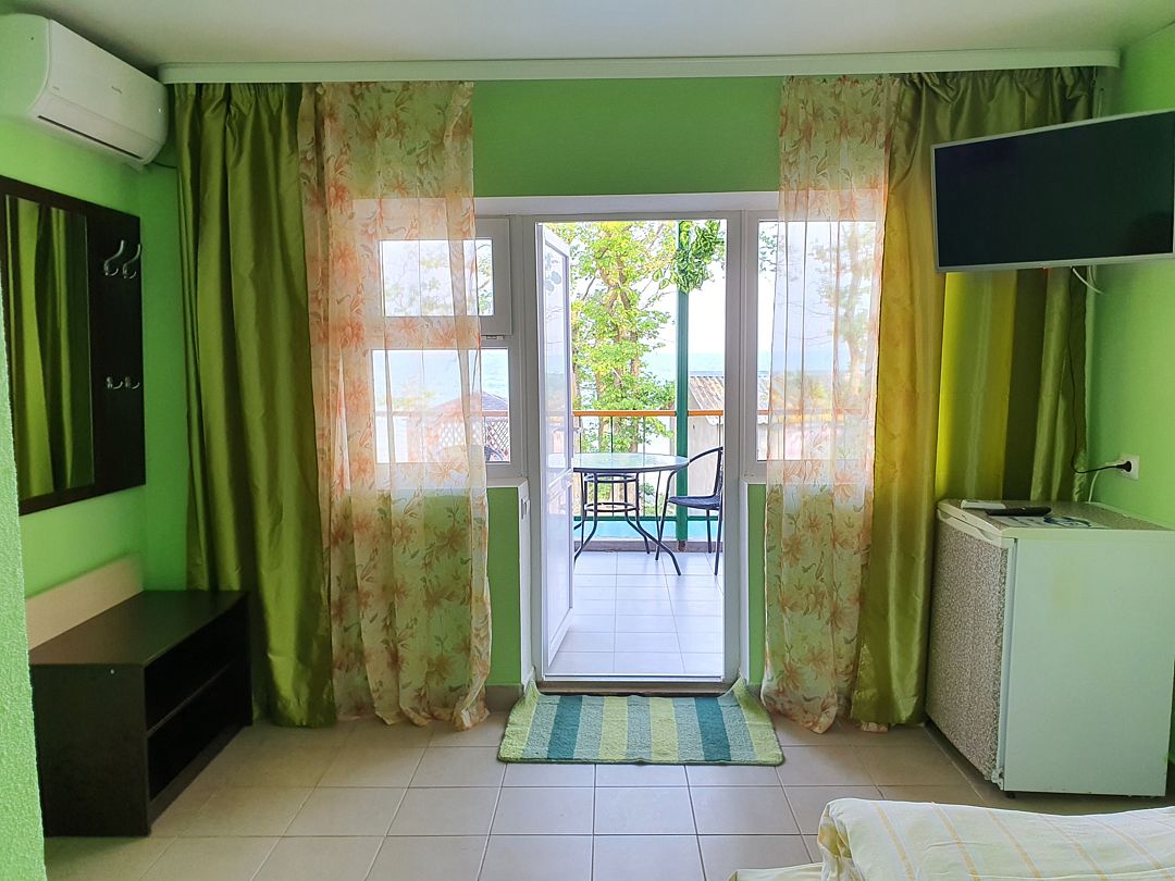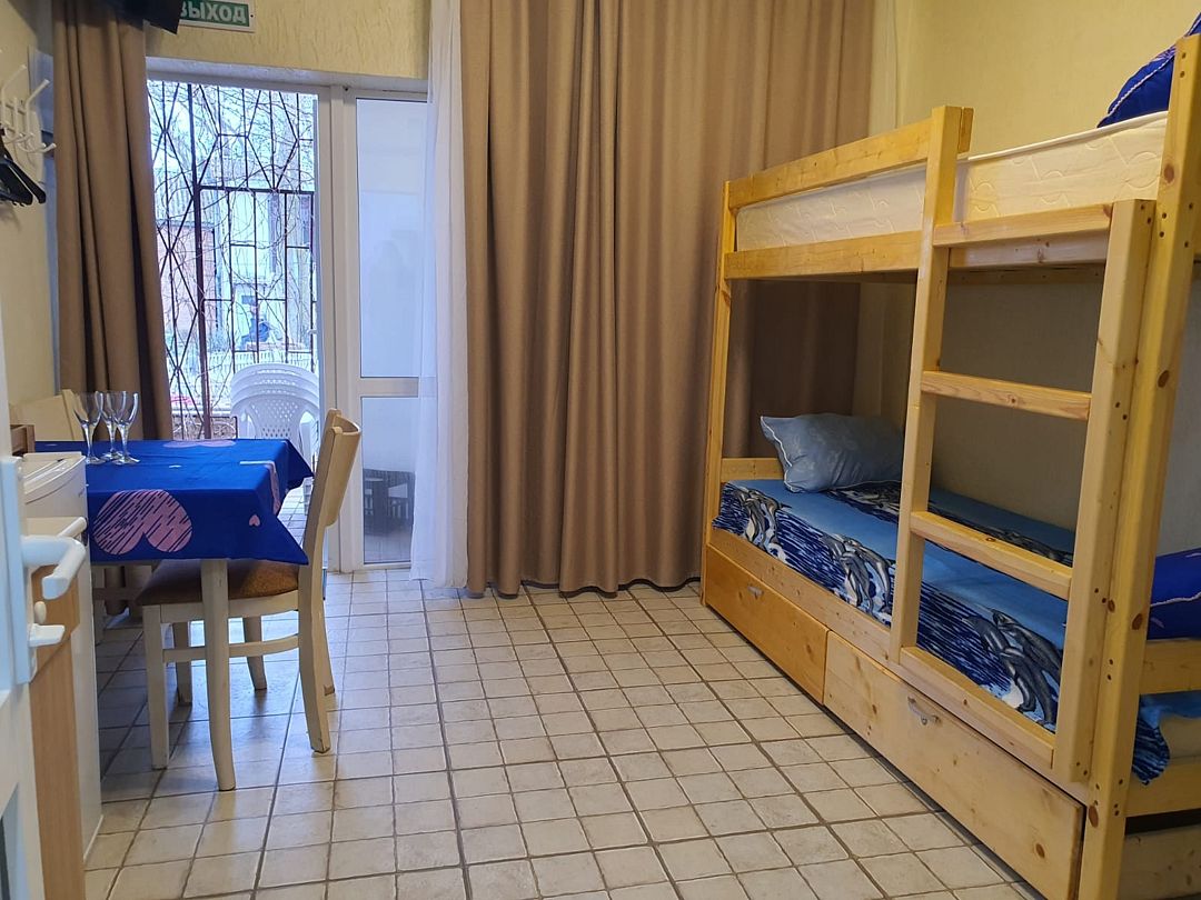 Уютный, светлый однокомнатный номер, площадью 18 кв.м. расположен на 2м этаже с красивым видом на море и Крымский мост. Номер содержит все необходимое для комфортного проживания и отдыха: ванной комнатой, шкафом для одежды, мини холодильником, LCD телевизором, кондиционером, бесплатным доступом к сети Интернет (WiFi), феном, электрочайником. Одним из достоинств этого номера являются большой просторный балкон с летней мебелью, что позволит отдыхать на свежем воздухе и любоваться красивым видом на море и корабли. Это отличный вариант для молодой пары или не большой семьи.