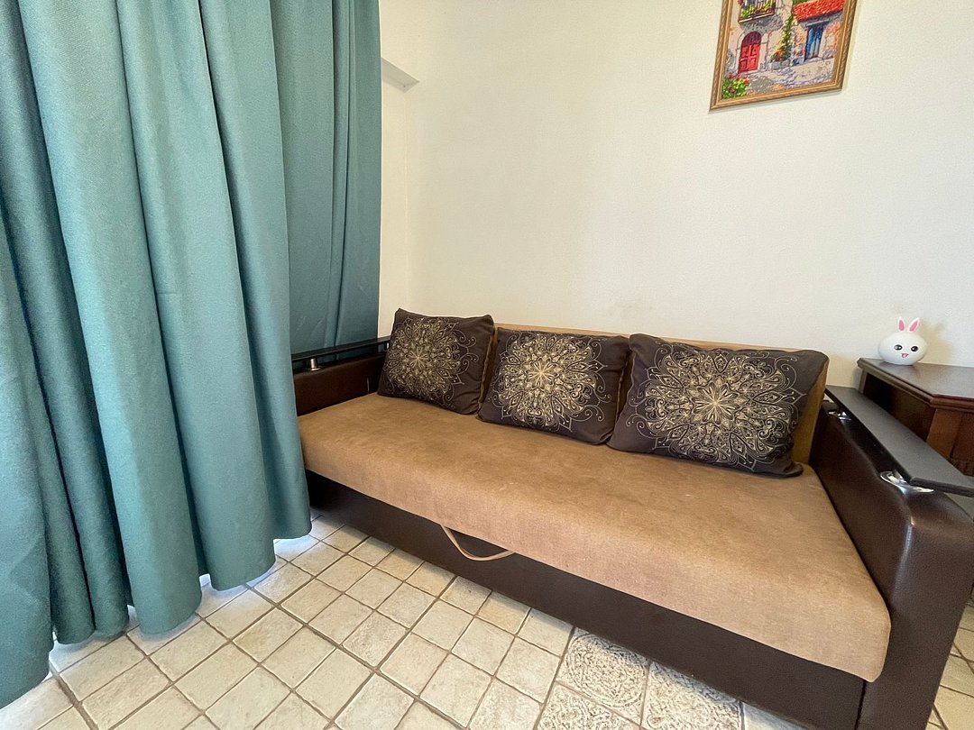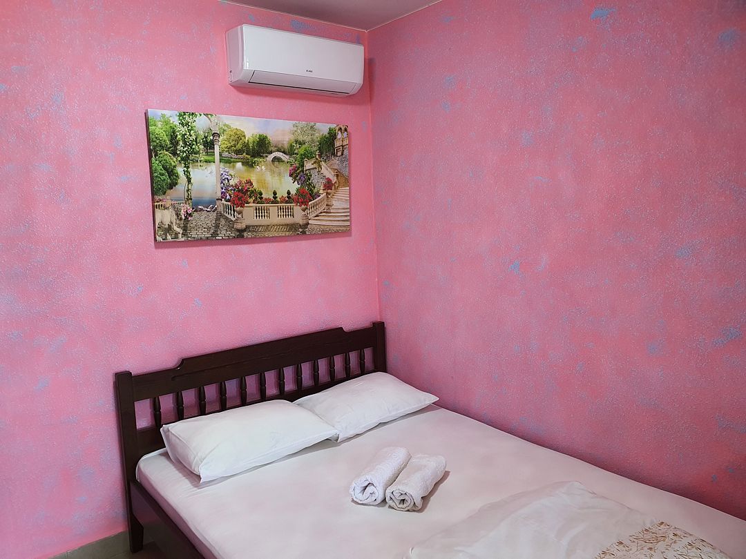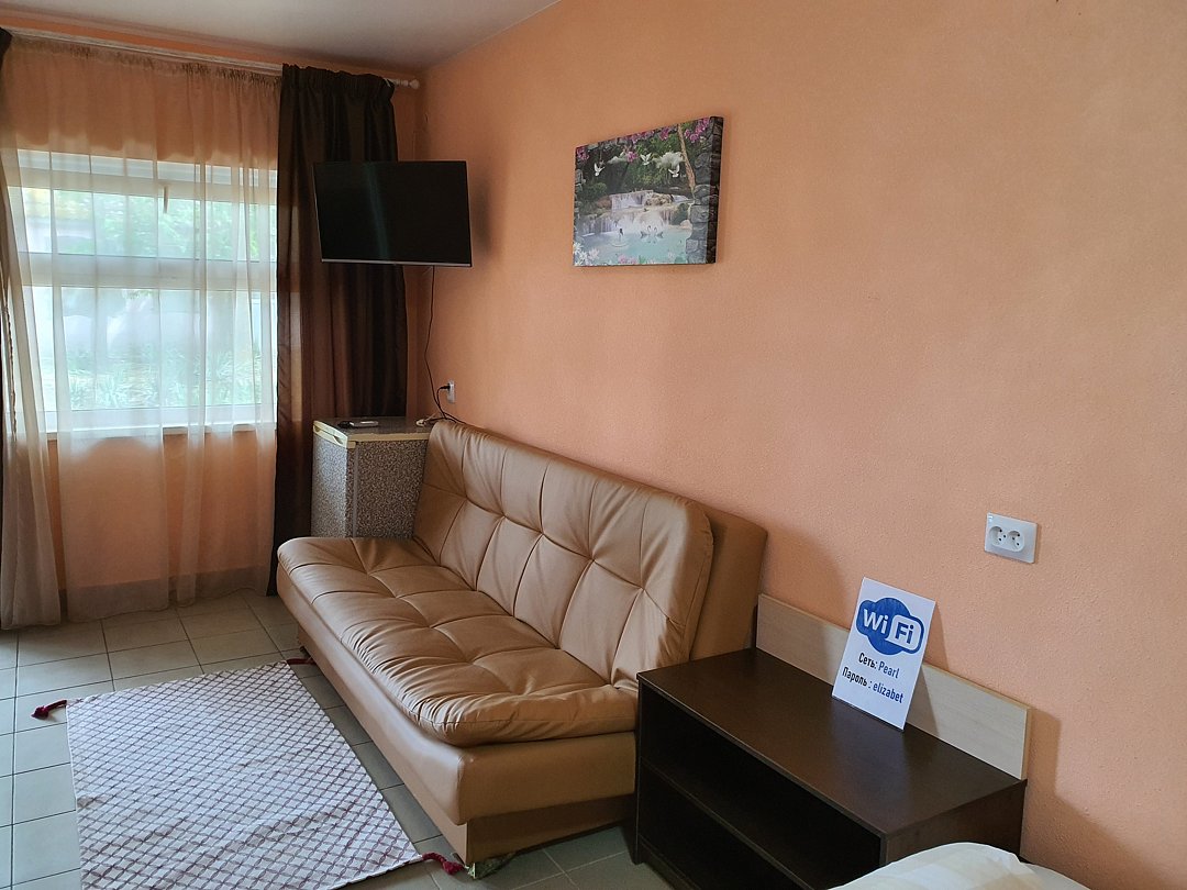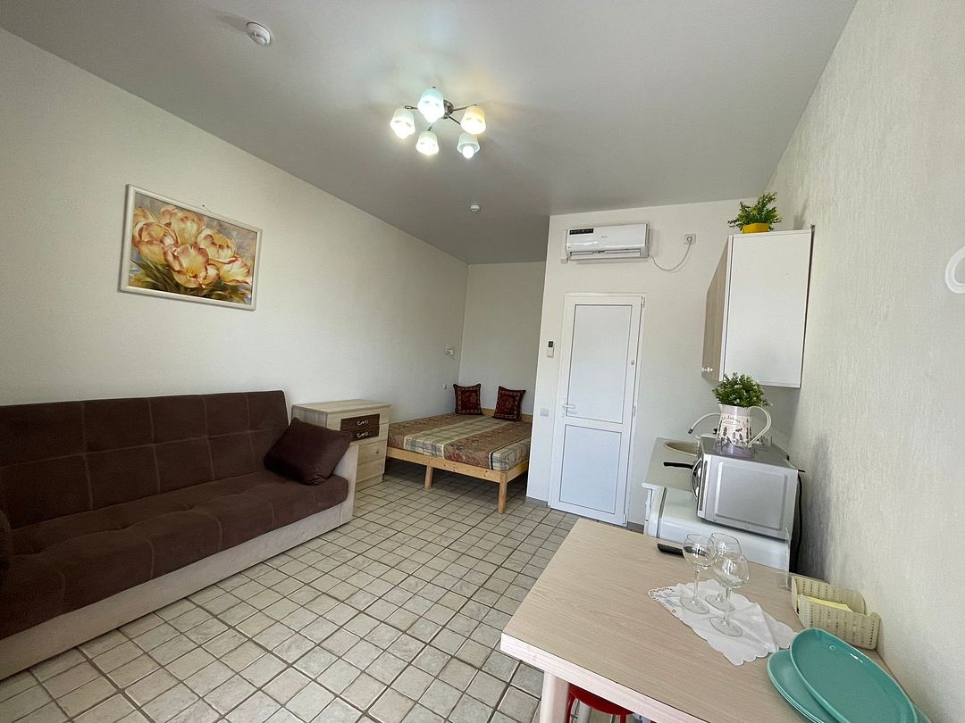 Уютный, светлый однокомнатный номер, площадью 18 кв.м. расположен на 2м этаже с красивым видом на море и Крымский мост. Номер содержит все необходимое для комфортного проживания и отдыха: ванной комнатой, шкафом для одежды, мини холодильником, LCD телевизором, кондиционером, бесплатным доступом к сети Интернет (WiFi), феном, электрочайником. Одним из достоинств этого номера являются большой просторный балкон с летней мебелью, что позволит отдыхать на свежем воздухе и любоваться красивым видом на море и корабли. Это отличный вариант для молодой пары или не большой семьи.