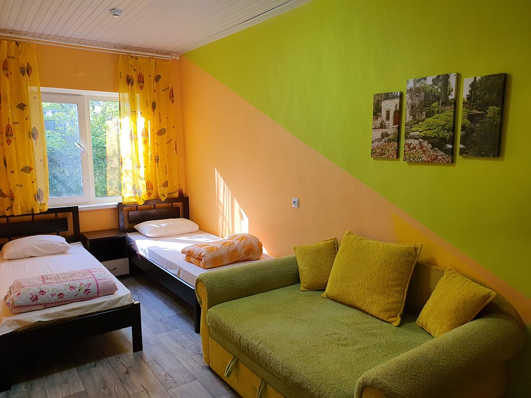 Просторный номер площадью 25 кв.м. рассчитан на комфортный отдых для семьи из 5 человек. Номер оснащен всем необходимым для комфортного отдыха: ванной комнатой, шкафом для одежды, мини холодильником, LCD телевизором, кондиционером, бесплатным доступом к сети Интернет (WiFi), феном, электрочайником. Отличное соотношение цена – качество позволит вам за относительно небольшие деньги получить максимум комфорта и удобств.