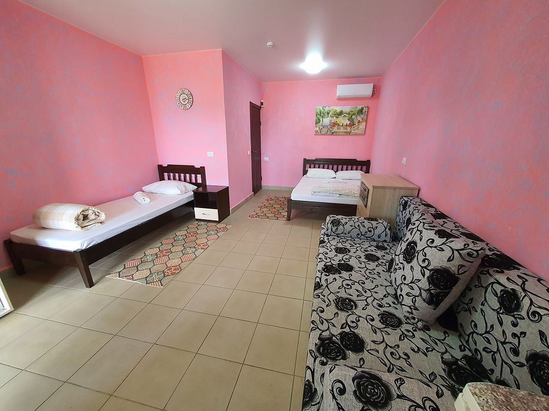 Просторный номер площадью 40 кв.м. состоящий из двух жилых комнат и гостиной, рассчитан на комфортный отдых для семьи из 7-8 человек или большой компании. Номер оснащен всем необходимым для комфортного отдыха: ванной комнатой, шкафом для одежды, мини холодильником, LCD телевизором, кондиционером, бесплатным доступом к сети Интернет (WiFi), феном, электрочайником. Это отличный вариант для тех, кто отправляется на отдых всей семьей или в компании друзей.
